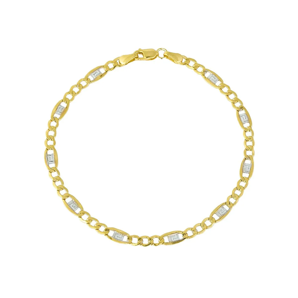 Złota bransoletka przenosi nas do tajemniczego kraju śródziemnomorskiego wypełnionego bohaterami starożytnych mitów greckich. Wszystko dzięki antycznemu wzorowi, który ozdabia biżuterię składającą się z łańcuszka o splocie figaro. Meander, czyli rodzaj ornamentu przypominającego labirynt symbolizuje wieczność i nieśmiertelność. Podaruj ten oryginalny dodatek osobie, która ceni sobie nieprzemijające piękno.