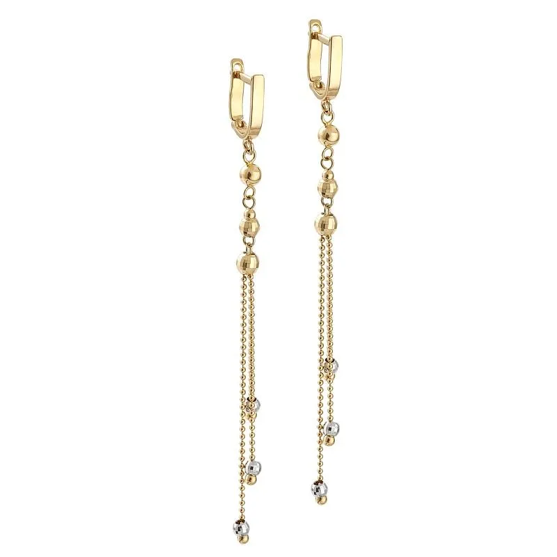 Kolczyki z angielskim zapięciem z ozdobnymi kuleczkami zostały wykonane z najwyższej jakości 14-karatowego złota. Niezwykle efektowny wzór podkreślono przez swobodnie wiszące kuleczki z białego złota. Kontrastowe wykończenie polerowanych kuleczek z białego i żółtego złota nadaje kolczykom dodatkowego uroku. Wzór stanowi idealny dodatek do kreacji dziennych i wieczorowych, dodając naturalnego piękna właścicielce.