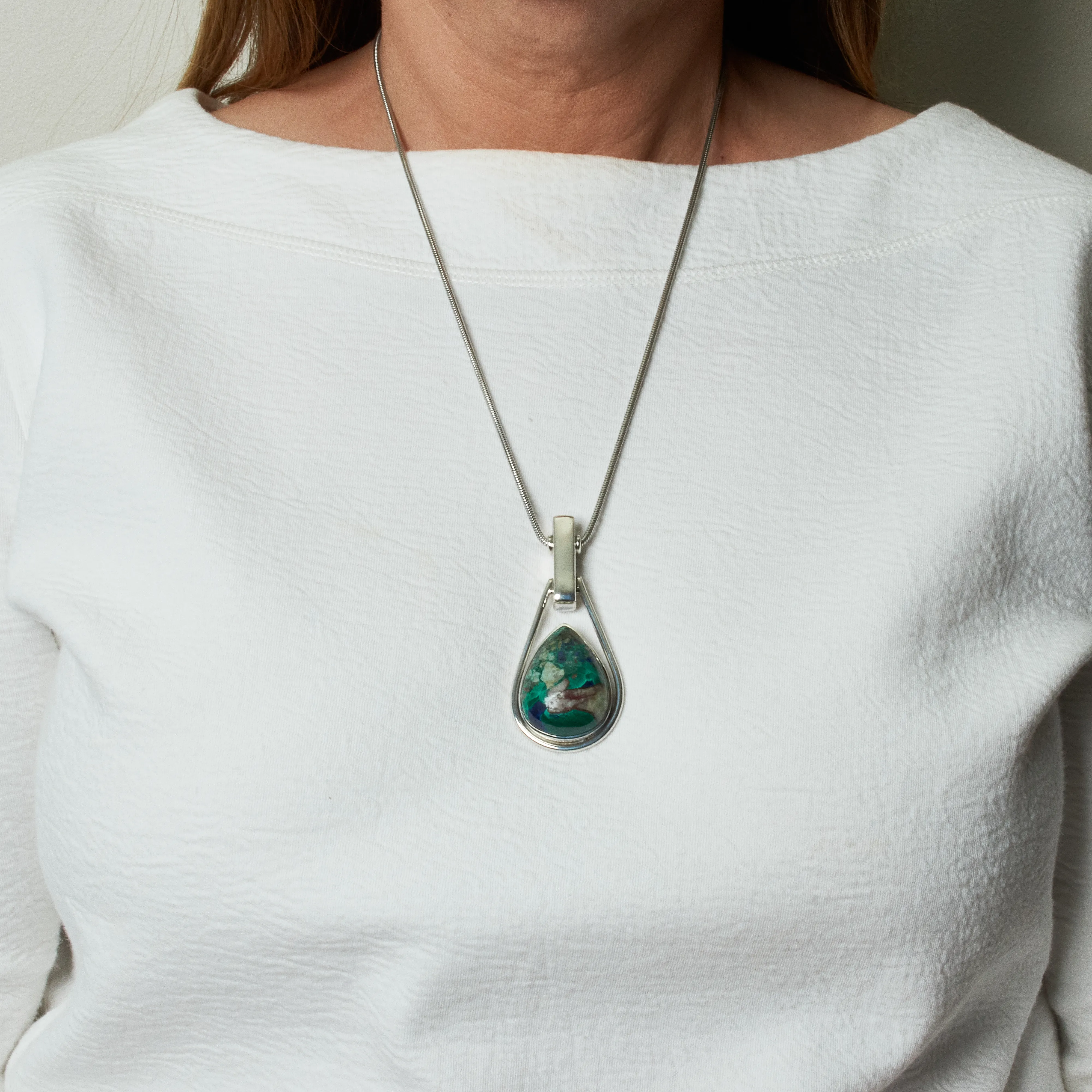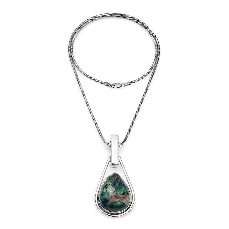 Sam kamień to kamień naturalny w odcieniach zieleni, beżów i błękitu, czyli kolorach ziemi. Uformowany na kształt łezki i osadzony w srebrnej oprawie wydobywa optymalnie swoje piękno, w pełni skupiając uwagę obserwujących na kamieniu. Naszyjnik posiada klasyczne, bezpieczne zapięcie i jest idealny na każdą okazję.