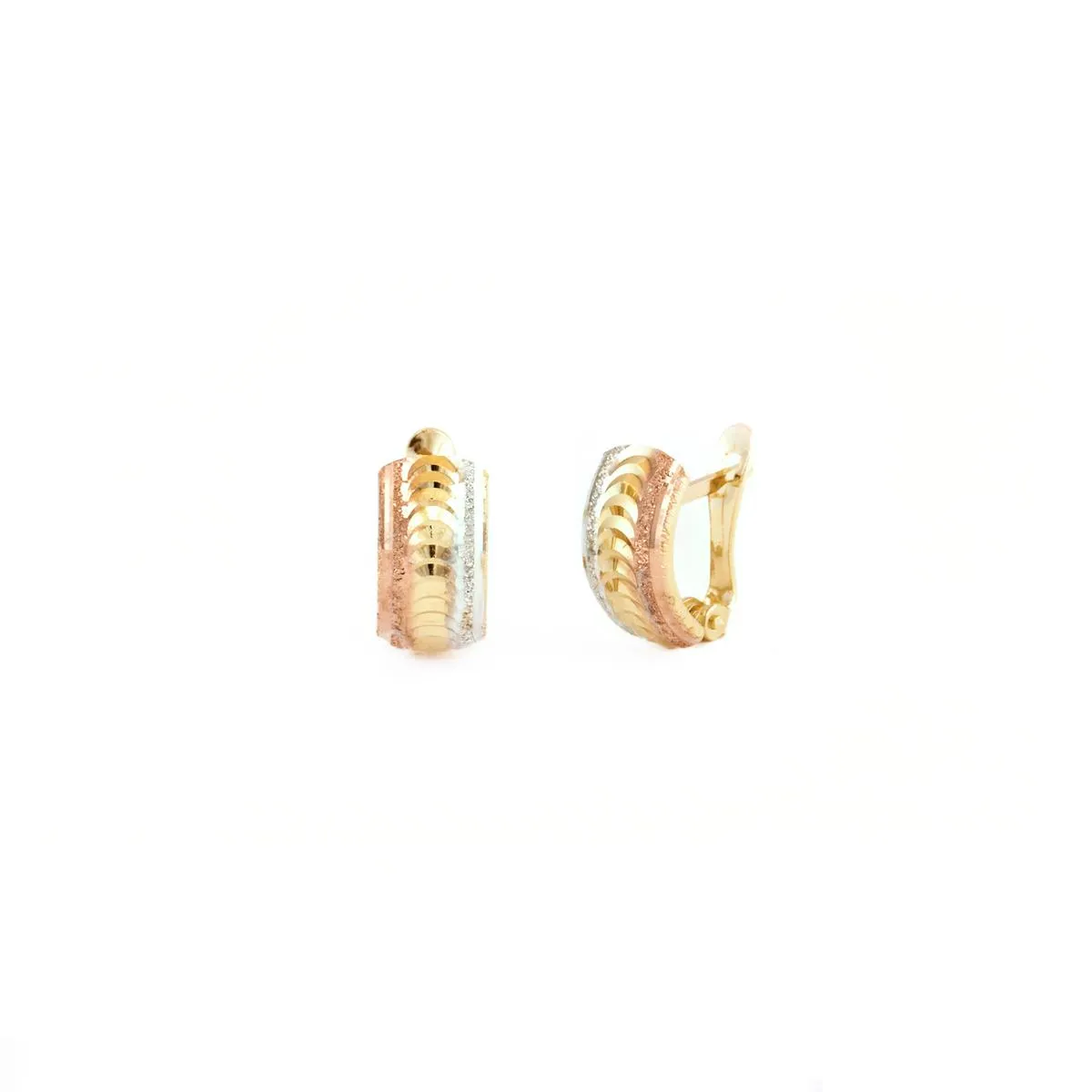 Złote kolczyki z angielskim zapięciem zostały stworzone z trzech kolorów złota: żółtego, różowego i białego, dzięki czemu pięknie mienią się na uszach i podkreślają kobiecą urodę. Wyrób charakteryzuje się wysoką precyzją i dokładnością wykonania, dlatego zauroczy każdą Panią i będzie niezapomnianym podarunkiem. Wygodne zapięcie jest gwarancją komfortu podczas użytkowania, a wzór idealnie dopełni zarówno codzienne jak i wieczorowe stroje.