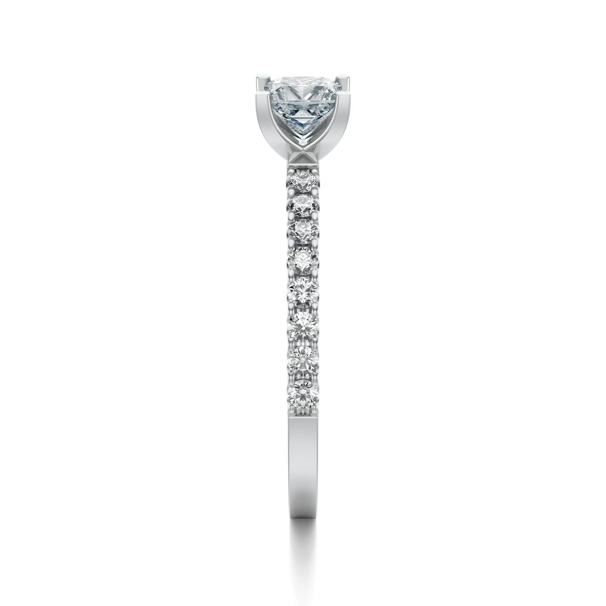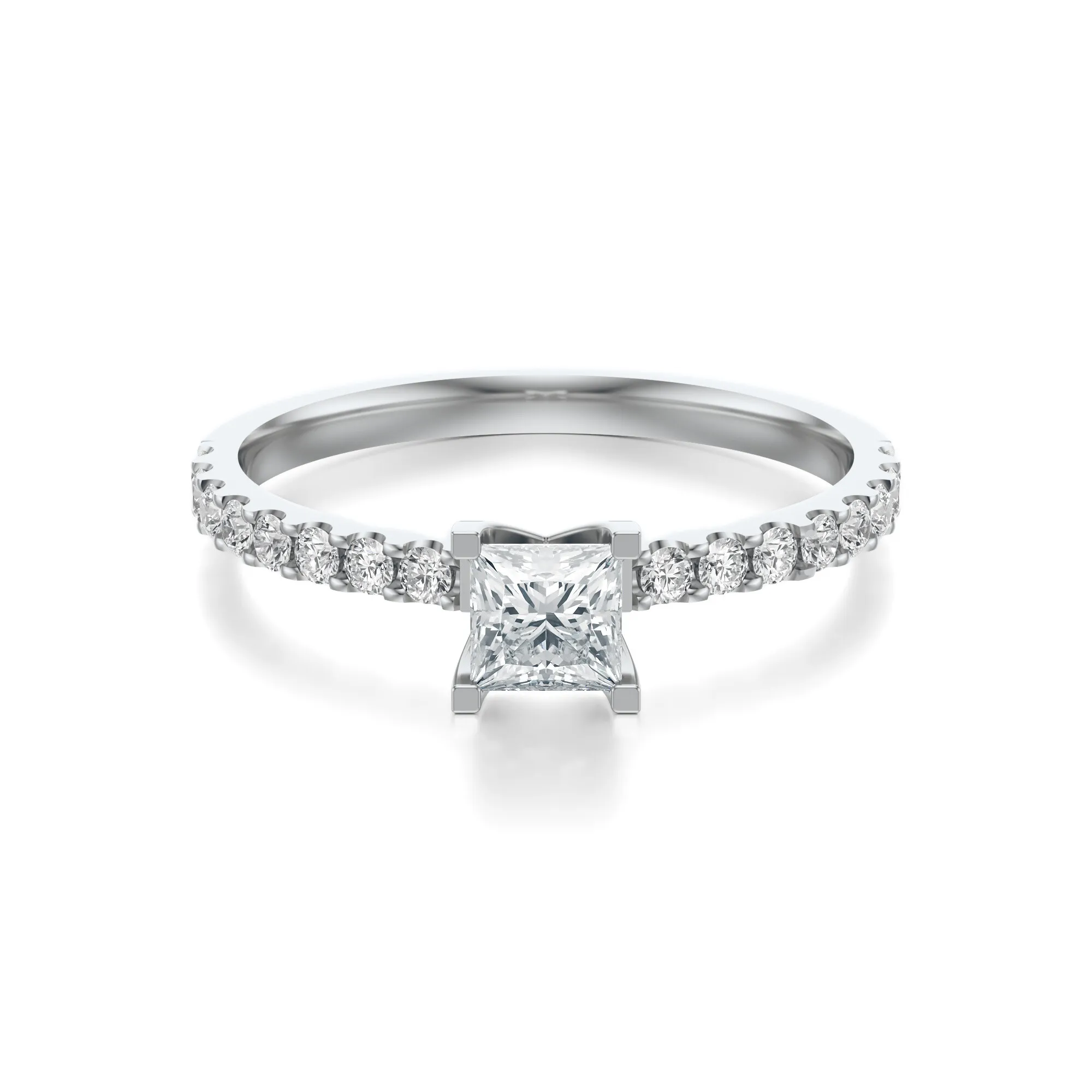 Zachwycający pierścionek z białego złota o próbie 585 to synonim ponadczasowej elegancji i luksusu. Jego wyjątkowy design łączy centralny diament o szlifie princessa z subtelnie lśniącym rzędem okrągłych diamentów wzdłuż obrączki, co nadaje całości intensywnego, hipnotyzującego blasku. Jasna, chłodna tonacja białego złota doskonale podkreśla czystość i świetlistość kamieni.