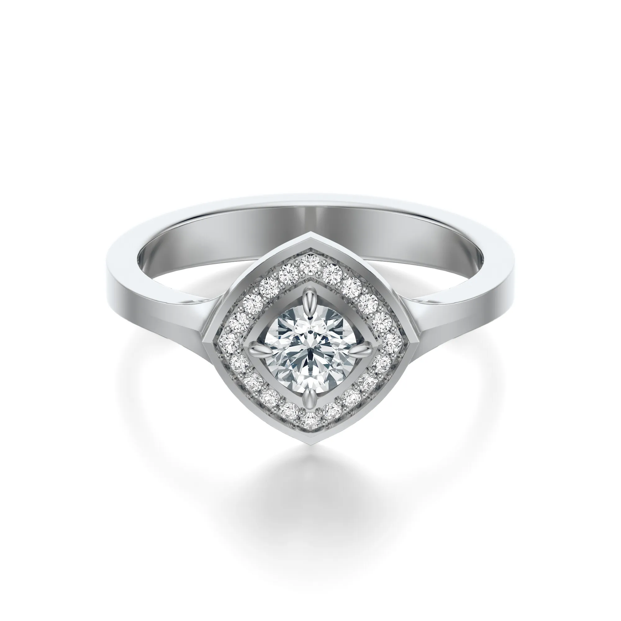 Ten wyrafinowany pierścionek z białego złota 585 zachwyca szlachetną elegancją i nowoczesną formą. Centralny, okrągły diament otoczony został dekoracyjną ramą z drobnych, lśniących kamieni, które tworzą harmonijną kompozycję. Całość emanuje intensywnym blaskiem, który przyciąga spojrzenia i podkreśla luksusowy charakter biżuterii.