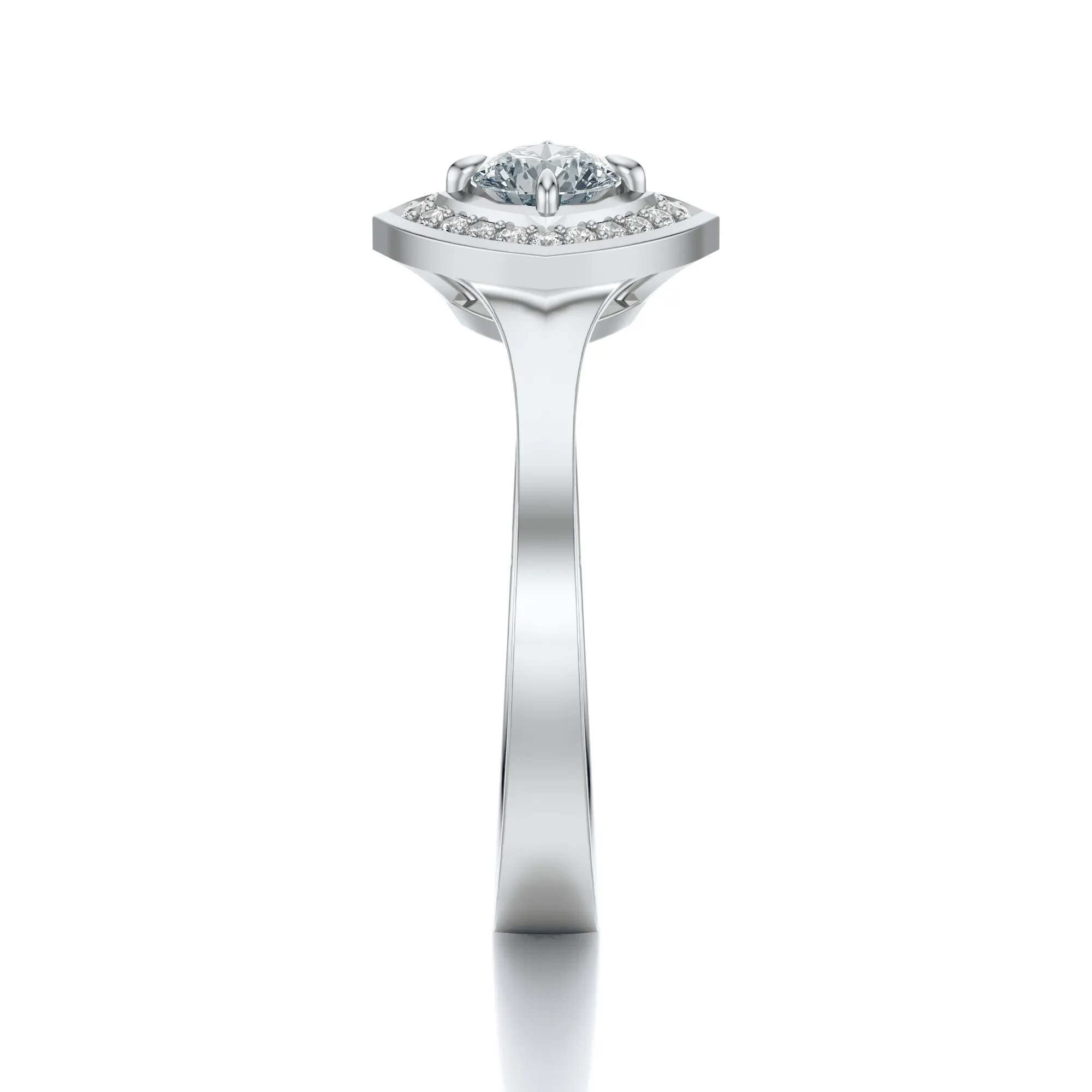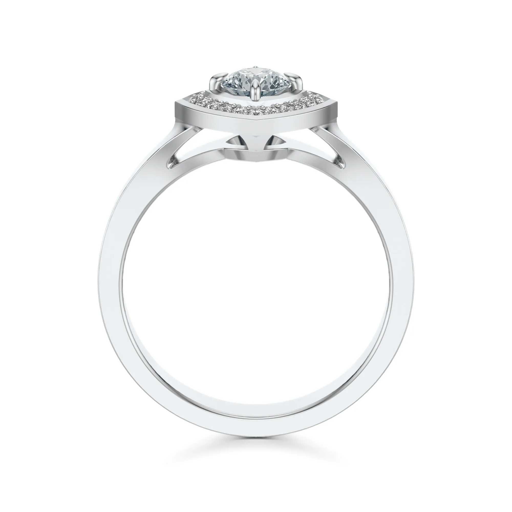 Białe złoto w połączeniu z diamentami nadaje pierścionkowi niezwykle czysty, chłodny ton — idealny dla osób, które cenią minimalistyczną, lecz wyrafinowaną estetykę. Geometryczna forma oprawy i precyzyjnie osadzone kamienie dodają całości elegancji i nowoczesnego wyrazu. To doskonały wybór dla kobiet z klasą, które pragną wyrazić uczucia w sposób niebanalny i ponadczasowy.