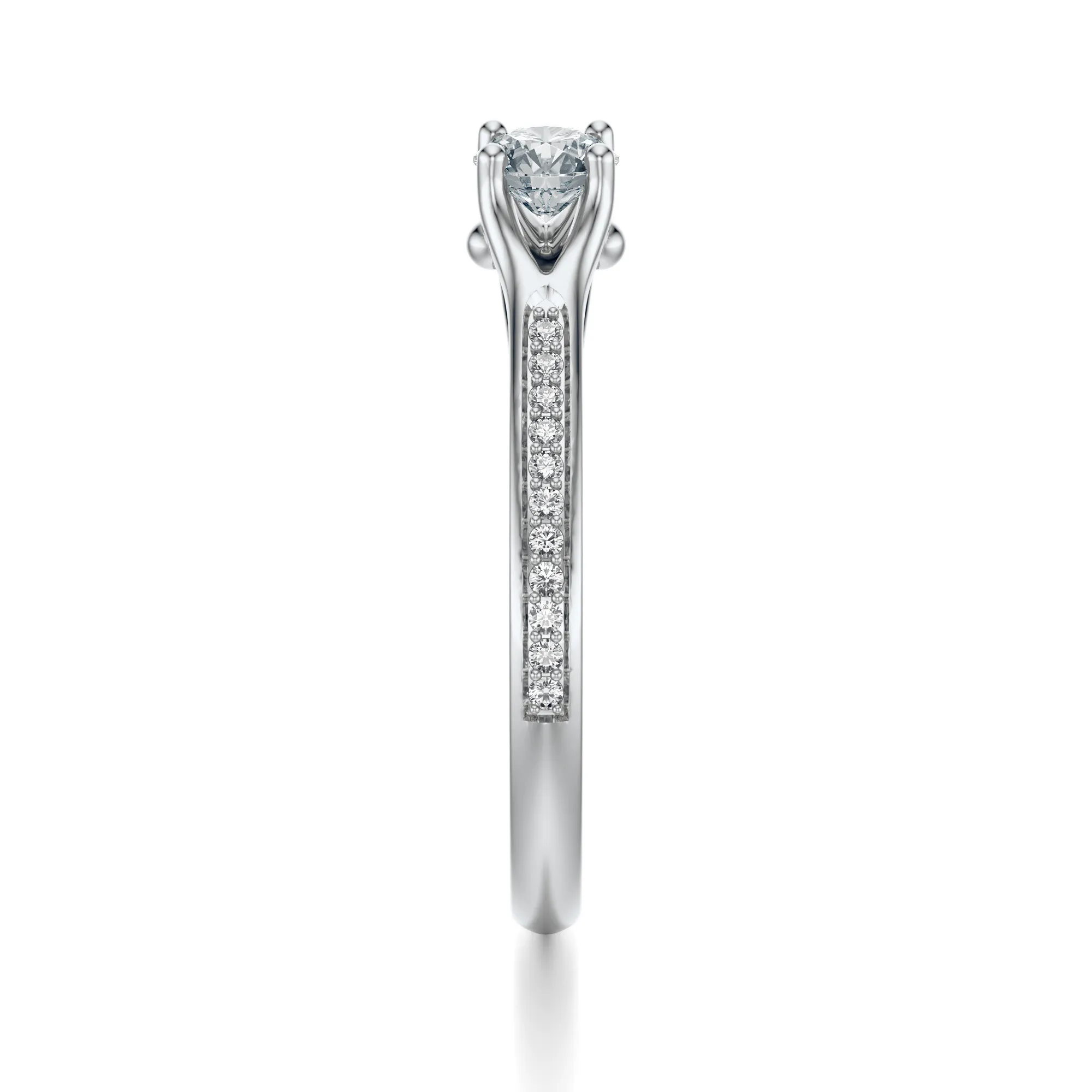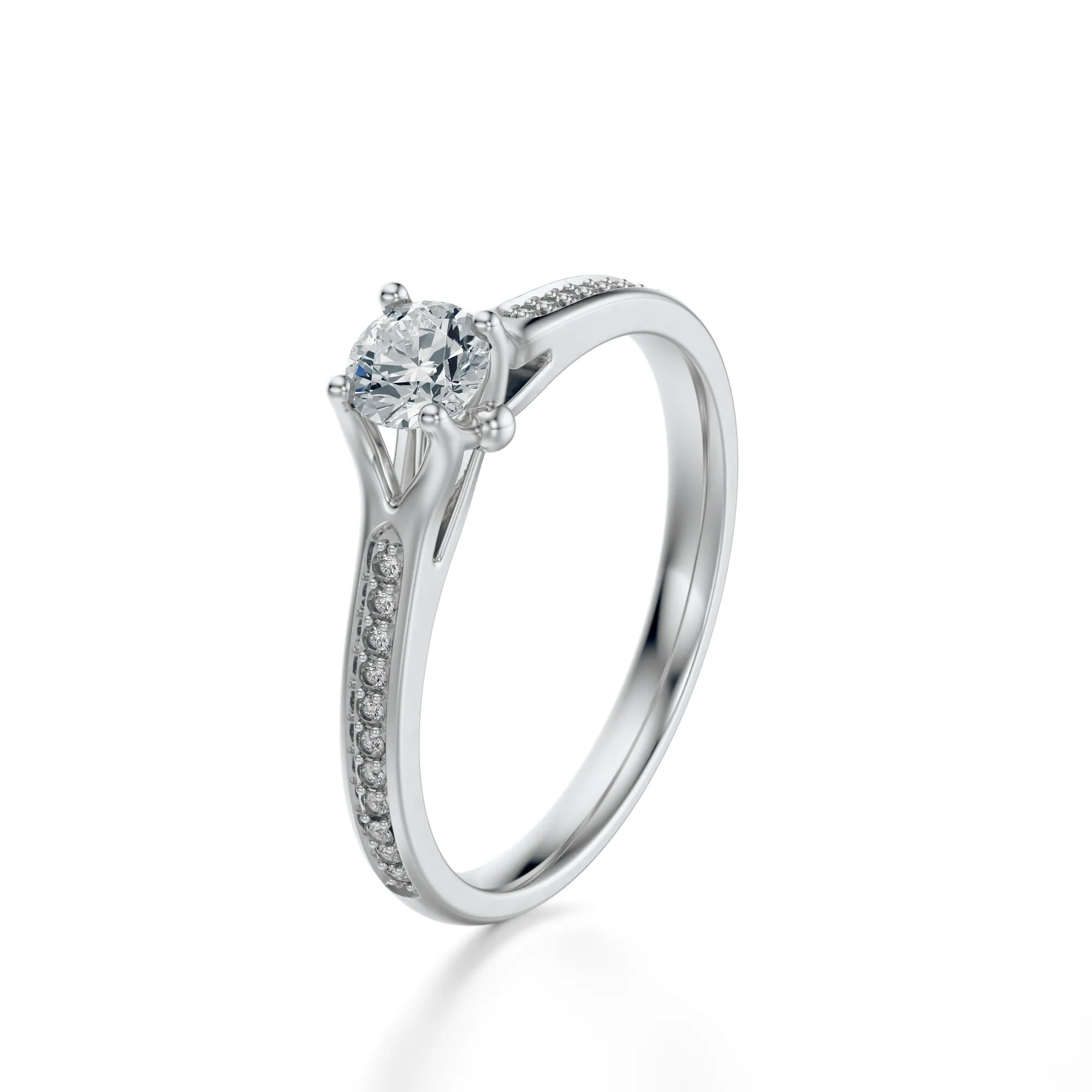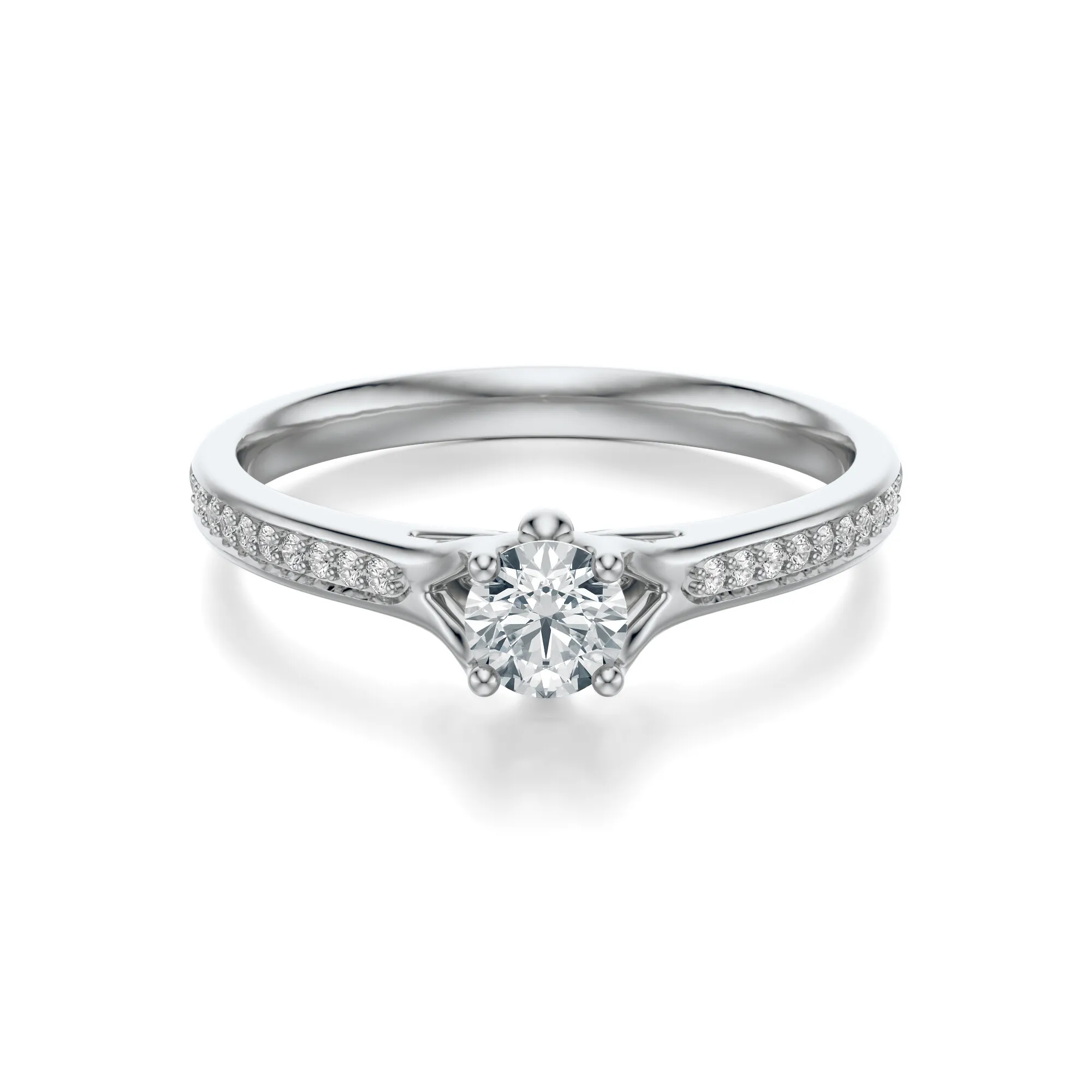 W pierścionku zastosowano kamienie o wyjątkowych parametrach: czystość VS2, barwa H, szlif Excellent i masa od 0.30 do 0.70 ct – dostępne zgodnie z preferencjami klienta. Wysokiej jakości szlif gwarantuje maksymalny połysk, a starannie rozmieszczone boczne diamenty potęgują efekt świetlistości, sprawiając, że każdy ruch dłoni rozświetla się subtelnym blaskiem.