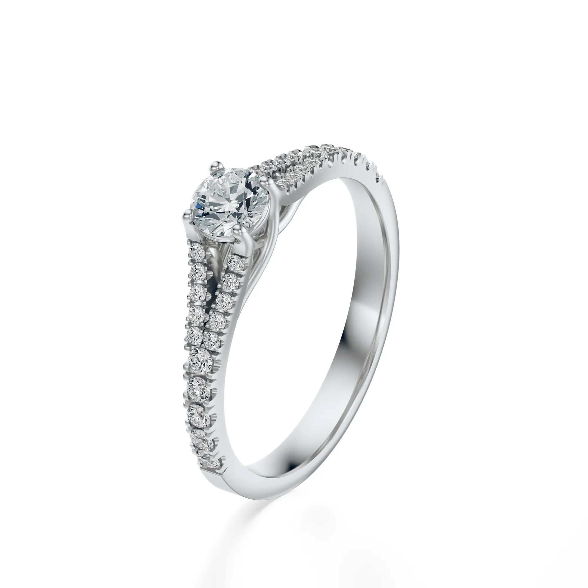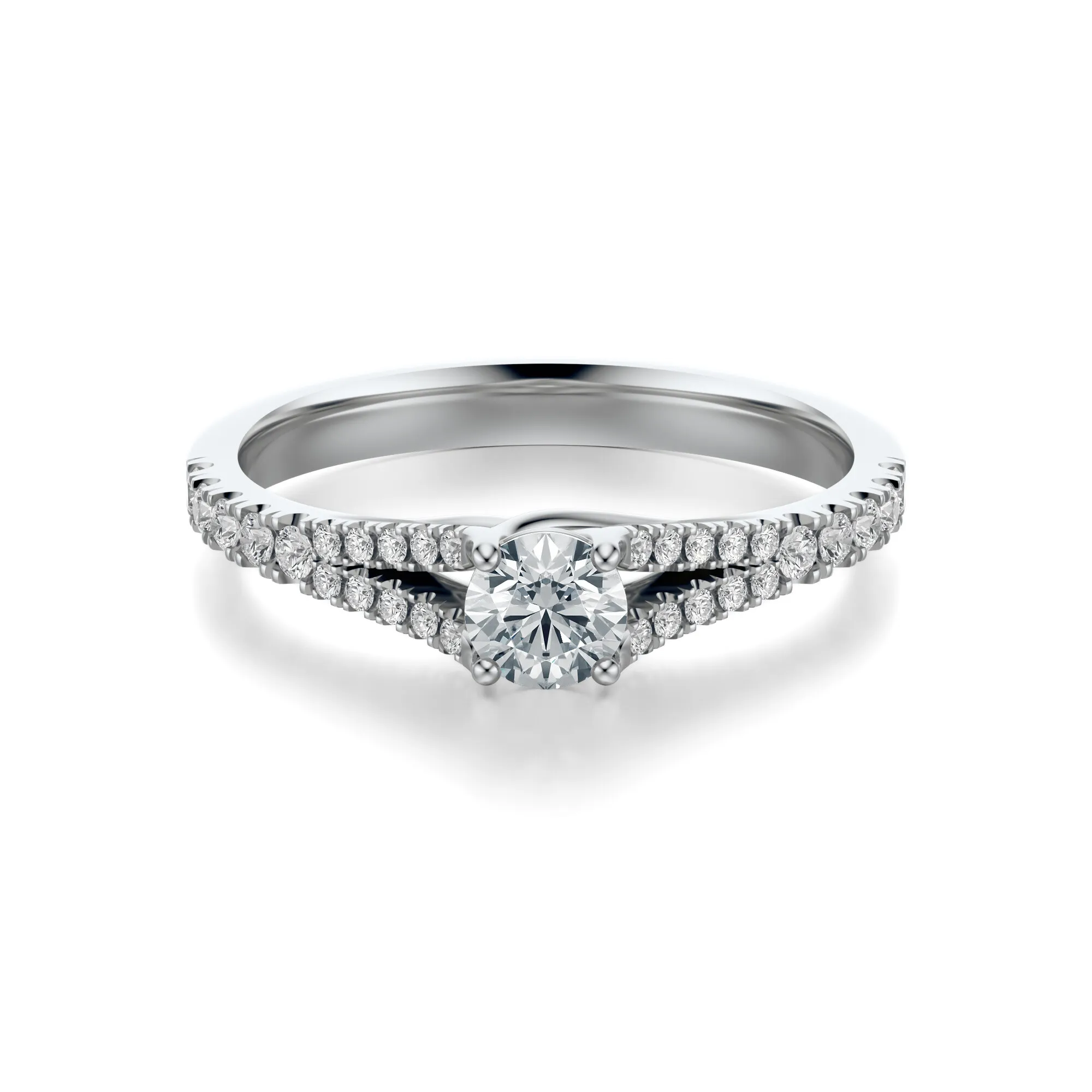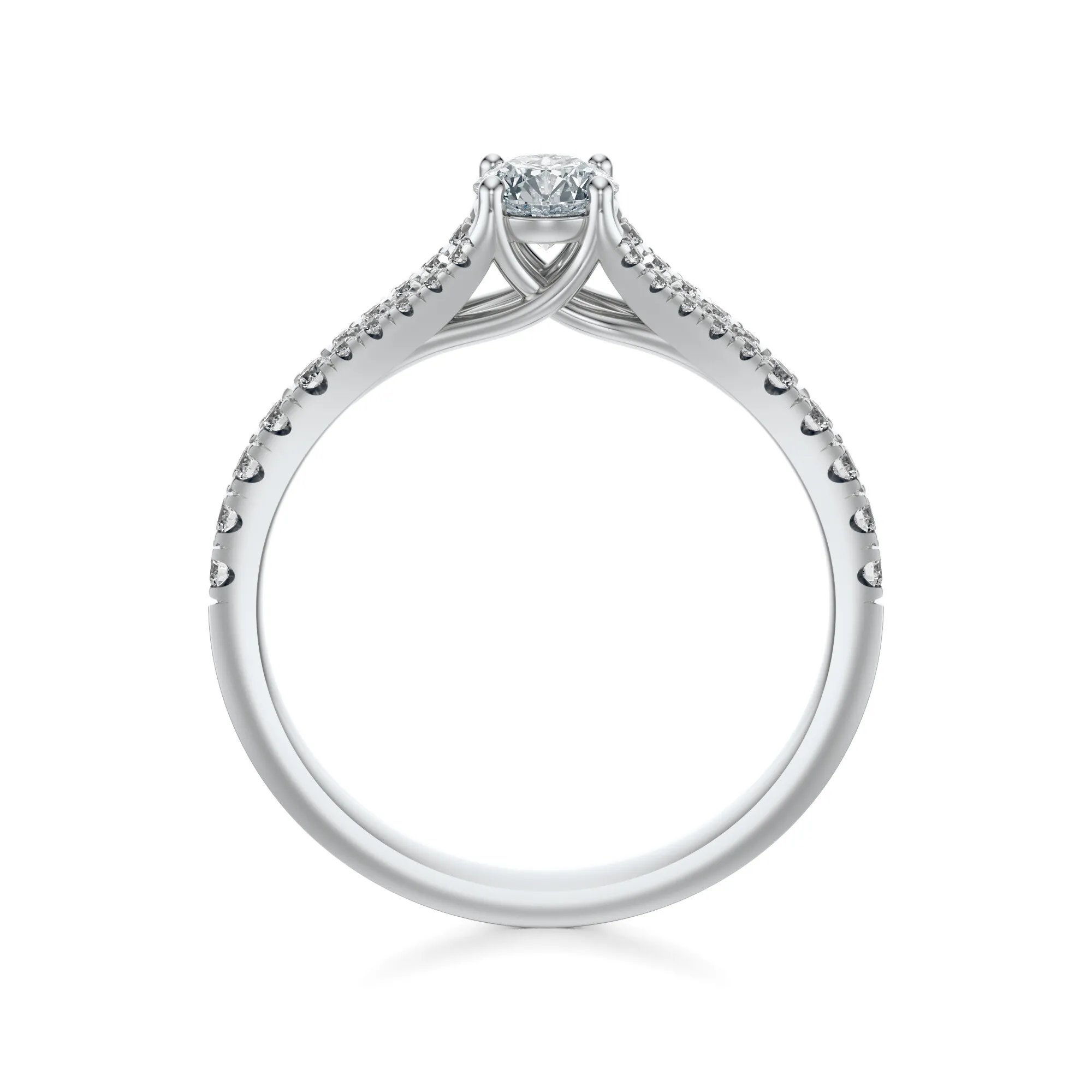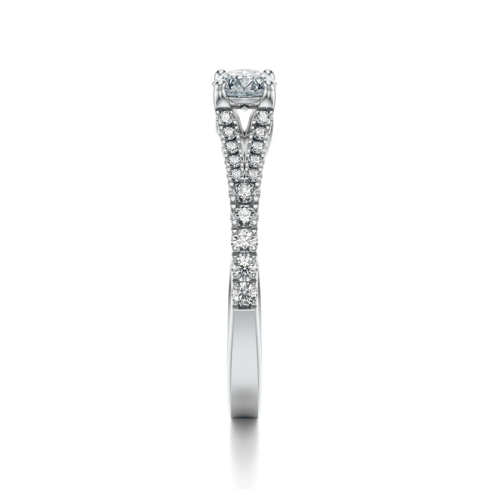 W prezentowanym modelu zastosowano kamienie o okrągłym szlifie typu Excellent, zapewniającym najwyższy poziom brylancji. Czystość VS2 i barwa H gwarantują, że każdy diament odbija światło z wyjątkową intensywnością. Masa centralnego kamienia może wynosić od 0.30 do 0.70 ct – wszystkie parametry można spersonalizować, co czyni ten pierścionek jeszcze bardziej unikatowym.
