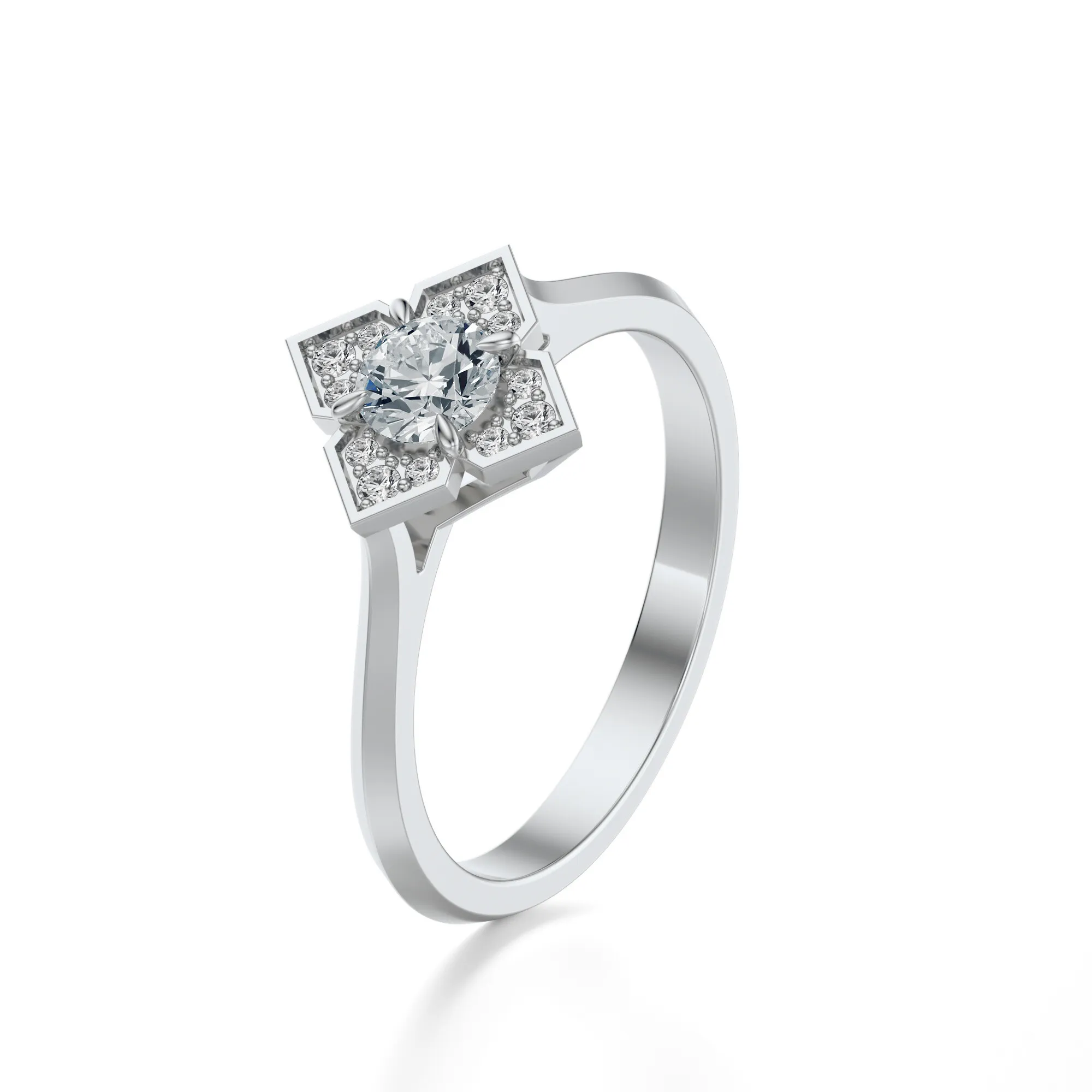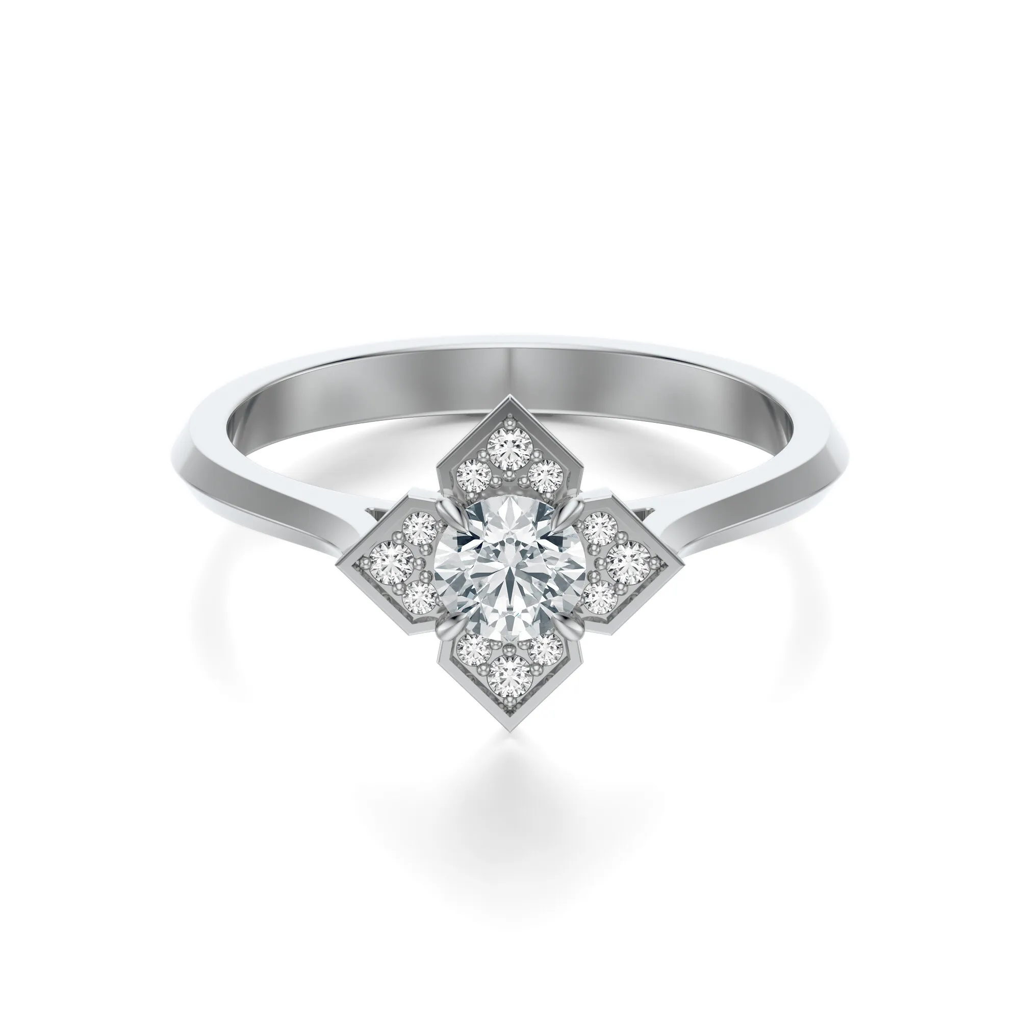 Główny diament w szlifie okrągłym typu Excellent wyróżnia się znakomitą grą światła. Przy standardowych parametrach: czystość VS2, barwa H i masie od 0.30 do 0.70 ct, zapewnia intensywny blask i wyjątkową przejrzystość. Wokół niego rozmieszczono drobniejsze kamienie, które dodatkowo potęgują jego świetlistość. Wszystkie użyte diamenty spełniają międzynarodowe standardy i są starannie selekcjonowane.