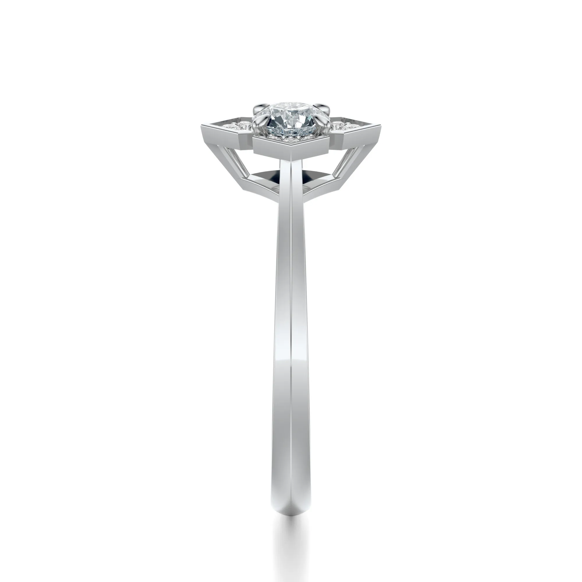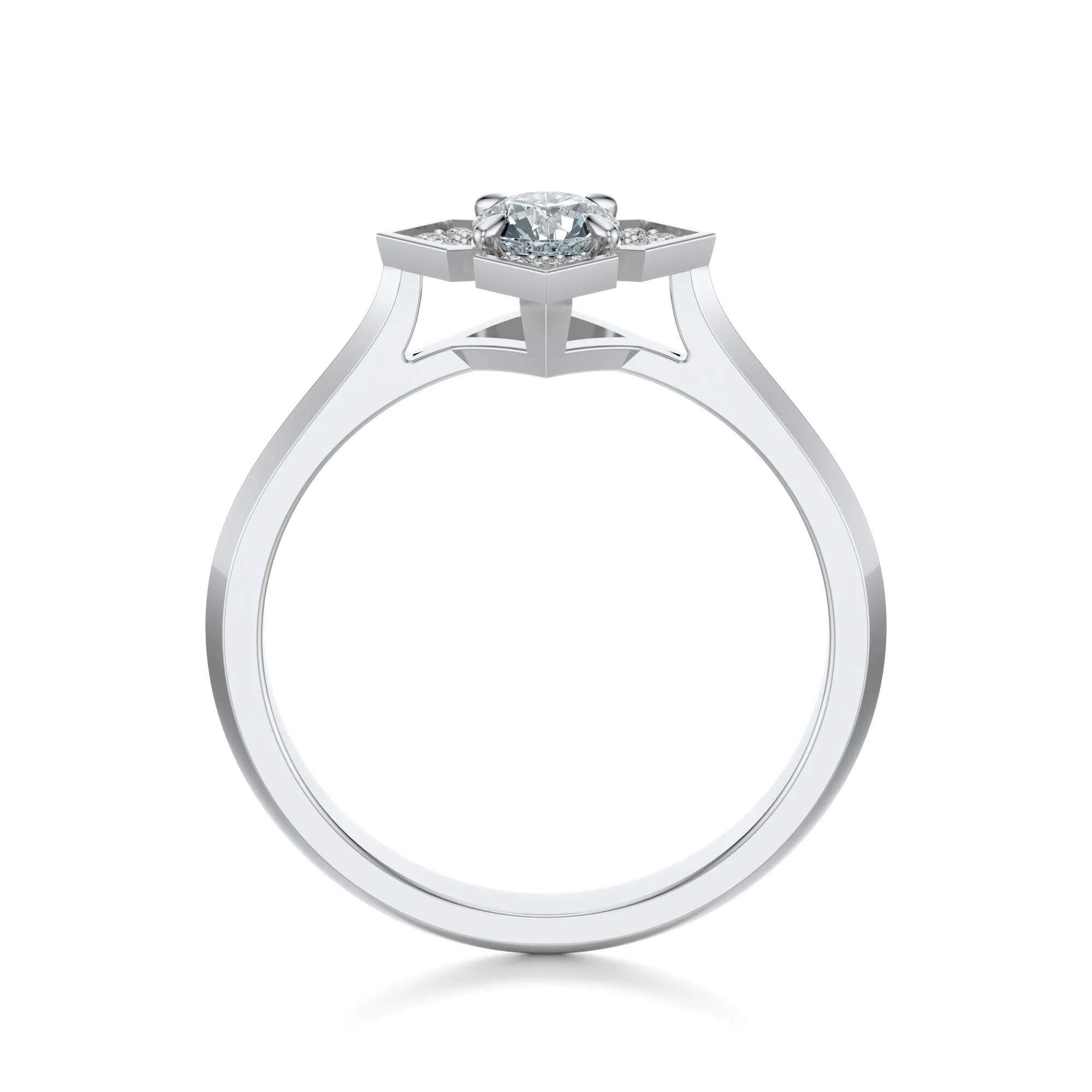 Uwagę przyciąga wyjątkowy układ kamieni, osadzonych w geometrycznej koronie, co nadaje pierścionkowi wyraźny, ale nienachalny charakter. Delikatnie wzniesione ramiona i lekka konstrukcja oprawy dodają mu lekkości oraz podkreślają centralny diament. Taki projekt doskonale wpisuje się w gusta osób ceniących elegancję i nowoczesną prostotę. Diamenty od wieków symbolizują trwałość uczuć, czystość intencji i siłę – dlatego ten pierścionek świetnie sprawdzi się jako klasyczny pierścionek zaręczynowy.