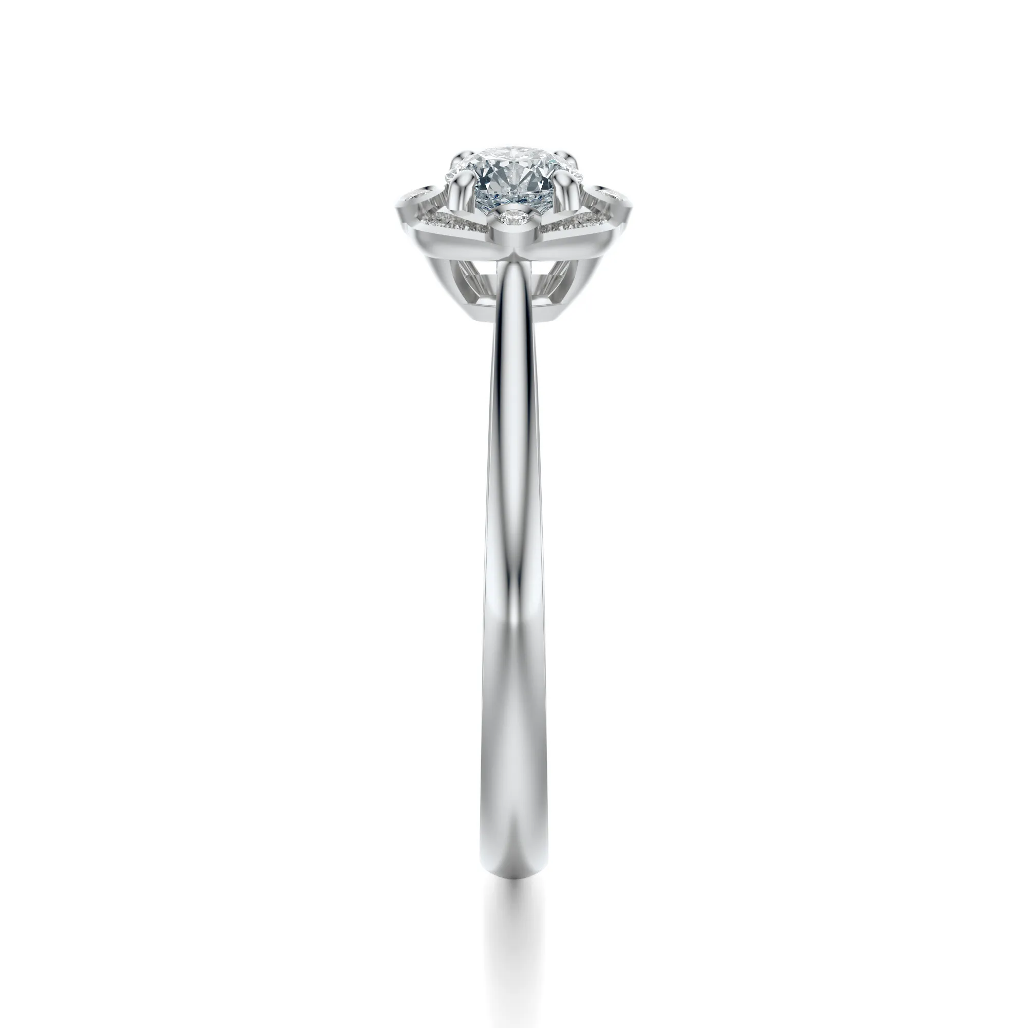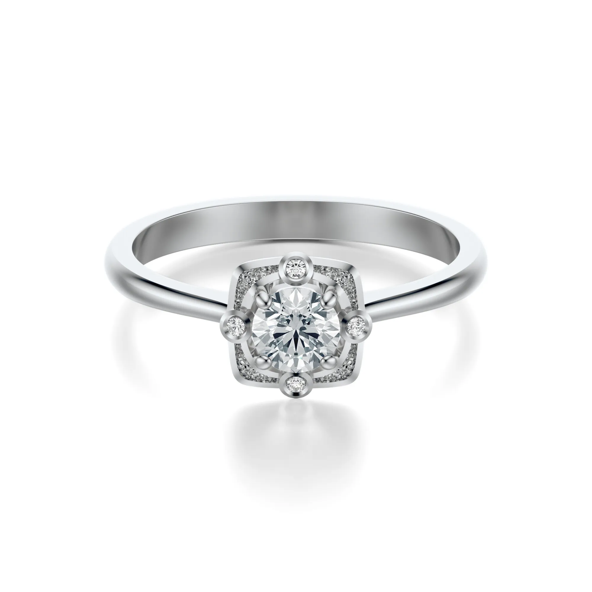 Pierścionek zdobią okrągłe diamenty o standardowych parametrach: czystość VS2, barwa H, szlif Excellent oraz dostępnych masach: 0.30, 0.40, 0.50 lub 0.70 ct. Oferujemy również możliwość indywidualnej konfiguracji parametrów według preferencji klienta. Diamenty w tym modelu zostały osadzone w sposób, który maksymalnie wydobywa ich blask i pozwala światłu harmonijnie odbijać się na każdej powierzchni.