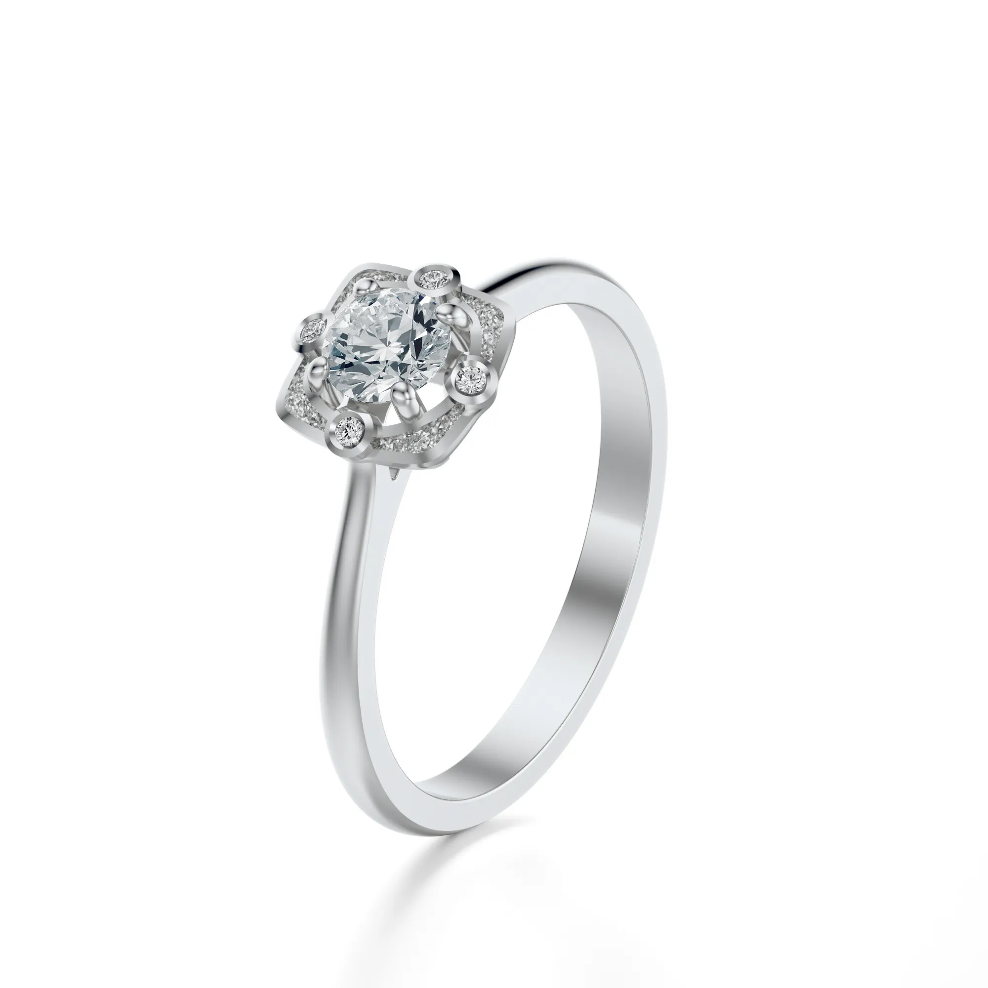 Centralny diament w okrągłym szlifie otacza geometryczna kompozycja mniejszych kamieni, umieszczonych w ozdobnej koronie o subtelnych zdobieniach. To właśnie starannie rozmieszczone akcenty tworzą wrażenie przestrzenności i sprawiają, że pierścionek przyciąga wzrok z każdej perspektywy. Projekt ten będzie idealnym wyborem dla kobiet ceniących nowoczesne, a zarazem ponadczasowe wzornictwo. Diament jako symbol trwałości i siły doskonale podkreśla uczuciową wartość pierścionka – zarówno w zaręczynach, jak i innych wyjątkowych okazjach.
