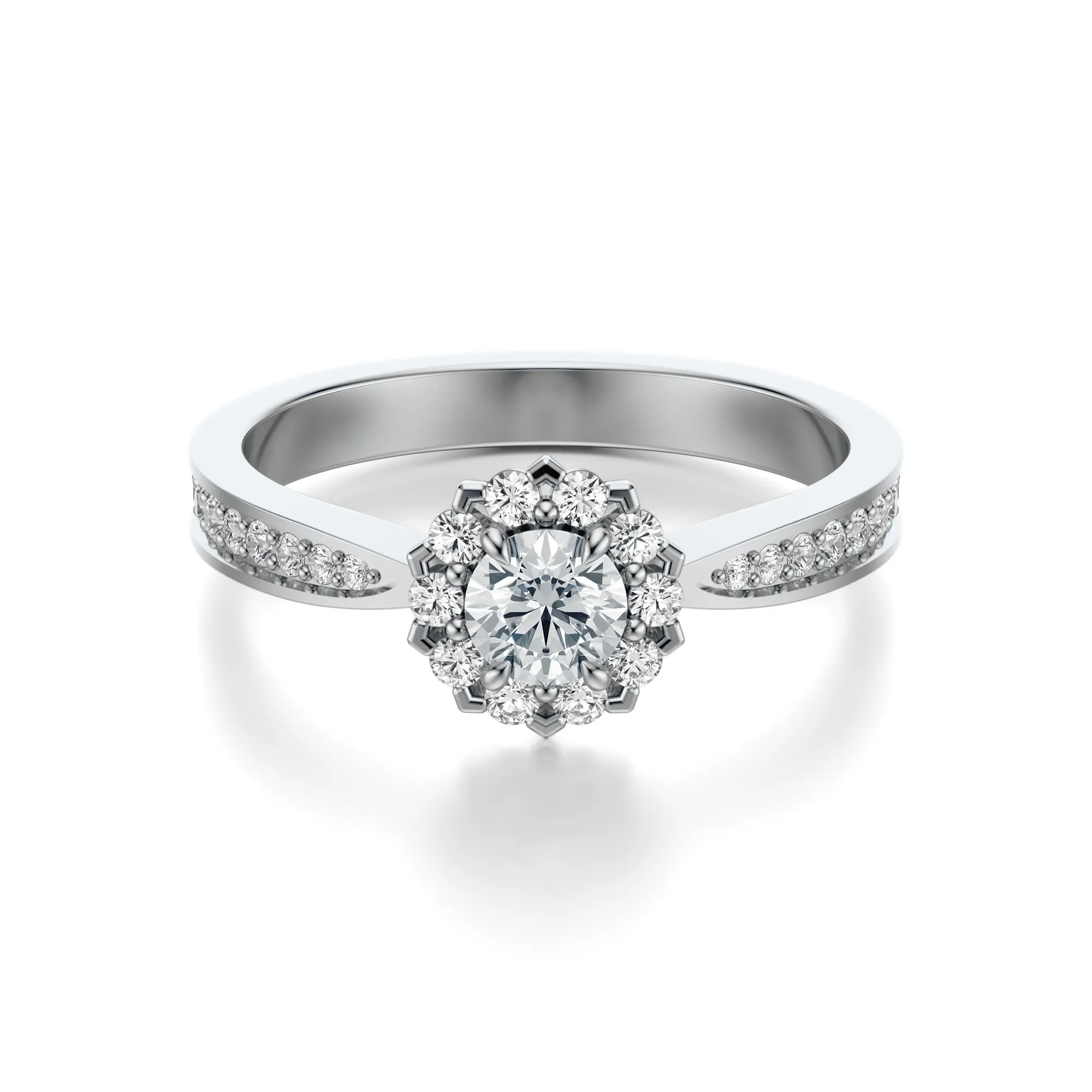 Szlifowane z precyzją kamienie charakteryzują się parametrami: czystość VS2, barwa H, szlif Excellent, dostępne w masach 0.30, 0.40, 0.50 i 0.70ct – z możliwością dopasowania do indywidualnych preferencji. Diamenty rozmieszczone w formie halo i wzdłuż obrączki intensyfikują blask, zapewniając spektakularny efekt wizualny.