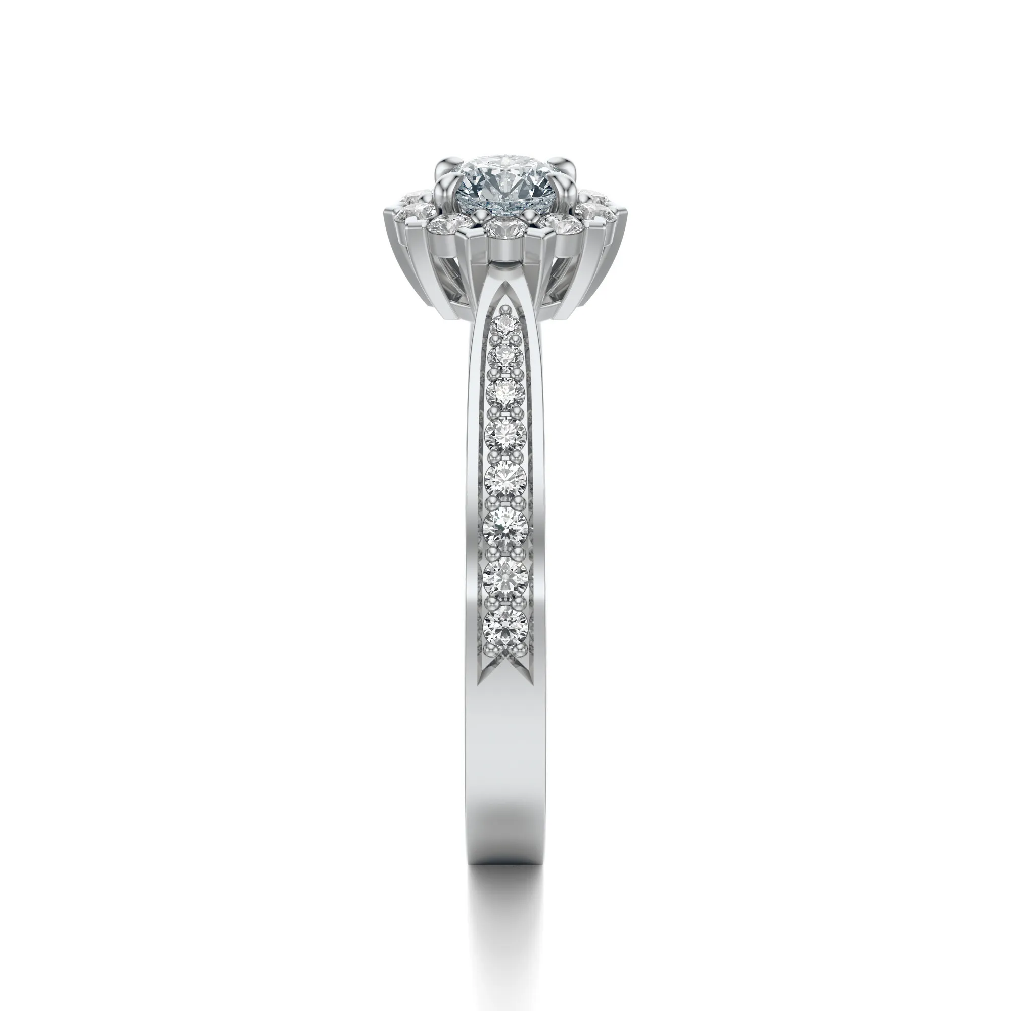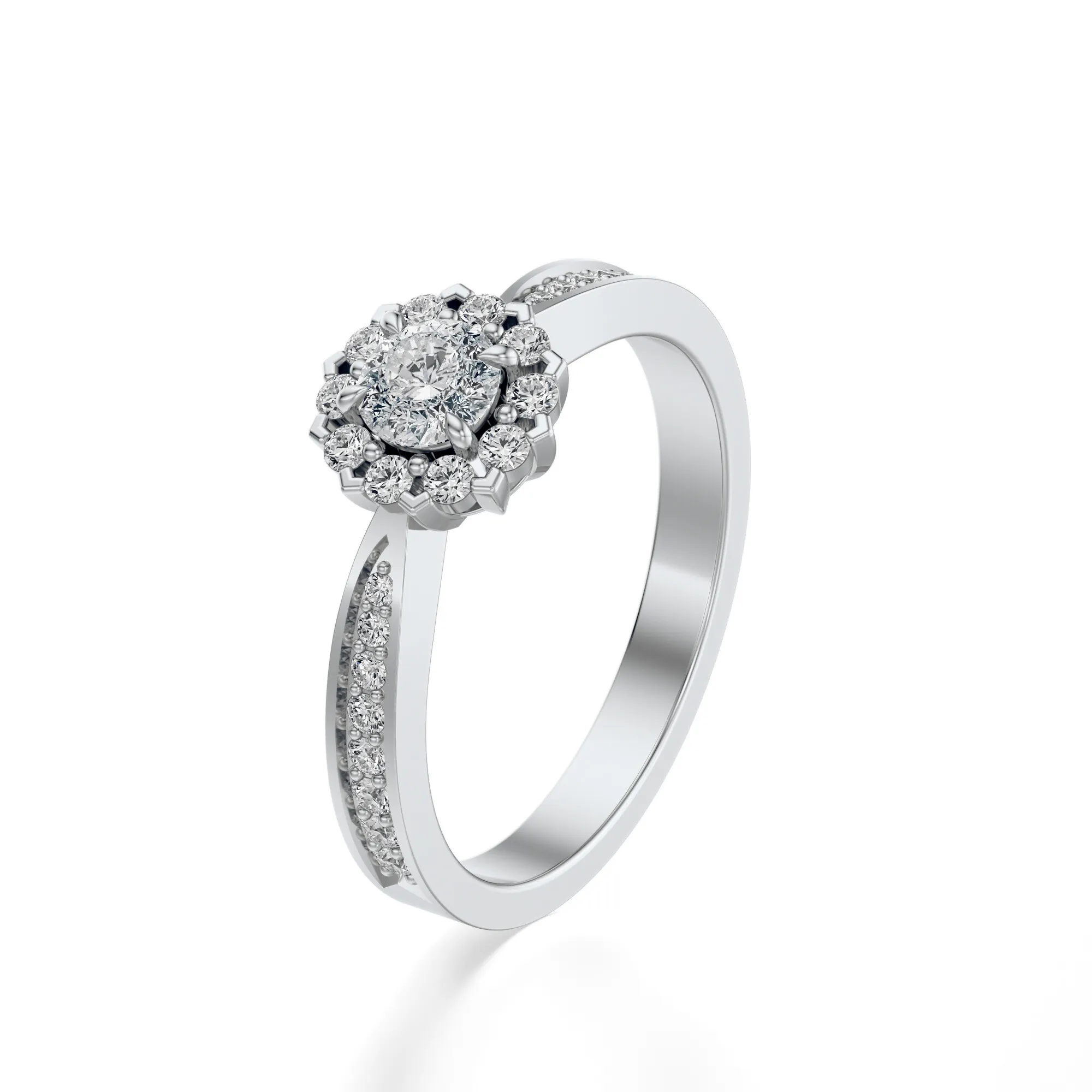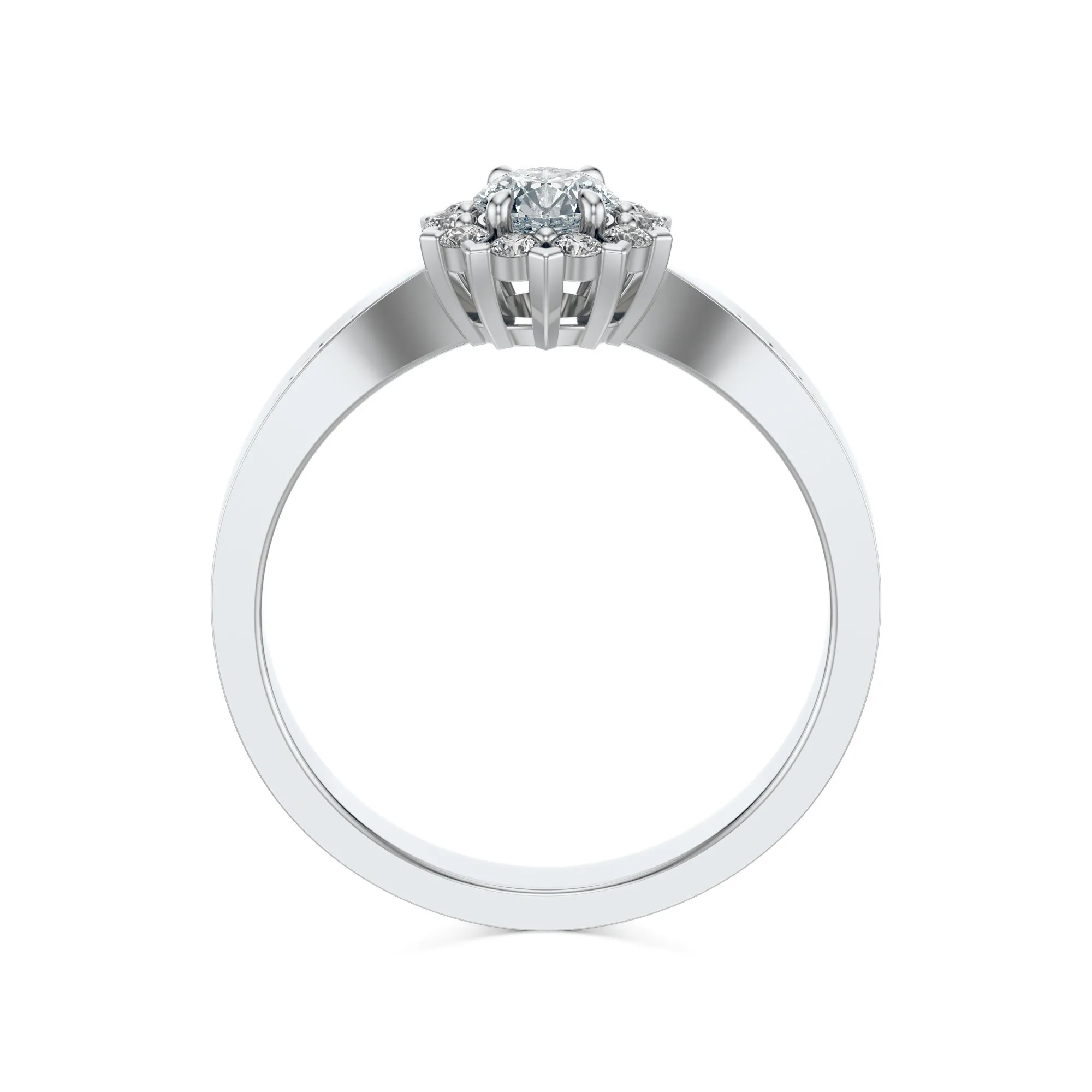 Centralny diament otoczony jest aureolą drobniejszych kamieni, które dodają mu niepowtarzalnego uroku. Boczna część obrączki zdobiona jest precyzyjnie osadzonymi diamentami, co nadaje pierścionkowi wyjątkowego charakteru i podkreśla jego ekskluzywny design. To propozycja dla osób ceniących zarówno klasykę, jak i nowoczesny szyk.