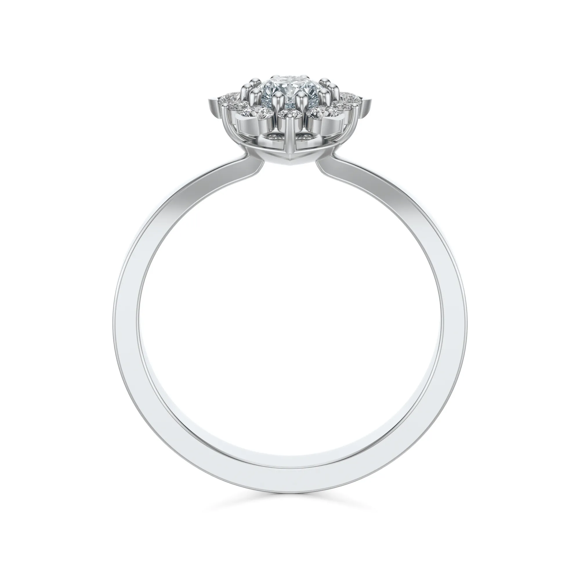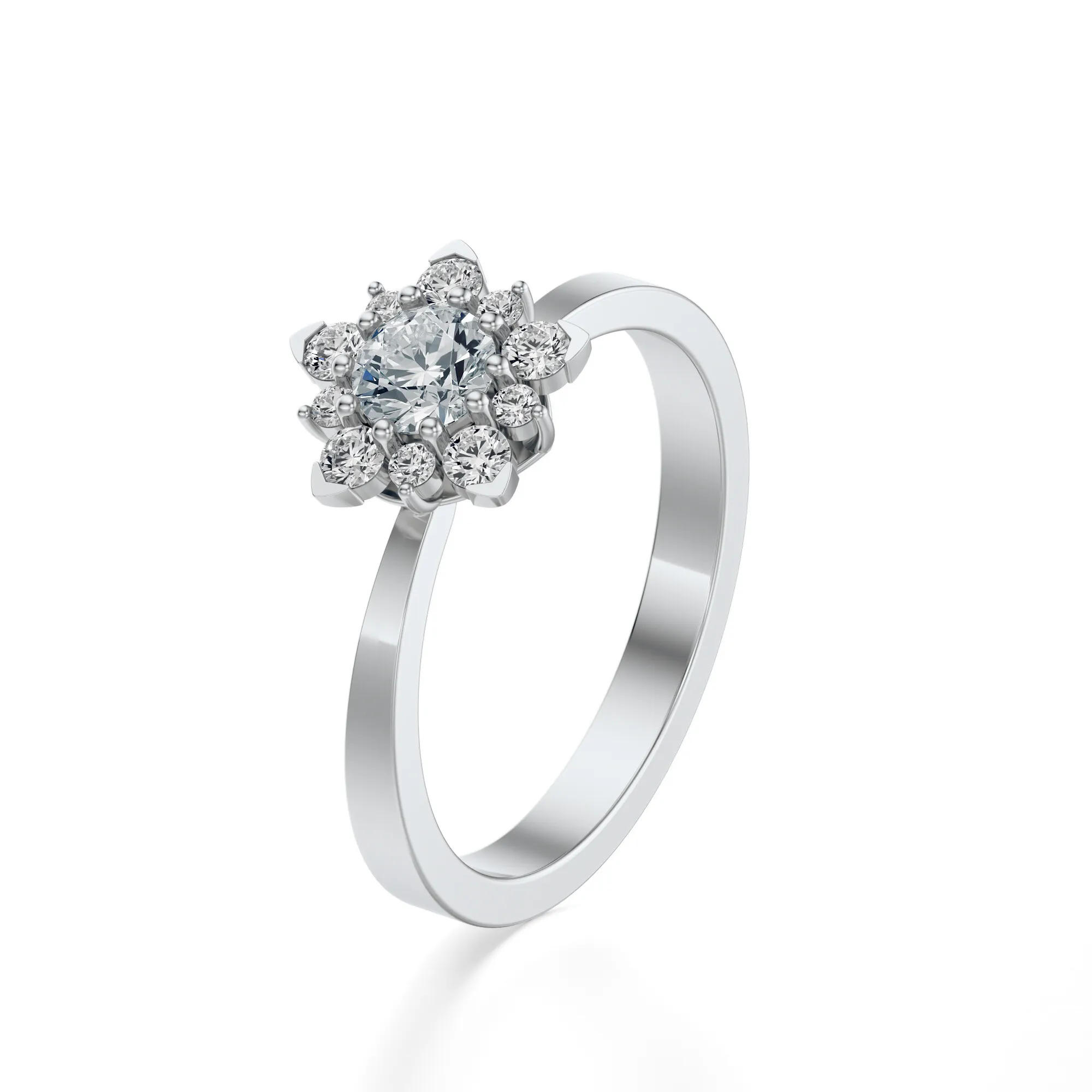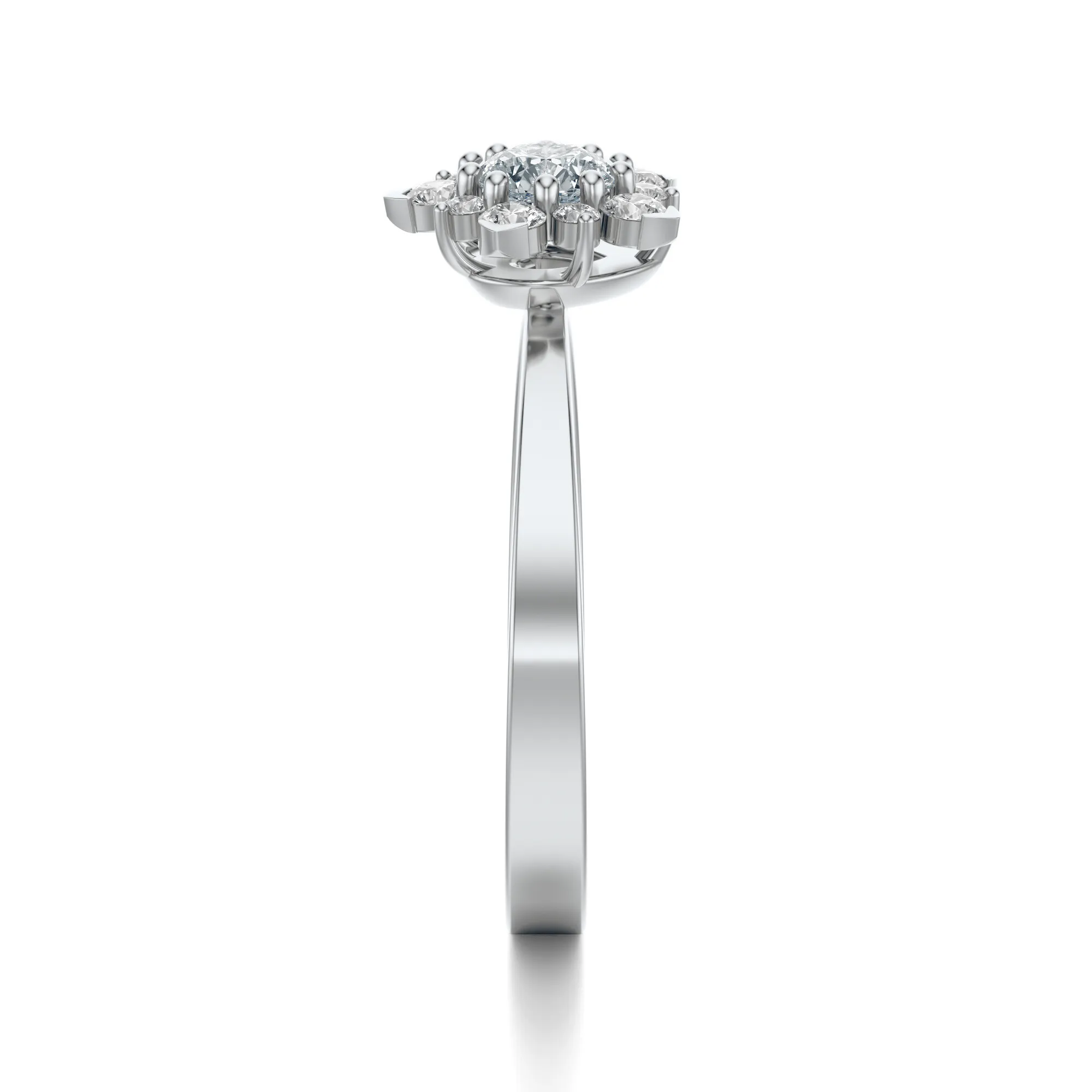 Ten pierścionek z białego złota zachwyca perfekcyjnym połączeniem subtelności i wyrafinowanego blasku. Wykonany ze złota o próbie 585, przyciąga uwagę elegancką formą i pięknym, kwiatowym układem diamentów. Każdy detal został starannie dopracowany, by stworzyć harmonijną kompozycję z luksusowym wykończeniem i wyjątkową lekkością. Okrągłe diamenty osadzone w koronie dodają całości wrażenia finezji i ponadczasowej elegancji.