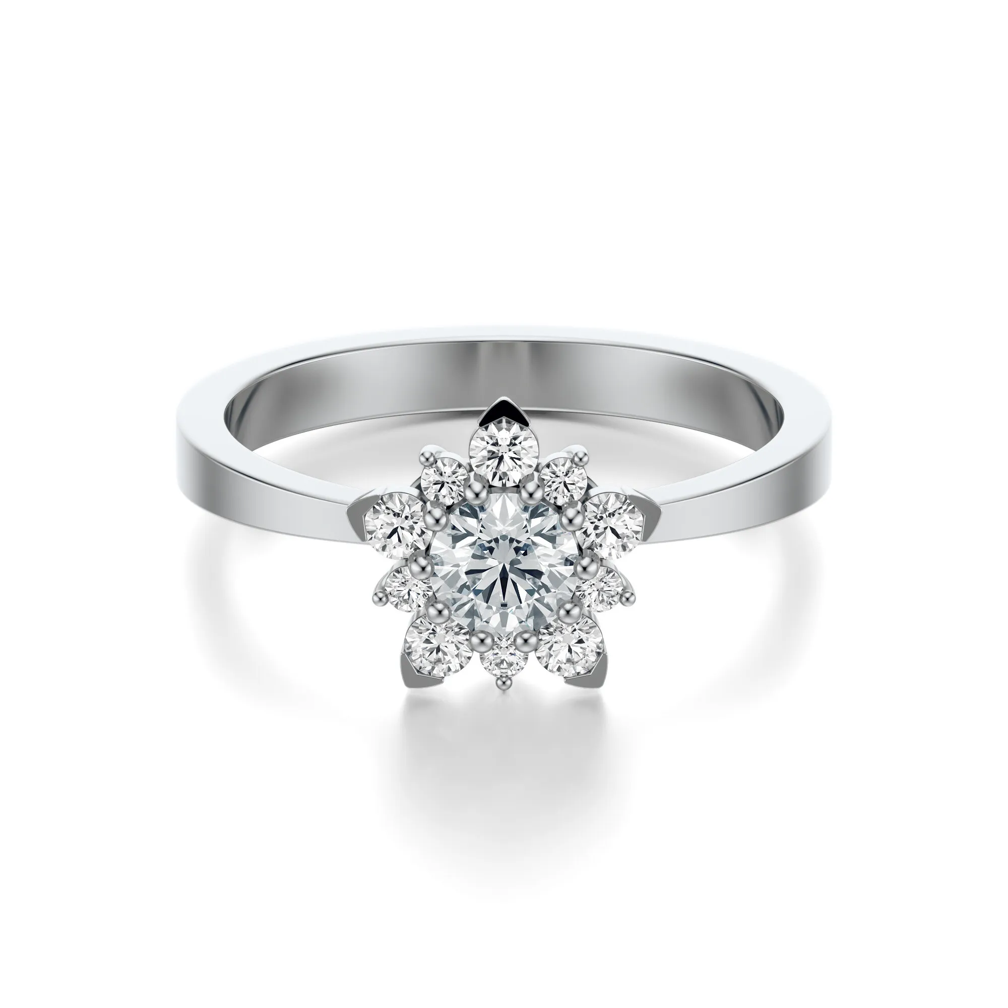 Delikatny i zmysłowy design sprawia, że pierścionek prezentuje się niezwykle lekko, nie tracąc przy tym na okazałości. Centralny kamień, otoczony mniejszymi diamentami, przypomina rozkwitający kwiat – symbol życia, piękna i miłości. Ta klasyczna forma z subtelnym motywem florystycznym to doskonały wybór dla kobiet ceniących połączenie prostoty z wyrafinowanym stylem. Będzie idealnym prezentem na zaręczyny, rocznicę lub jako elegancki dodatek do wyjątkowej chwili.
