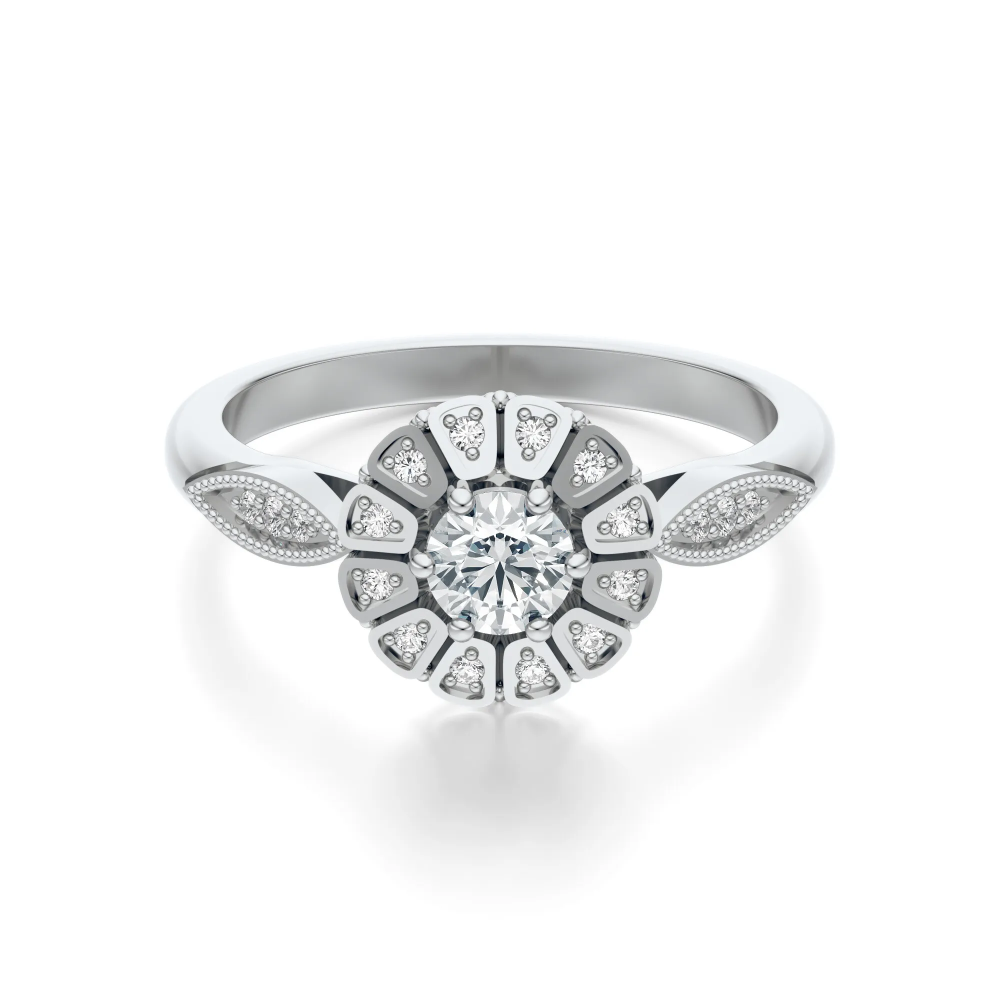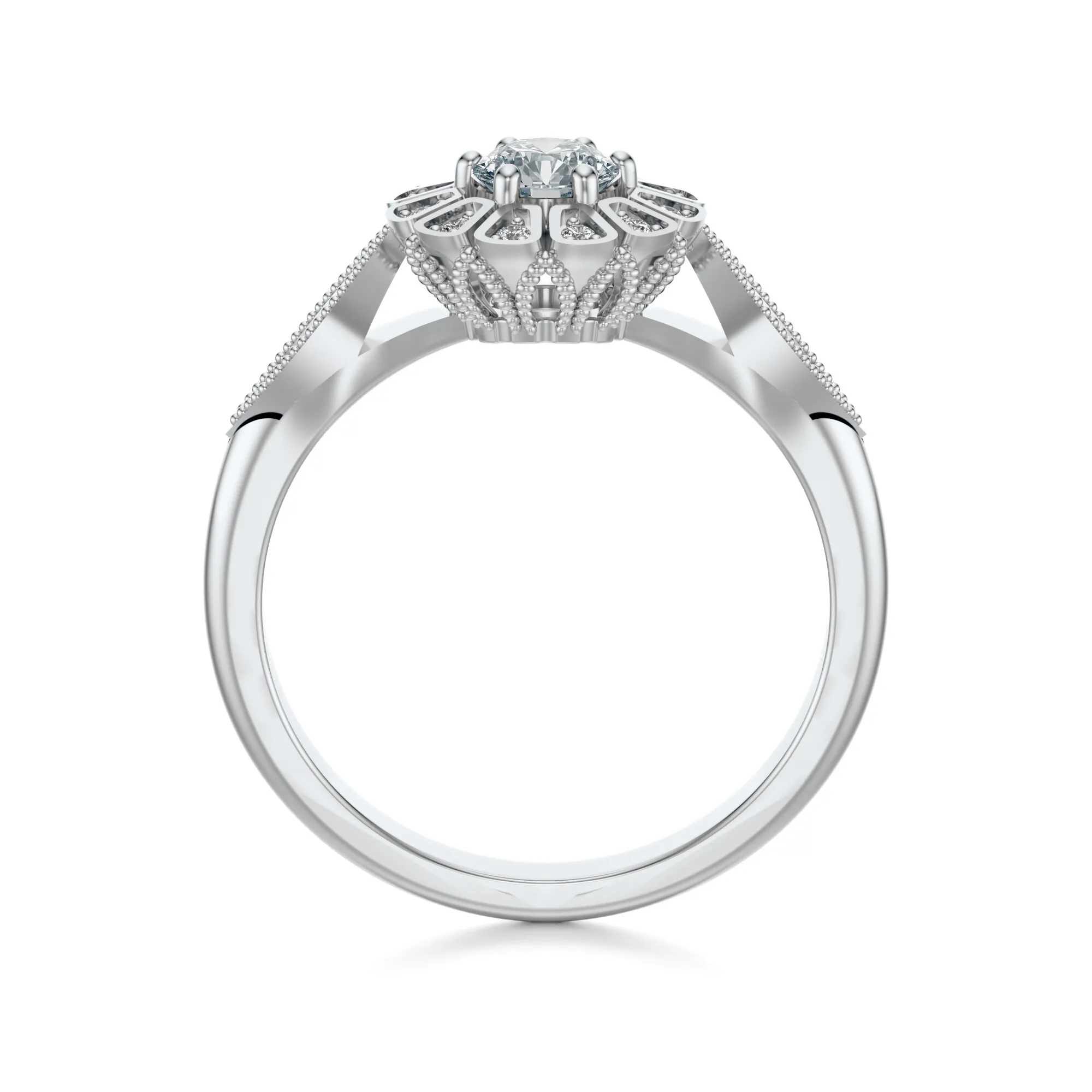 Okrągły diament centralny charakteryzuje się szlifem typu Excellent, co potęguje jego połysk i grę światła. Towarzyszące mu mniejsze kamienie, rozlokowane symetrycznie, wzmacniają efekt trójwymiarowości i świetlnej aury. Standardowe parametry w naszym sklepie to: czystość VS2, barwa H, masa od 0.30 do 0.70 ct, z możliwością dostosowania według indywidualnych oczekiwań klienta.