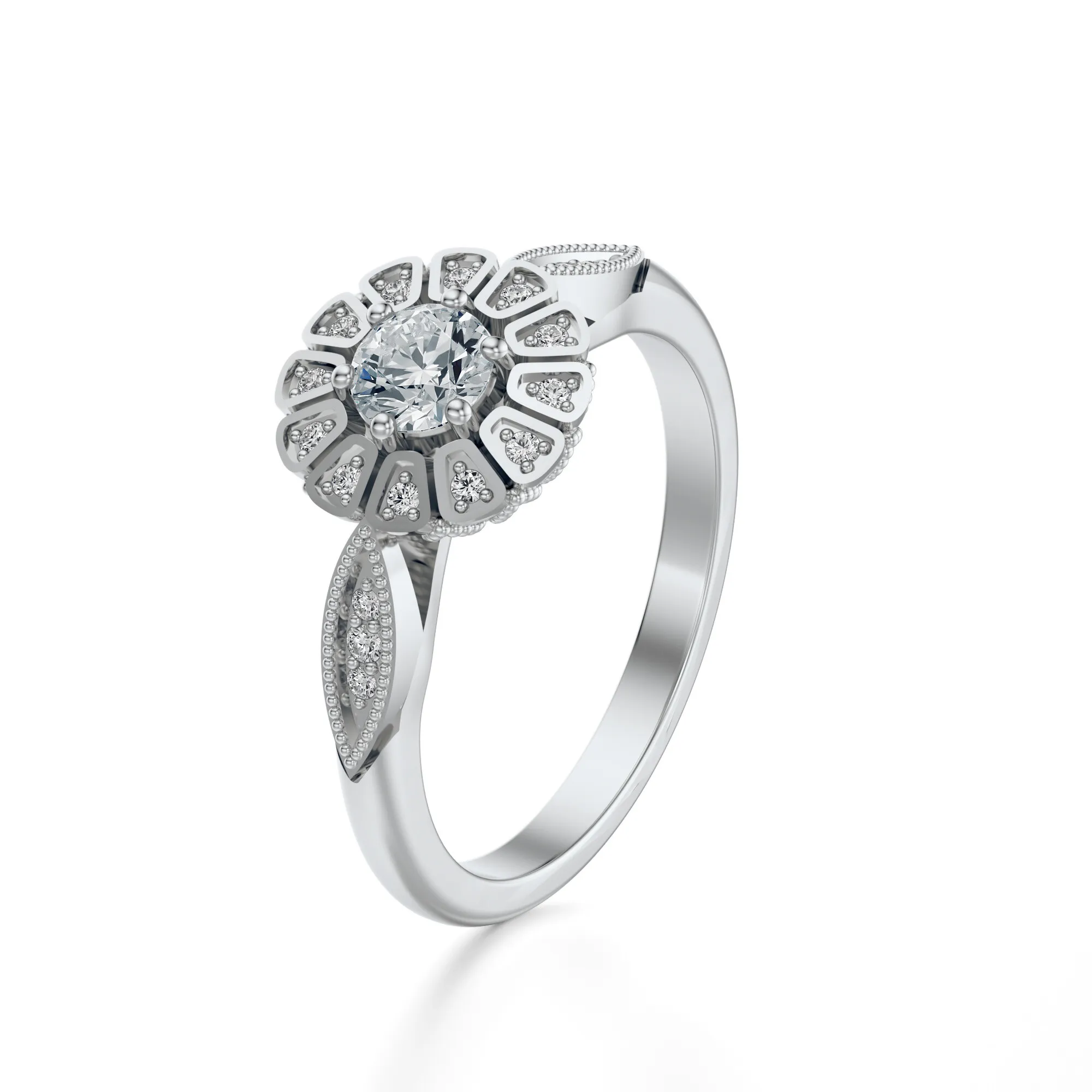 Ten wyrafinowany pierścionek wykonany ze złota o próbie 585 w chłodnym odcieniu białego złota zachwyca subtelnym, a zarazem efektownym wzornictwem. Jego centralnym punktem jest okrągły diament o niezwykłym blasku, otoczony ażurowym wzorem przypominającym płatki kwiatu, które zdobione są drobnymi diamentami. Całość tworzy wrażenie delikatności i harmonii, która emanuje z każdej strony tej wyjątkowej biżuterii.