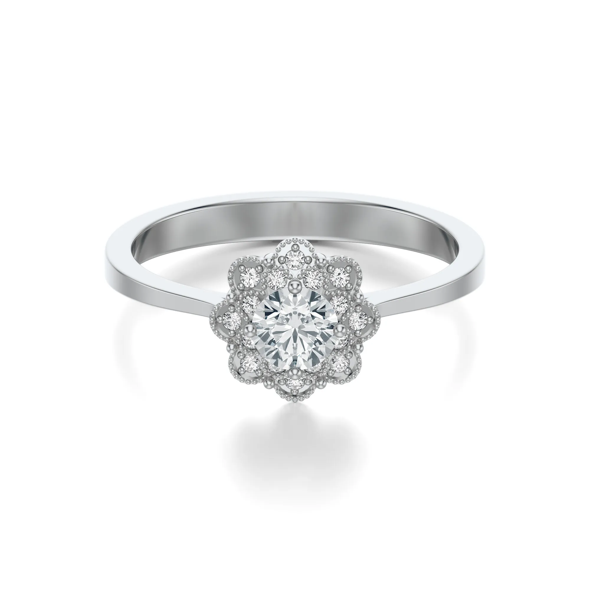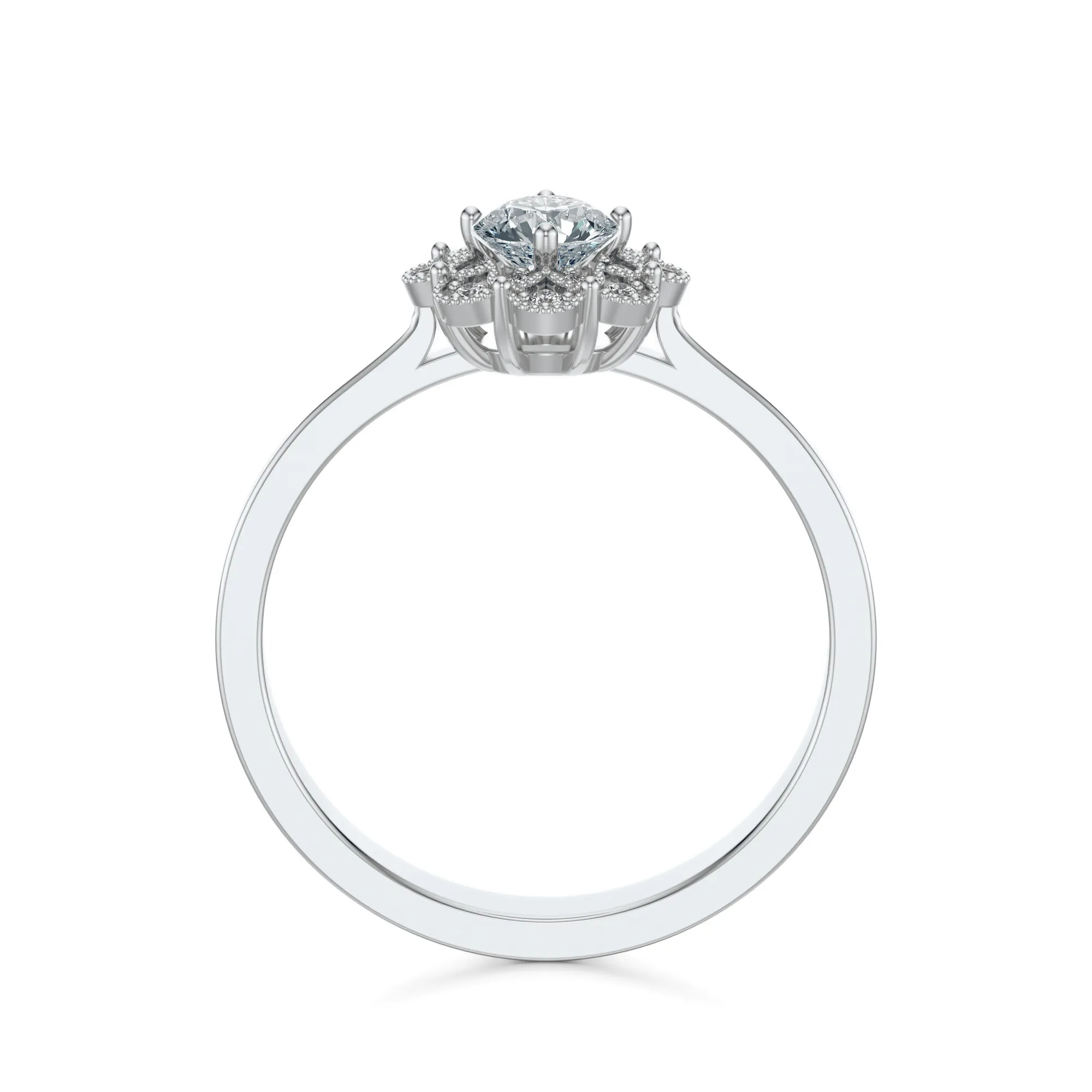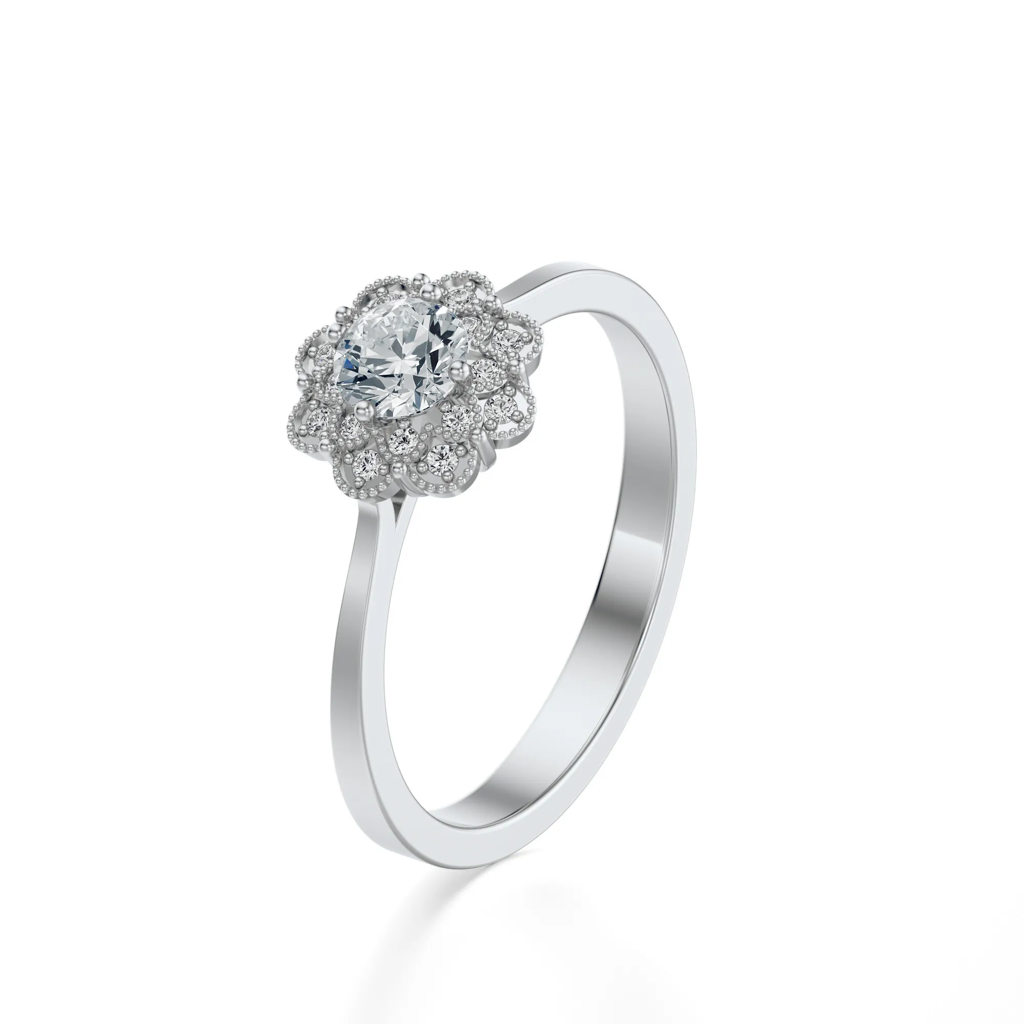 Ten urzekający pierścionek z białego złota o próbie 585 przyciąga spojrzenia swoją subtelną formą i wyrafinowaną kompozycją. Centralny diament o okrągłym szlifie lśni intensywnym blaskiem, otoczony koroną mniejszych kamieni ułożonych w kształcie delikatnych płatków. Całość osadzona została na smukłej, lśniącej obrączce, której minimalistyczna linia doskonale eksponuje bogaty detal górnej części pierścionka.