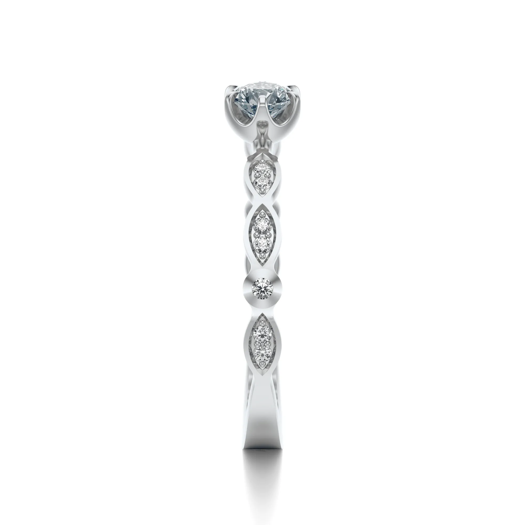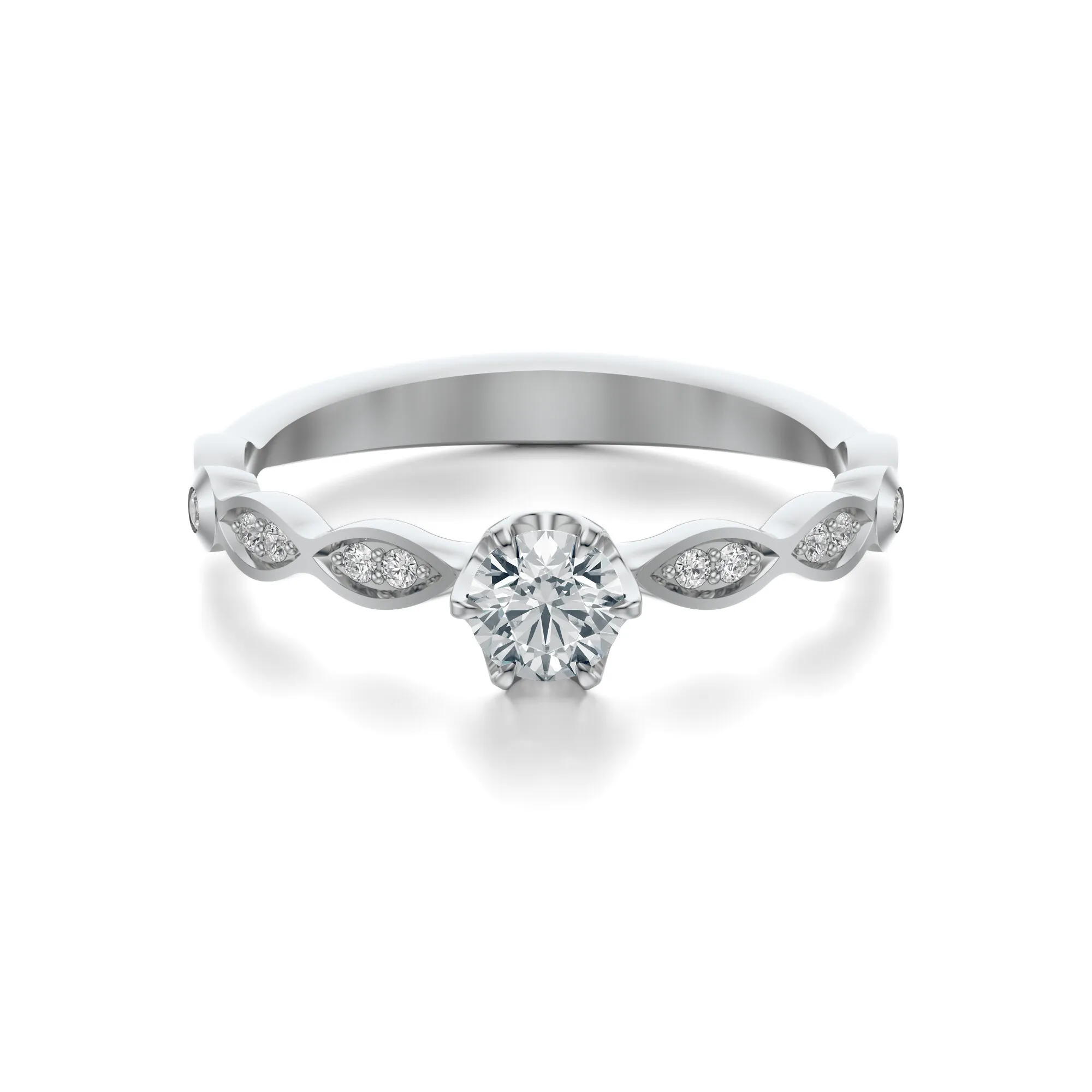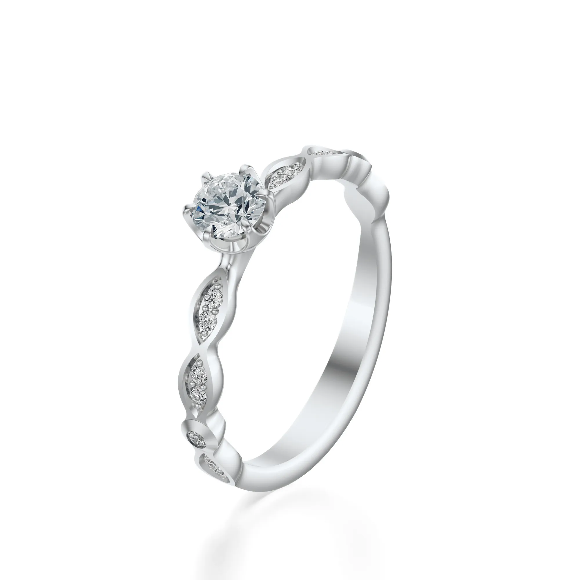 Diamenty zastosowane w tym pierścionku to kamienie o szlifie brylantowym, które zapewniają maksymalny efekt świetlny. Standardowo oferujemy parametry: czystość VS2, barwa H, szlif Excellent, masa od 0.30 do 0.70ct. Istnieje możliwość modyfikacji tych parametrów, aby dopasować biżuterię do indywidualnych oczekiwań. Każdy detal pierścionka został dopracowany zgodnie z najwyższymi standardami jubilerskimi.
