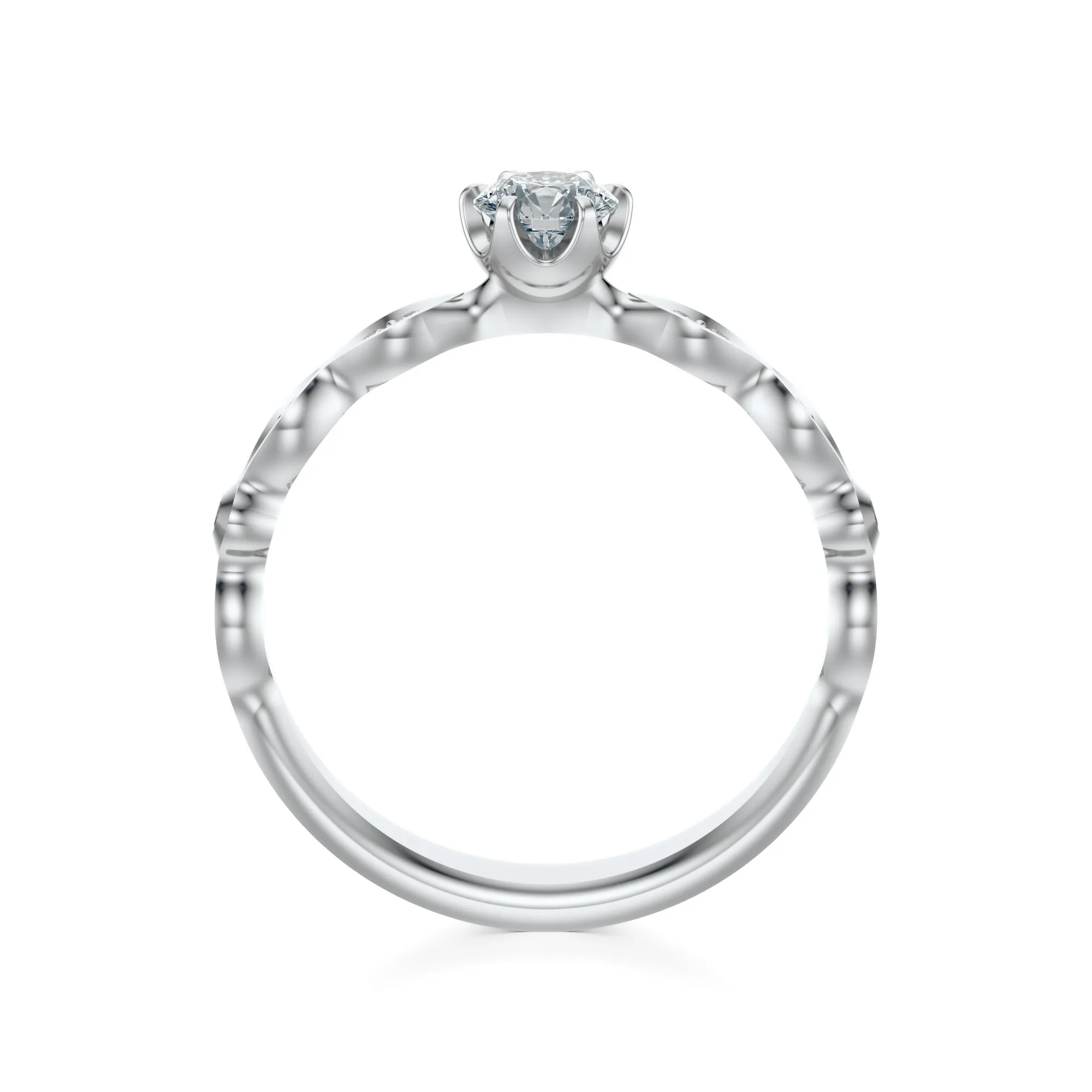 Ten pierścionek wyróżnia się nietuzinkowym designem – falowana obrączka z diamentowymi akcentami tworzy efekt płynnego ruchu, dodając kompozycji lekkości i harmonii. Idealnie sprawdzi się jako wybór dla kobiety ceniącej minimalistyczną elegancję, ale z nutą artystycznego sznytu. Symbolika zawarta w formie liści i diamentowej oprawie odnosi się do rozwoju, trwałości oraz głębokich emocji, czyniąc ten model doskonałym pierścionkiem zaręczynowym lub prezentem na wyjątkowe okazje, takie jak rocznice czy jubileusze.