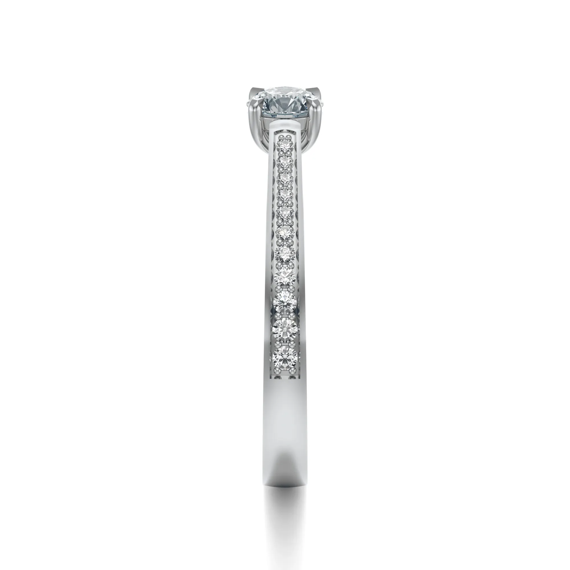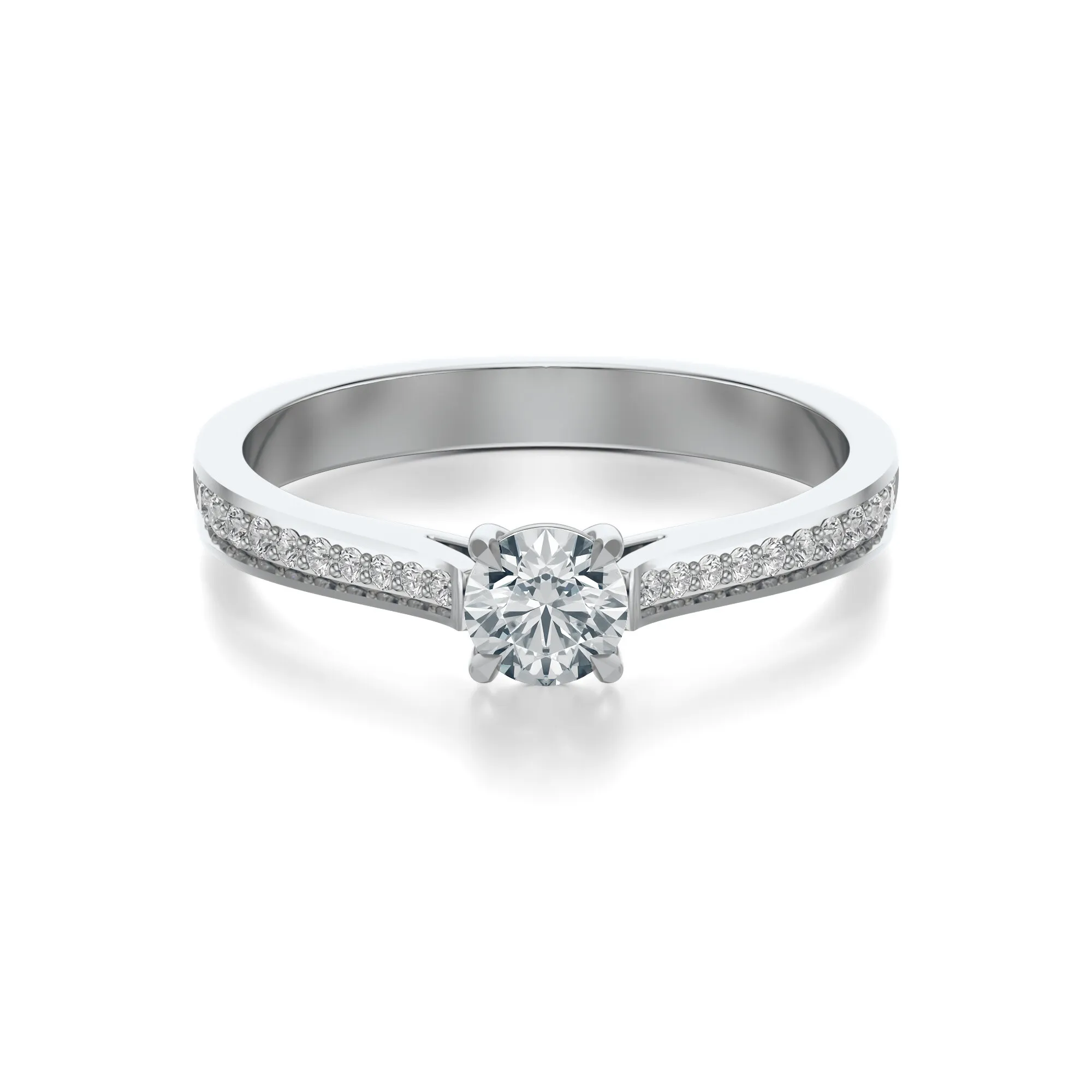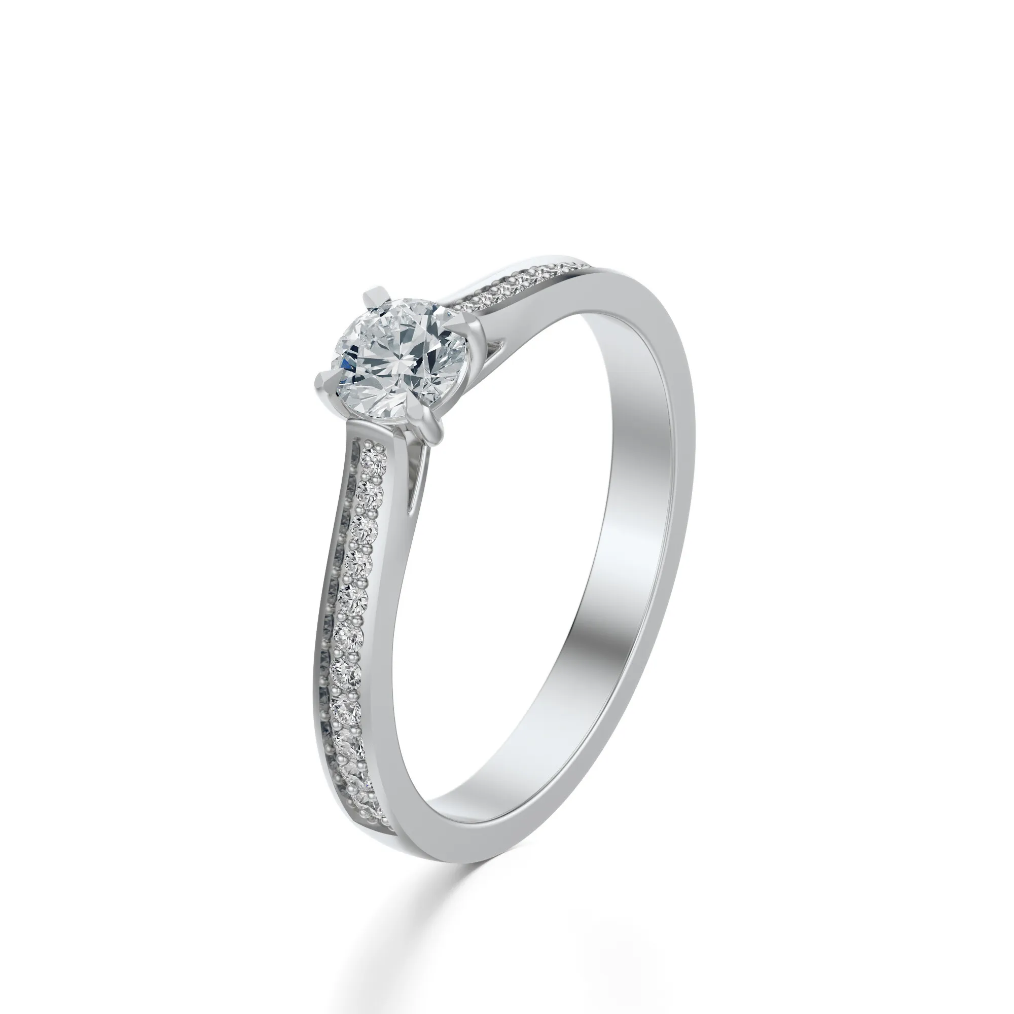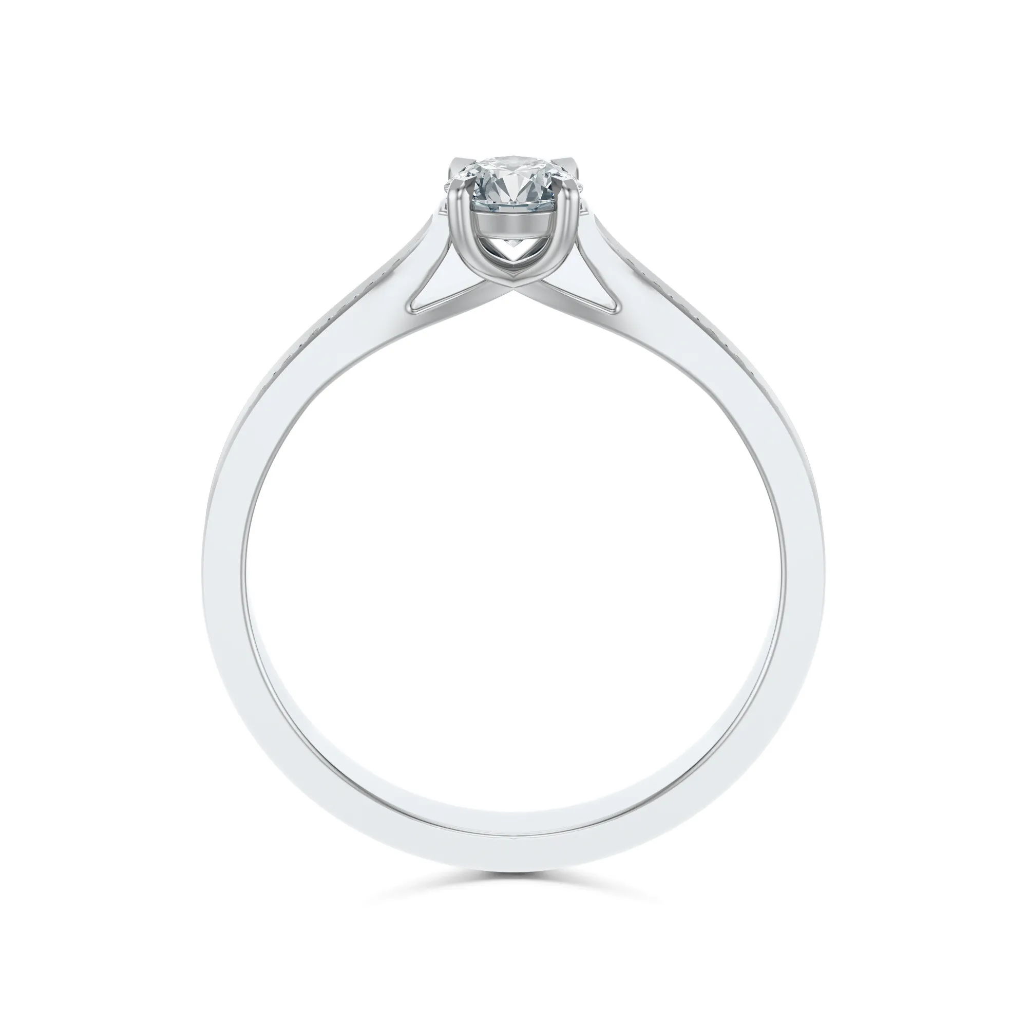Okrągły szlif głównego diamentu, połączony z czystością VS2, barwą H i klasą szlifu Excellent, gwarantuje olśniewający połysk przy każdym ruchu dłoni. Masa kamieni głównych dostępna jest w wersjach: 0.30, 0.40, 0.50 i 0.70ct, z możliwością dostosowania do indywidualnych oczekiwań.