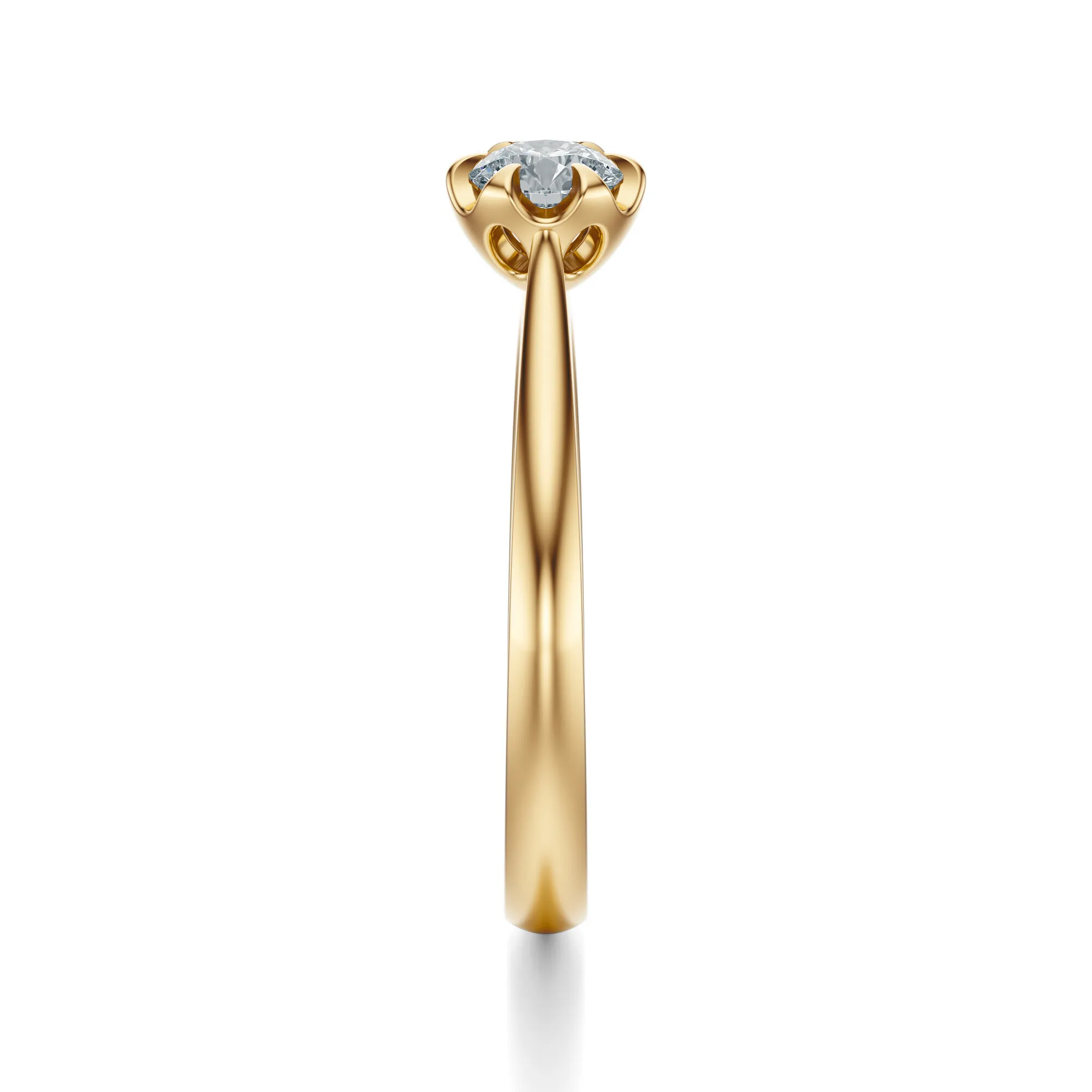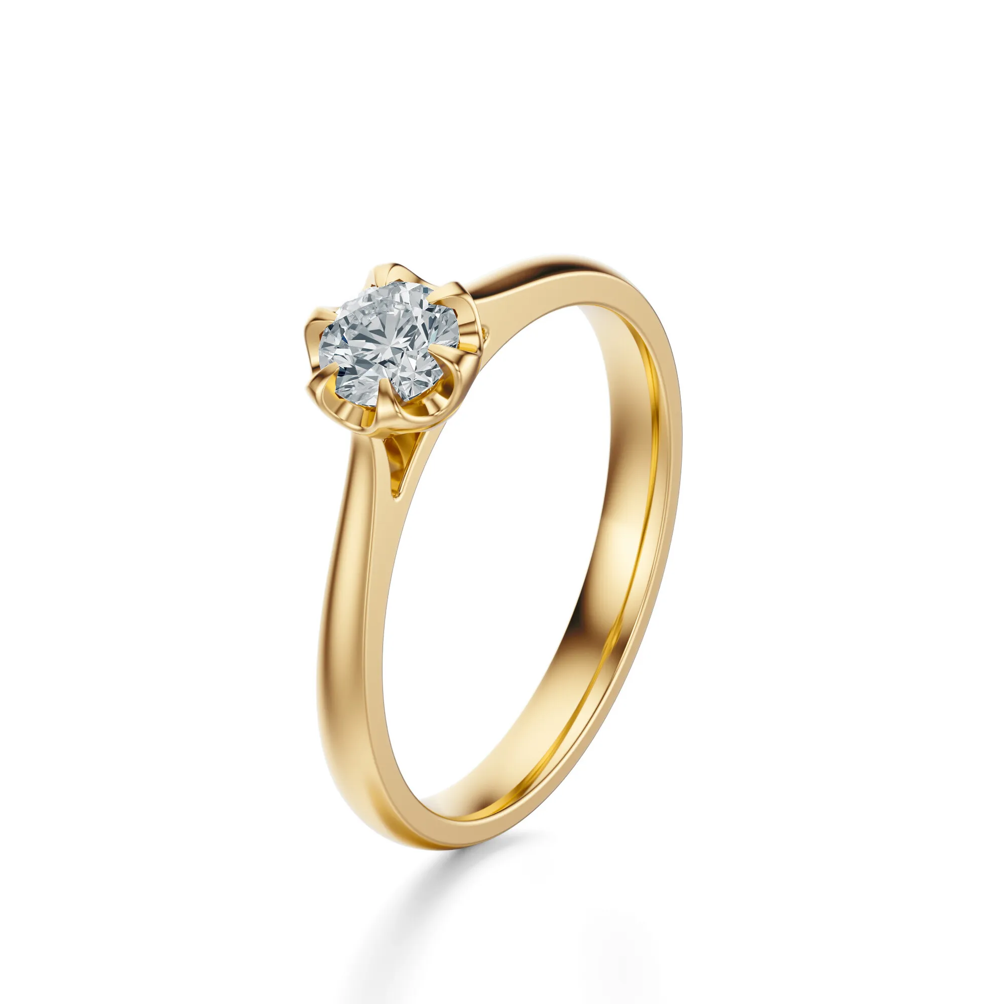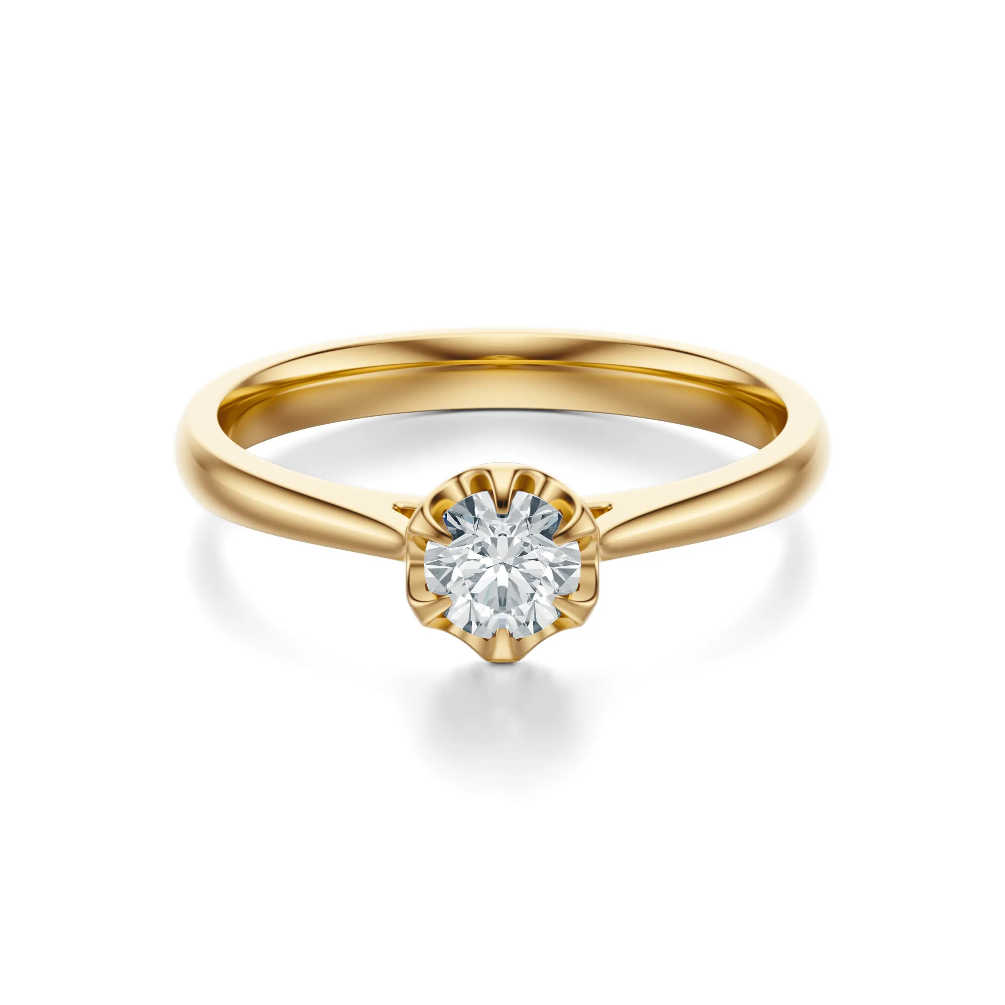 Ten elegancki pierścionek zaręczynowy wykonany z żółtego złota o próbie 585 zachwyca subtelnym blaskiem i szlachetnym wykończeniem. Jego wyrafinowana forma podkreślona została centralnym, okrągłym diamentem, osadzonym w unikalnej koronie przypominającej płatki kwiatu – to projekt, który łączy w sobie klasykę z wyjątkowym, artystycznym akcentem.