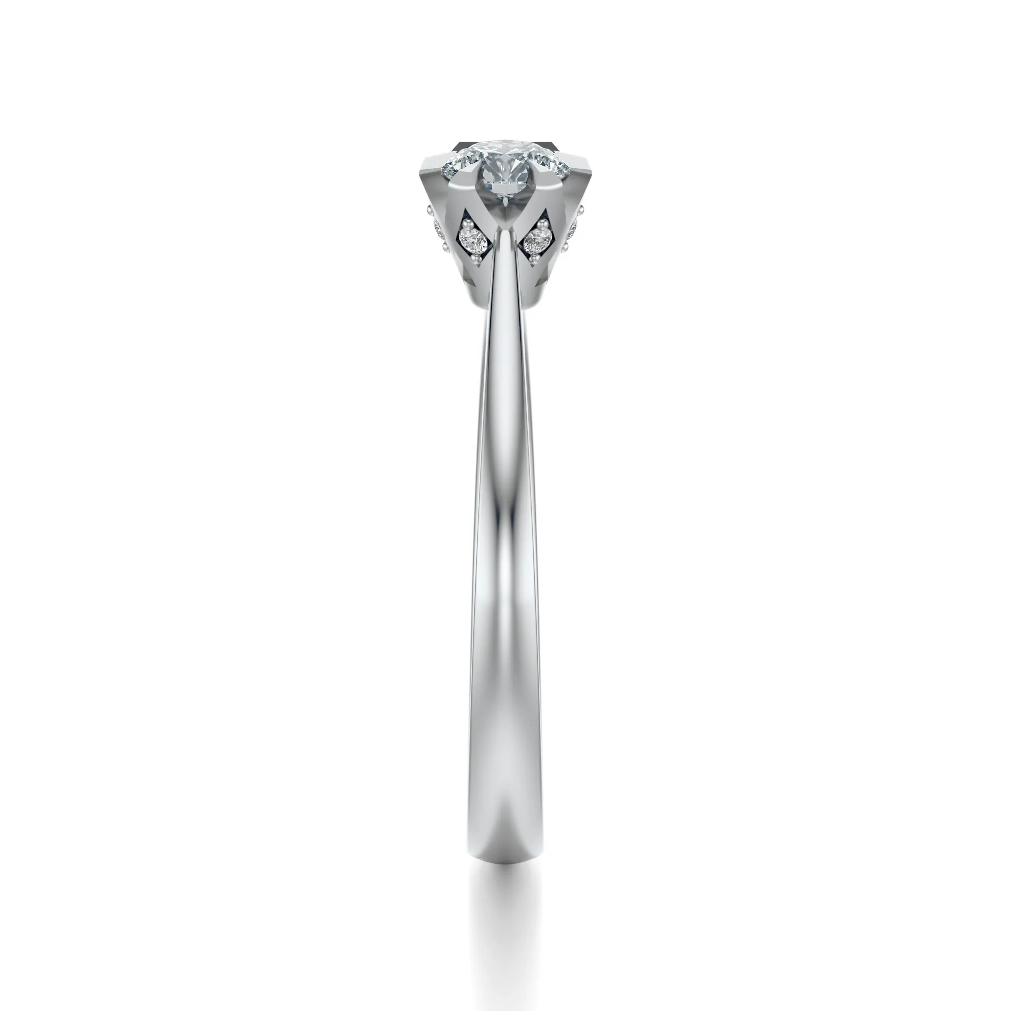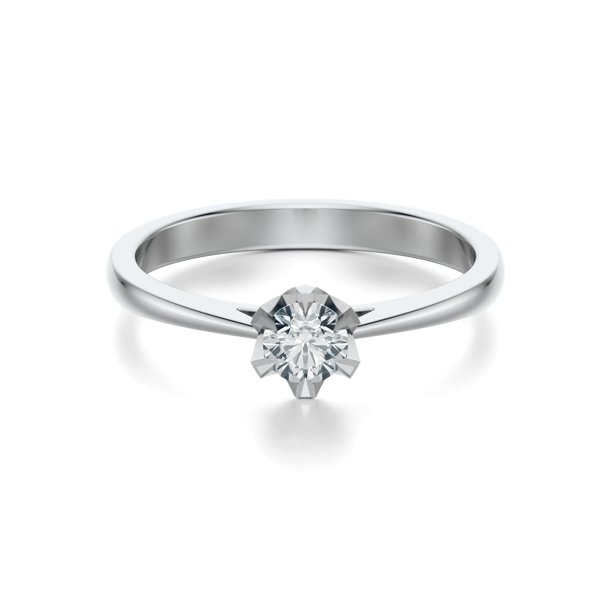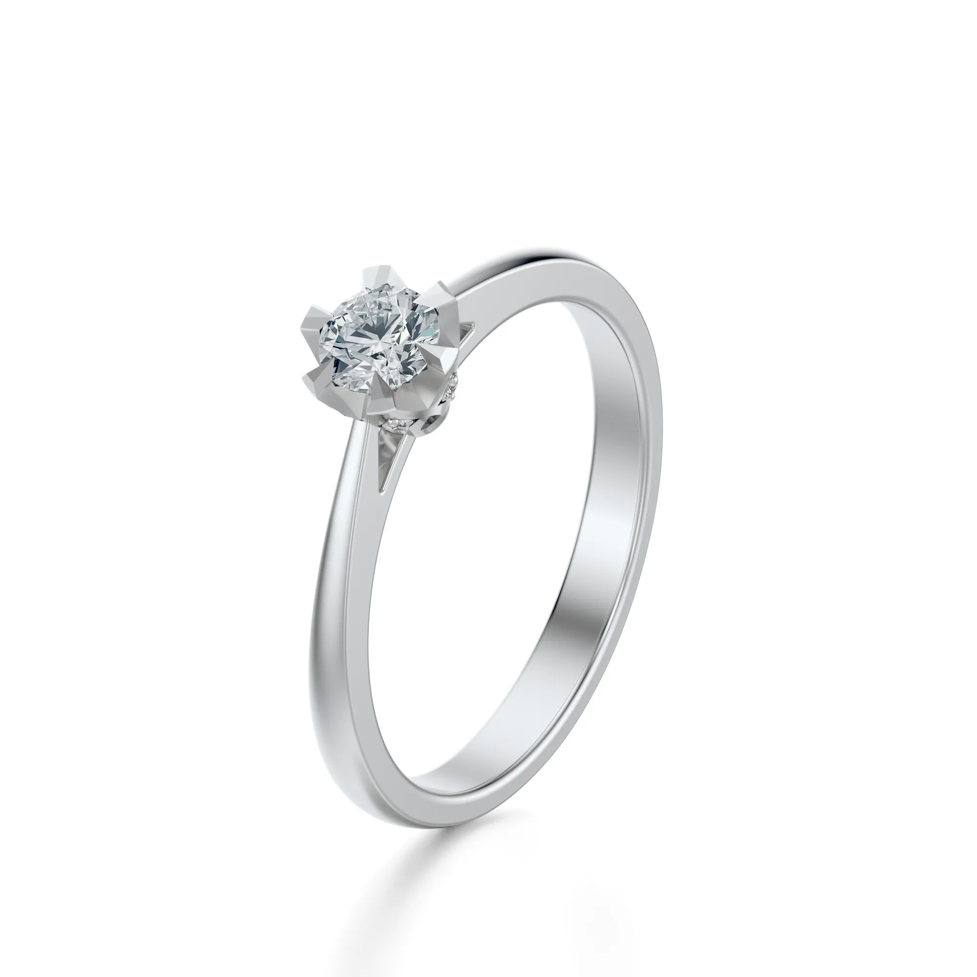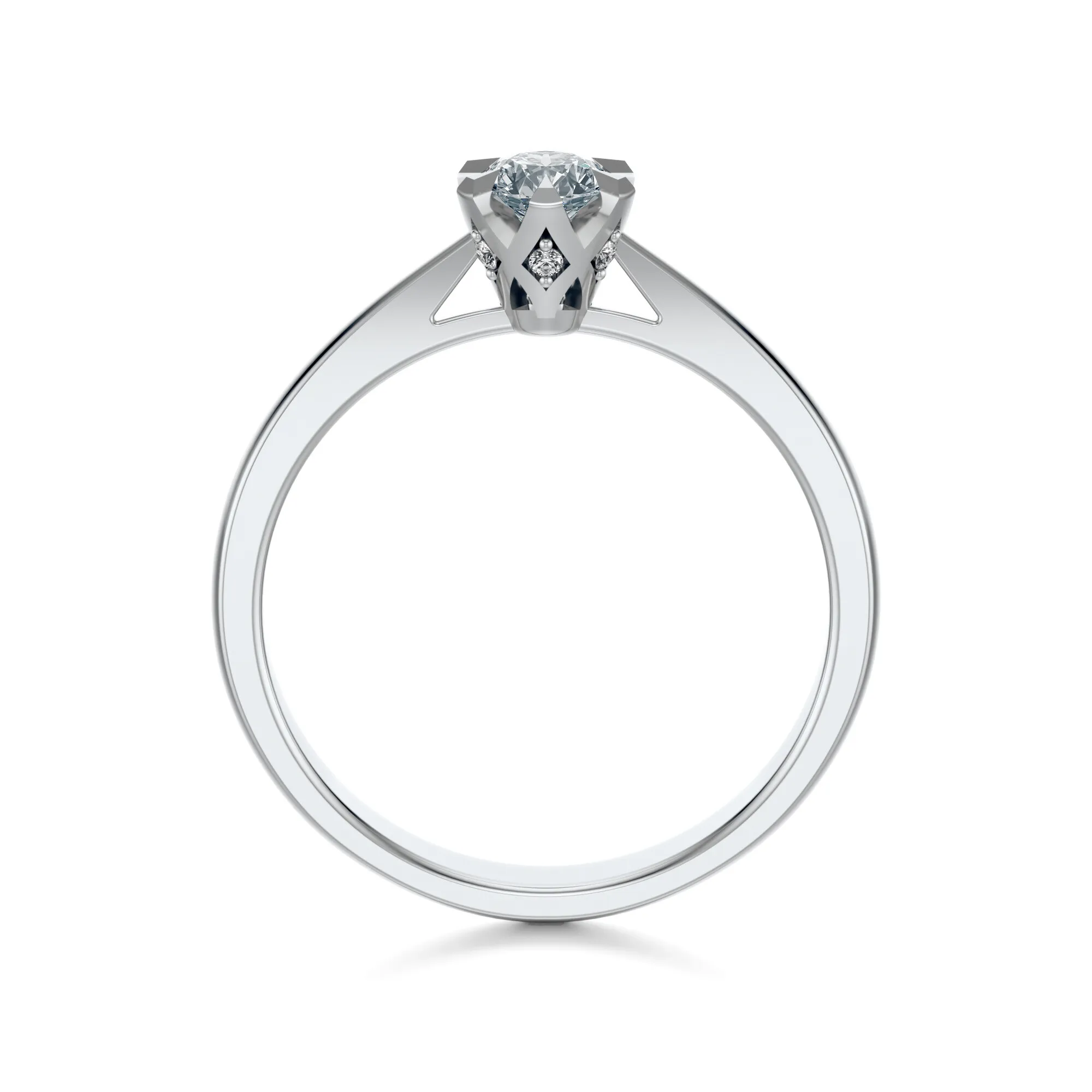 Na uwagę zasługuje nie tylko czysty design, lecz także wyjątkowa oprawa kamienia przypominająca delikatny kwiat. Ułożenie dodatkowych, mniejszych diamentów pod oprawą główną tworzy iluzję świetlnej korony – to detale, które nadają pierścionkowi unikalnego charakteru i głębi. Idealny wybór dla kobiet ceniących elegancję z nutą współczesnej subtelności.