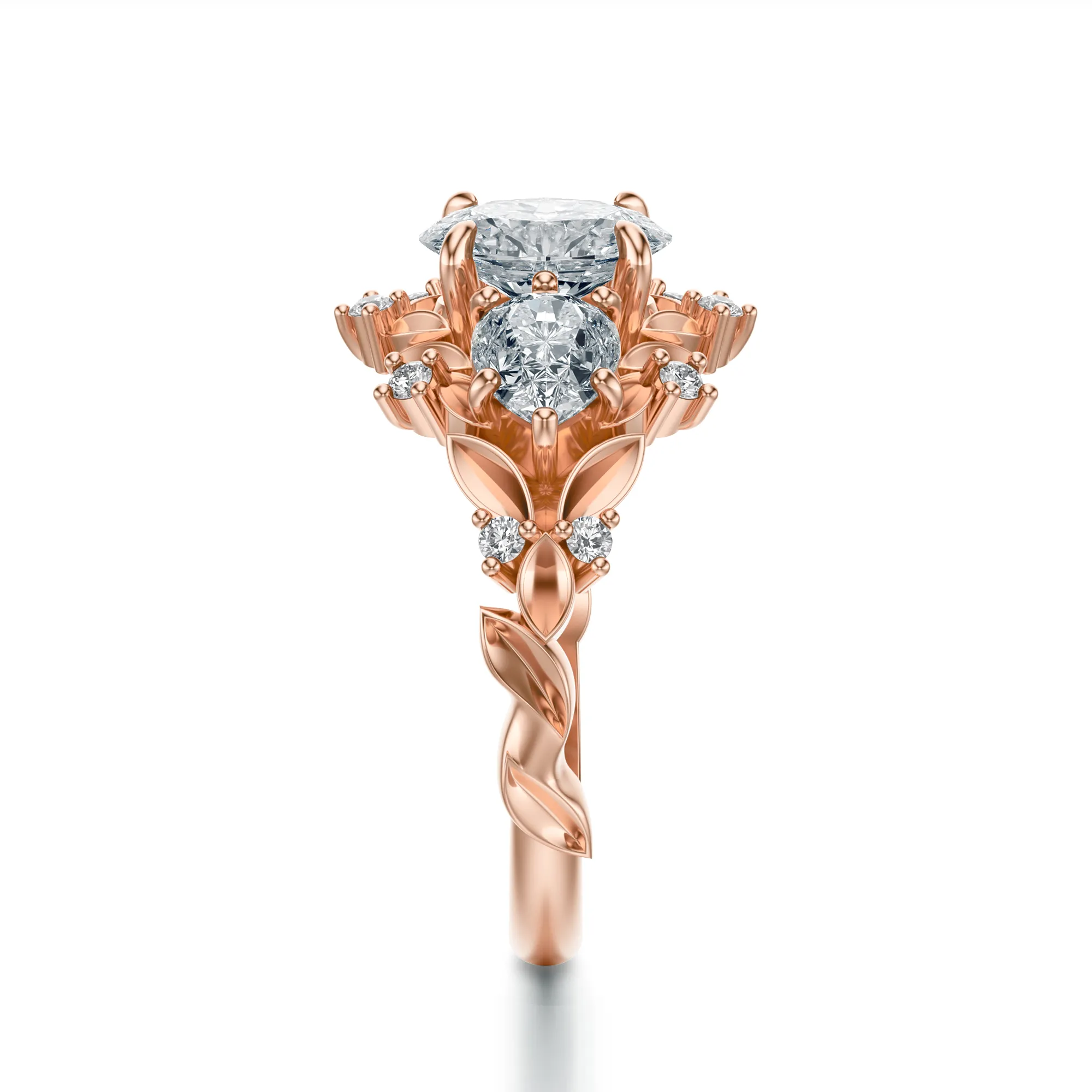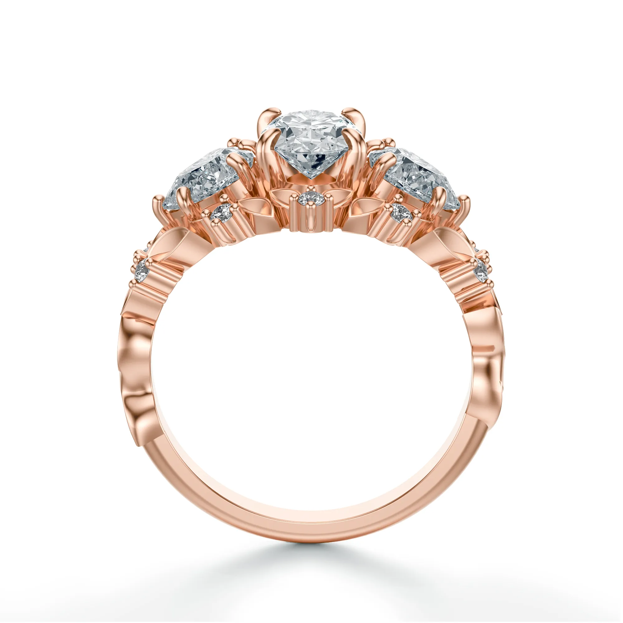 Delikatne listki i drobne, okrągłe diamenty zdobiące obrączkę nadają pierścionkowi romantyczny, niemal vintage’owy charakter. Idealny dla kobiet, które kochają klasykę z nutą artystycznej fantazji i niebanalnego wykończenia. Symbolika trzech kamieni doskonale wpisuje się w przekaz: przeszłość, teraźniejszość i przyszłość — to piękna metafora wspólnej drogi i trwałości uczuć. Pierścionek idealnie sprawdzi się jako niepowtarzalna propozycja zaręczynowa lub prezent z okazji rocznicy czy jubileuszu.