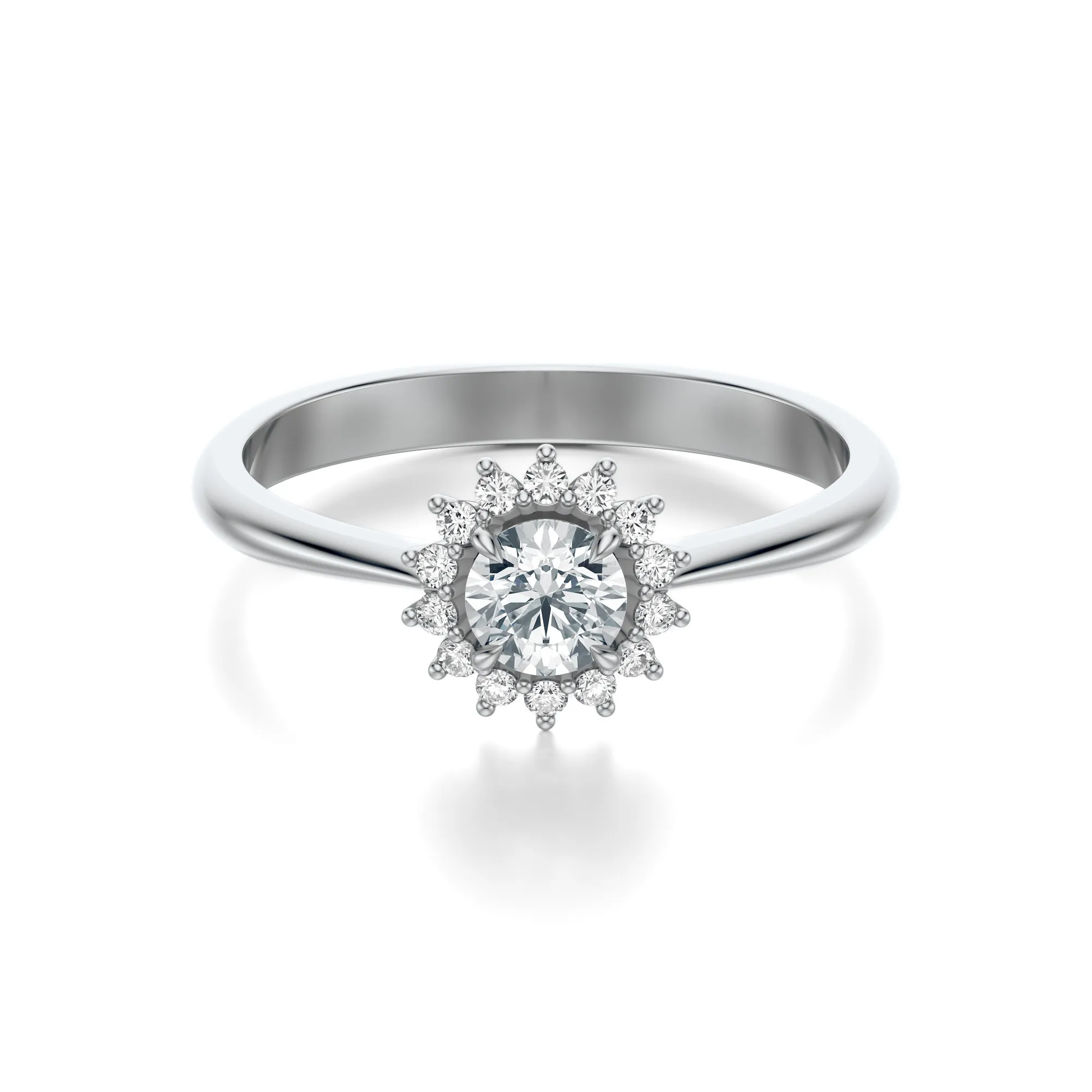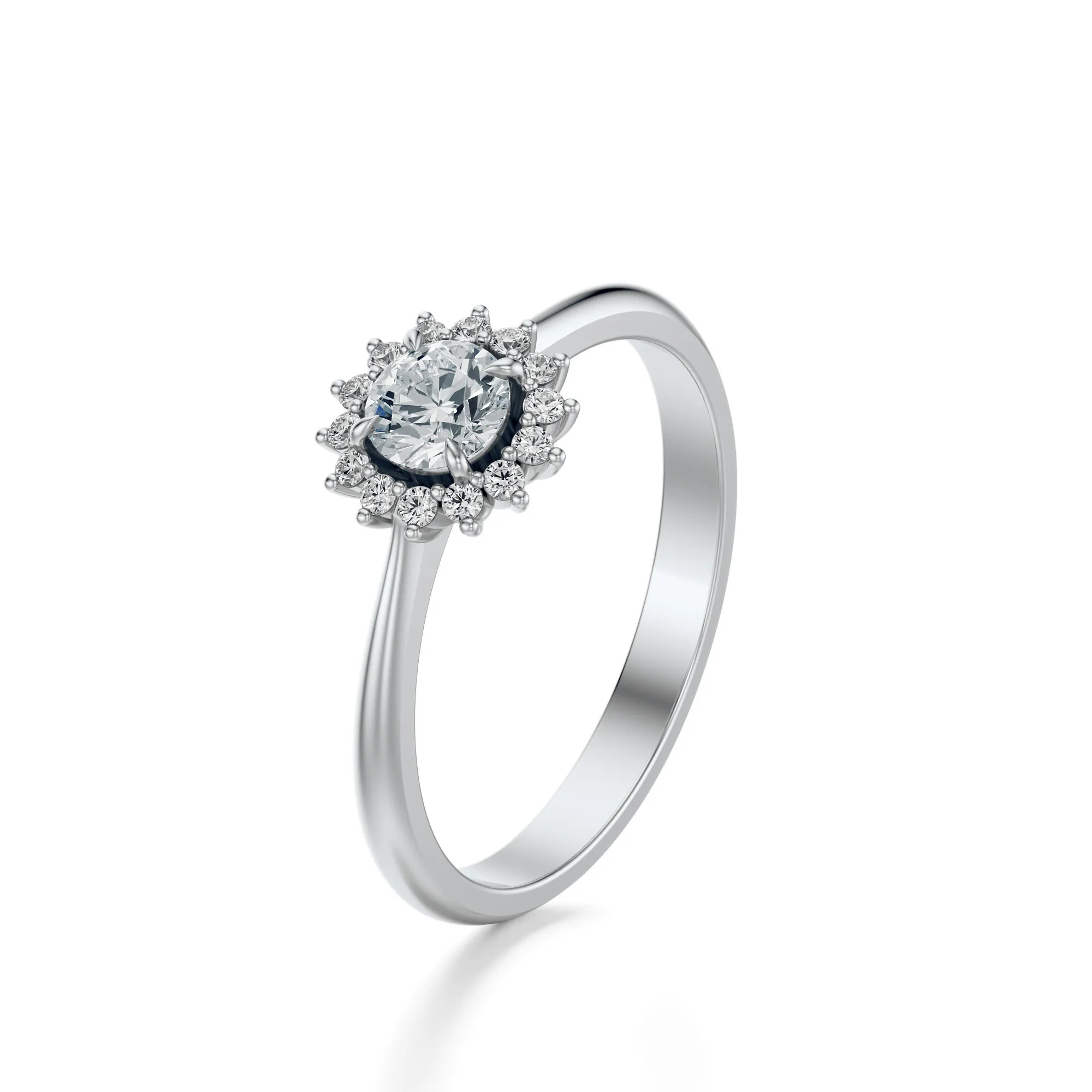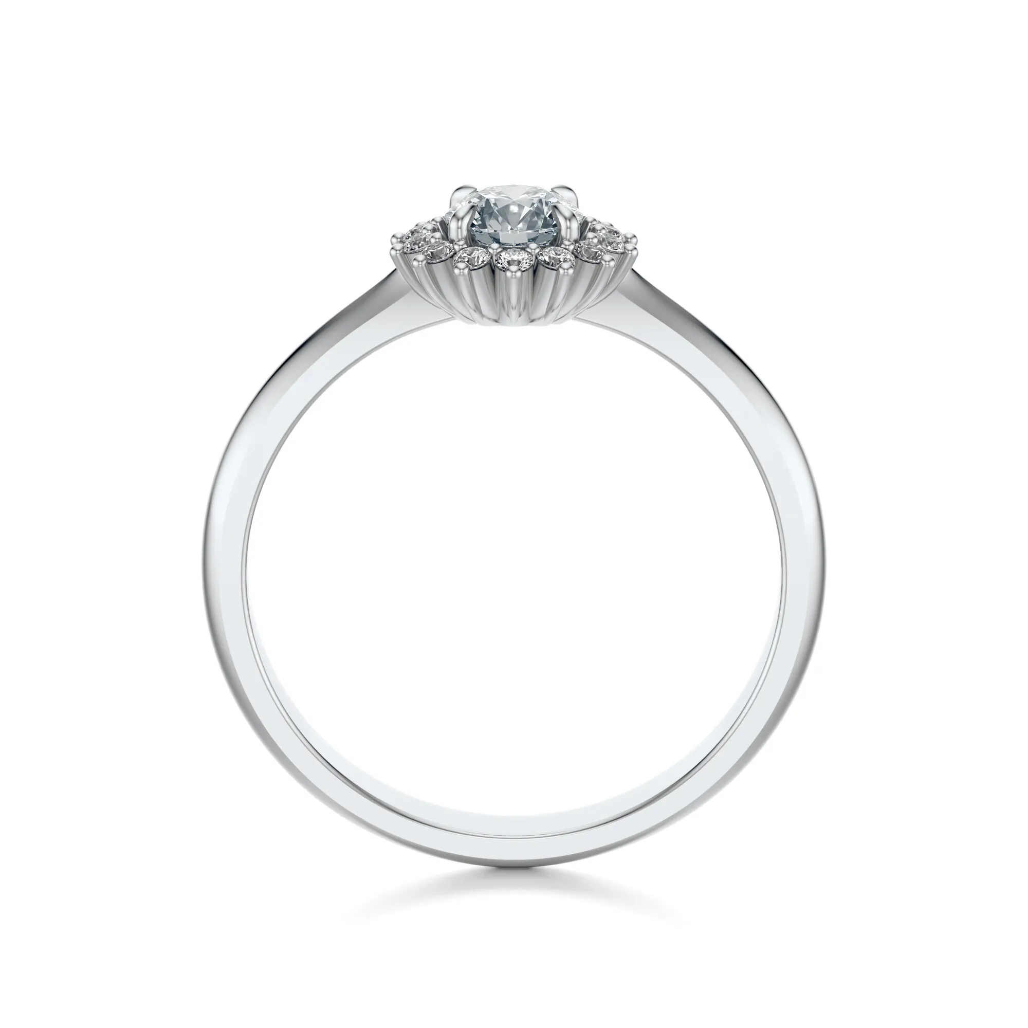 Wyjątkowo elegancki pierścionek wykonany z białego złota o próbie 585 zachwyca wyrafinowanym blaskiem i subtelną estetyką. W centrum kompozycji znajduje się olśniewający diament w klasycznym okrągłym szlifie, otoczony misterną koroną mniejszych kamieni, które wspólnie tworzą efekt rozkwitającego kwiatu. Delikatna i smukła obrączka z połyskującego białego złota podkreśla luksusowy charakter całości.