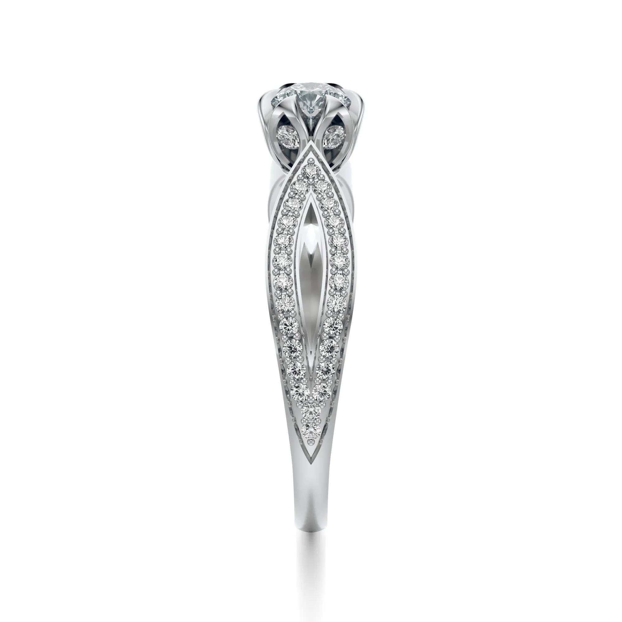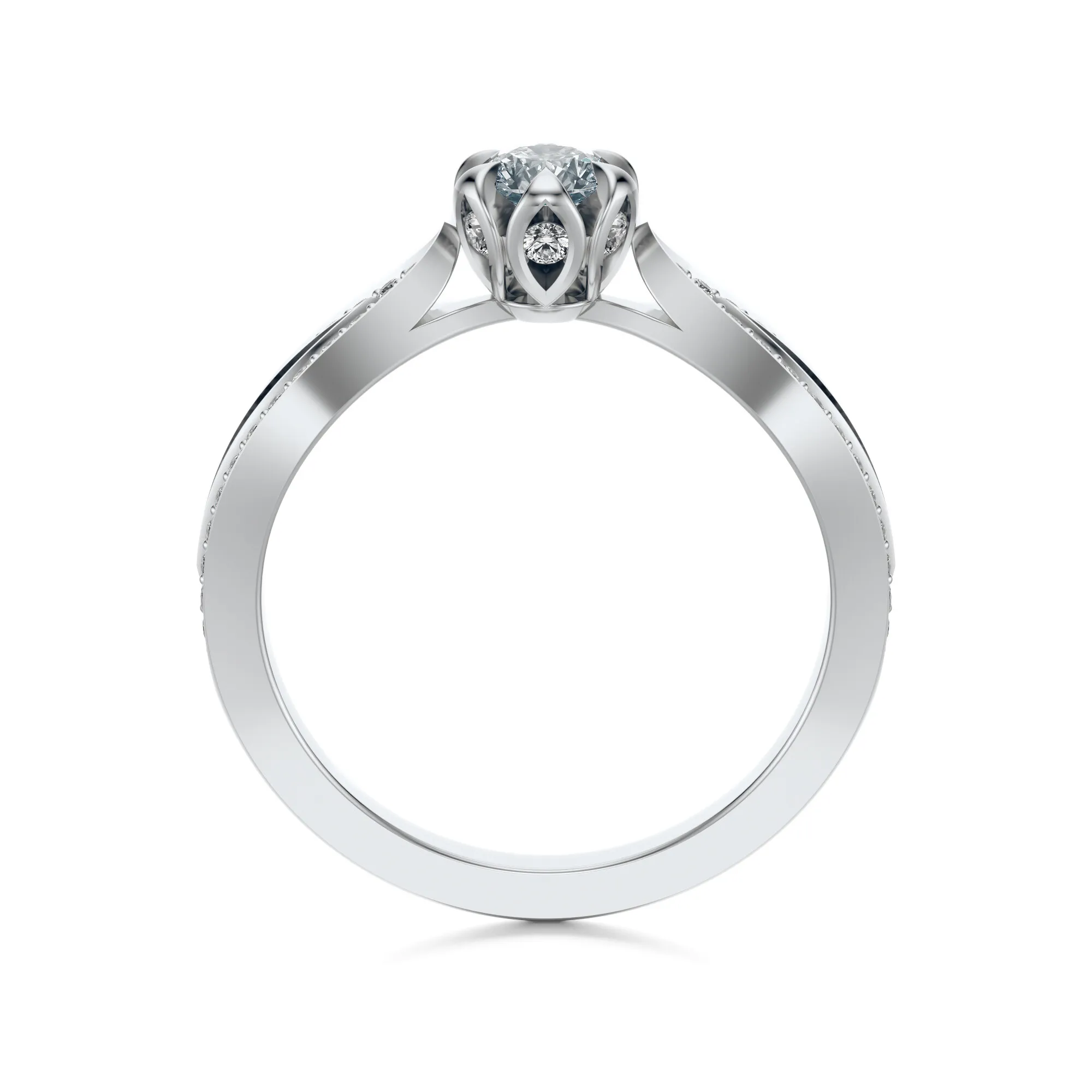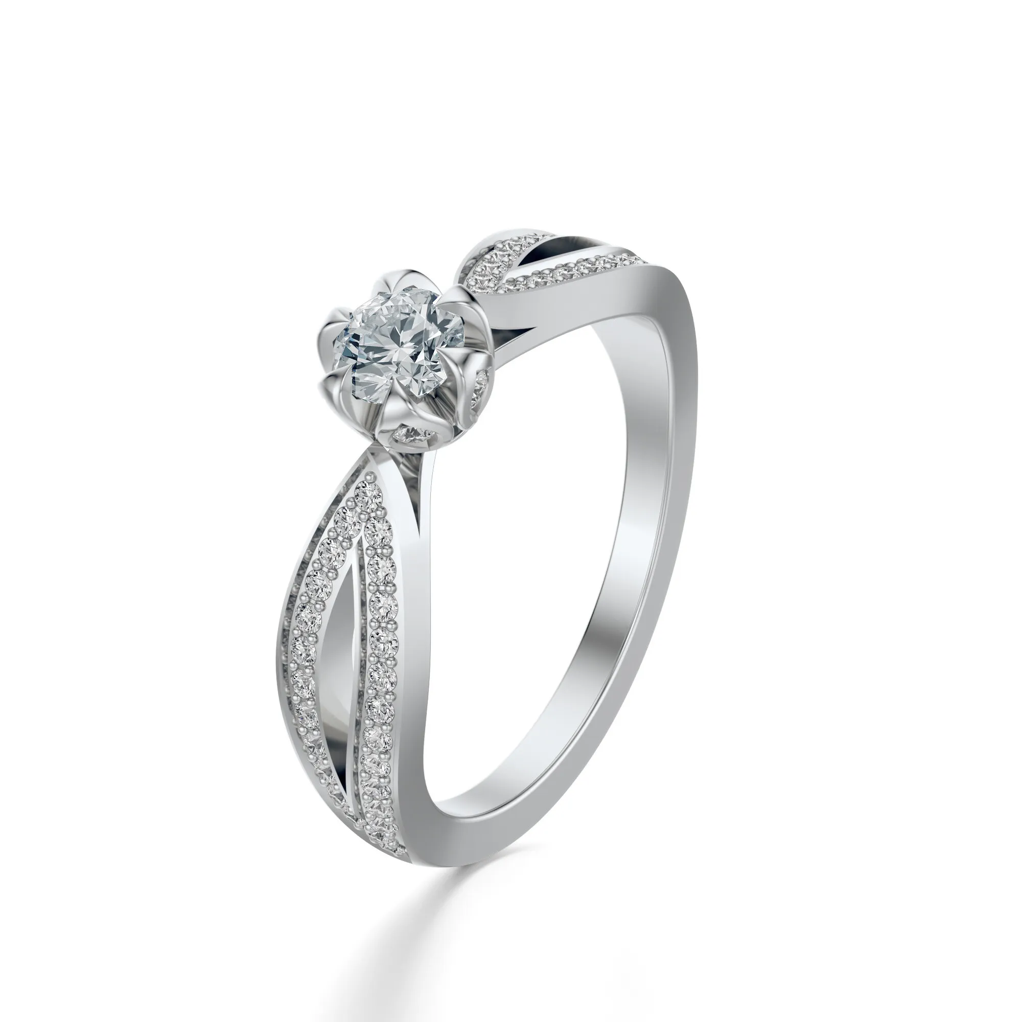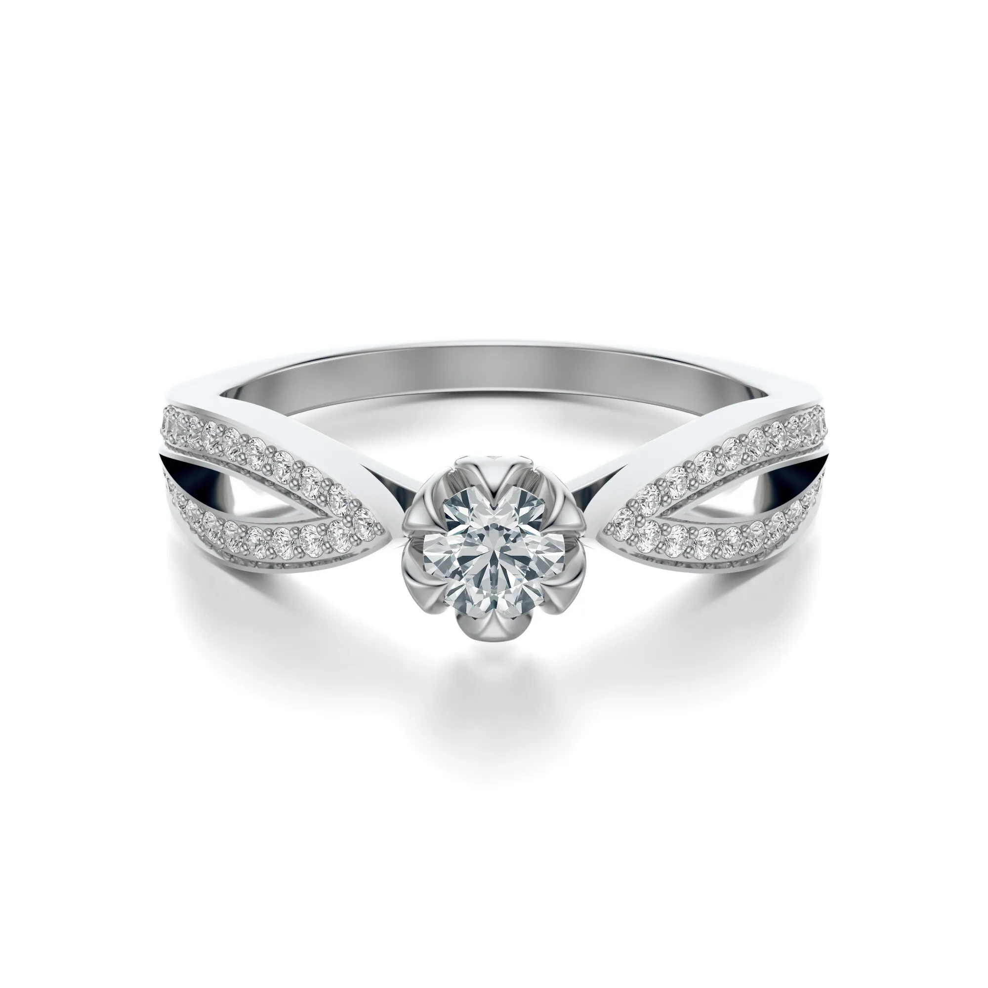 Ten wykwintny pierścionek z białego złota o próbie 585 przyciąga spojrzenia wyrafinowaną formą i olśniewającym blaskiem diamentów. Wykonany z dbałością o najdrobniejsze detale, zachwyca zarówno subtelnością, jak i wyrazistym stylem. Centralny diament w klasycznym, okrągłym szlifie osadzony jest w ażurowej koronie w kształcie rozkwitającego kwiatu, który delikatnie unosi się ponad misternie zaprojektowaną szyną ozdobioną dziesiątkami drobnych kamieni.