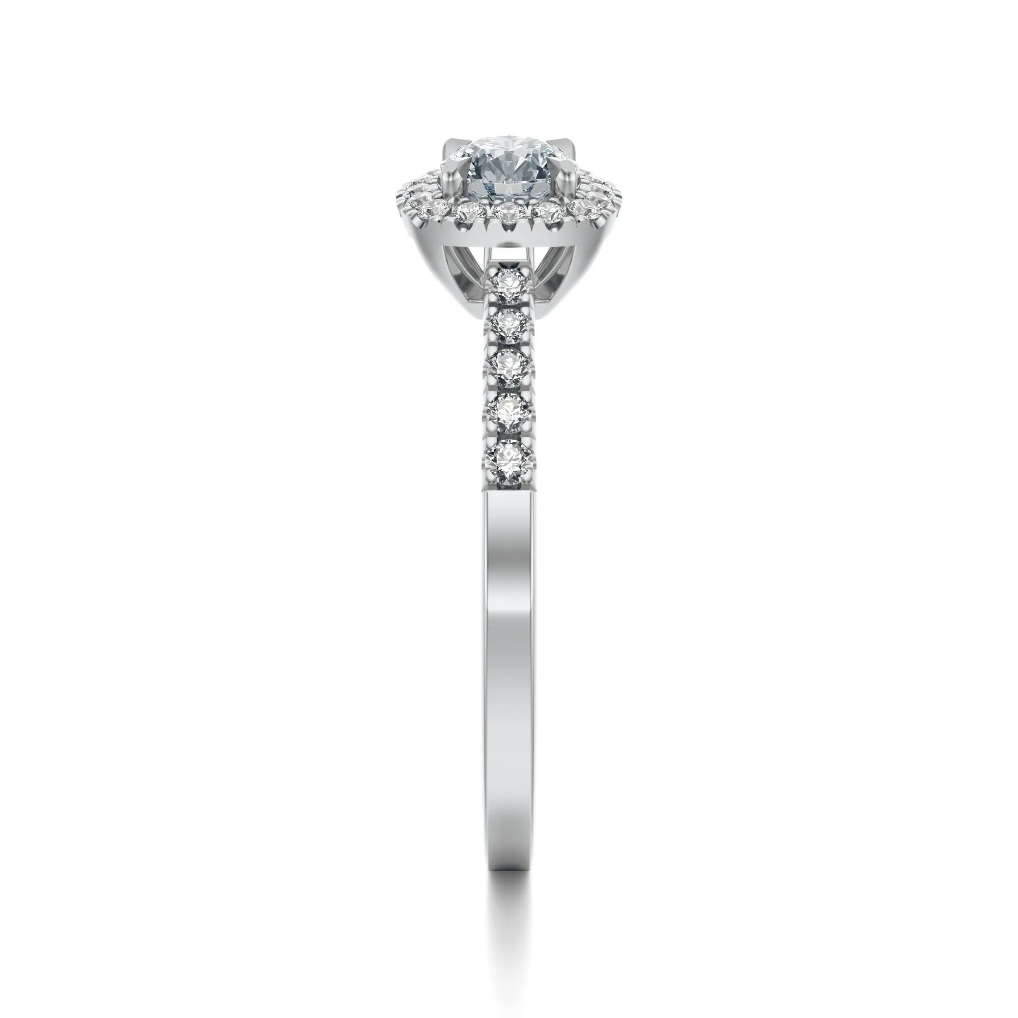 Ten olśniewający pierścionek z białego złota to połączenie wyrafinowanego stylu i mistrzowskiego rzemiosła. Wykonany ze złota o próbie 585, zachwyca chłodną, elegancką tonacją oraz intensywnym blaskiem doskonale oszlifowanych diamentów. Centralny kamień otoczony jest subtelną oprawą z drobniejszych diamentów, które płynnie przechodzą w zdobioną oprawę obrączki – całość tworzy harmonijną i luksusową kompozycję.