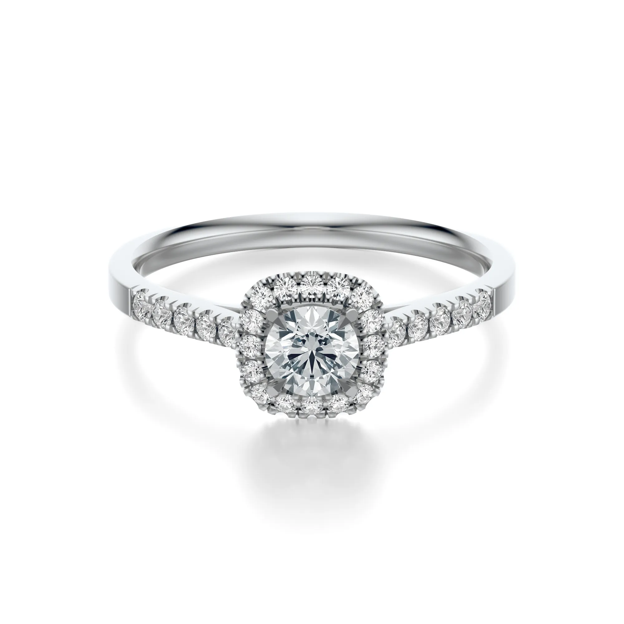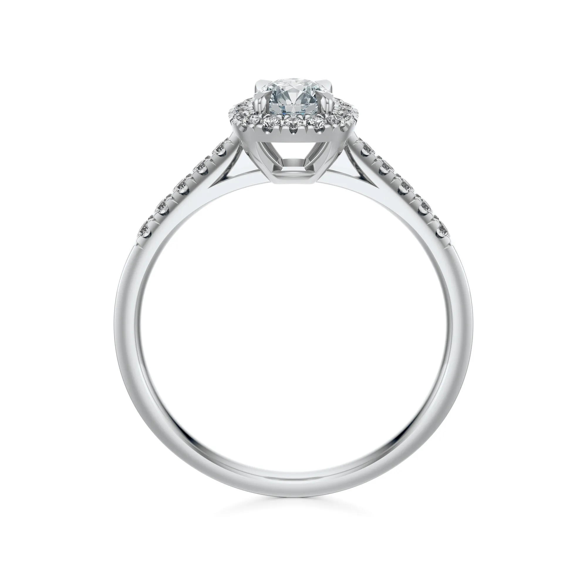 Centralny diament o okrągłym szlifie w klasie Excellent wyróżnia się nieskazitelną czystością (VS2) oraz subtelnym kolorem (barwa H). Otaczające go mniejsze kamienie tworzą efekt halo, potęgując jego blask i optycznie zwiększając rozmiar. Masa centralnego kamienia dostępna jest w przedziałach 0.30, 0.40, 0.50 oraz 0.70 ct – z możliwością zmiany wedle życzenia klienta.