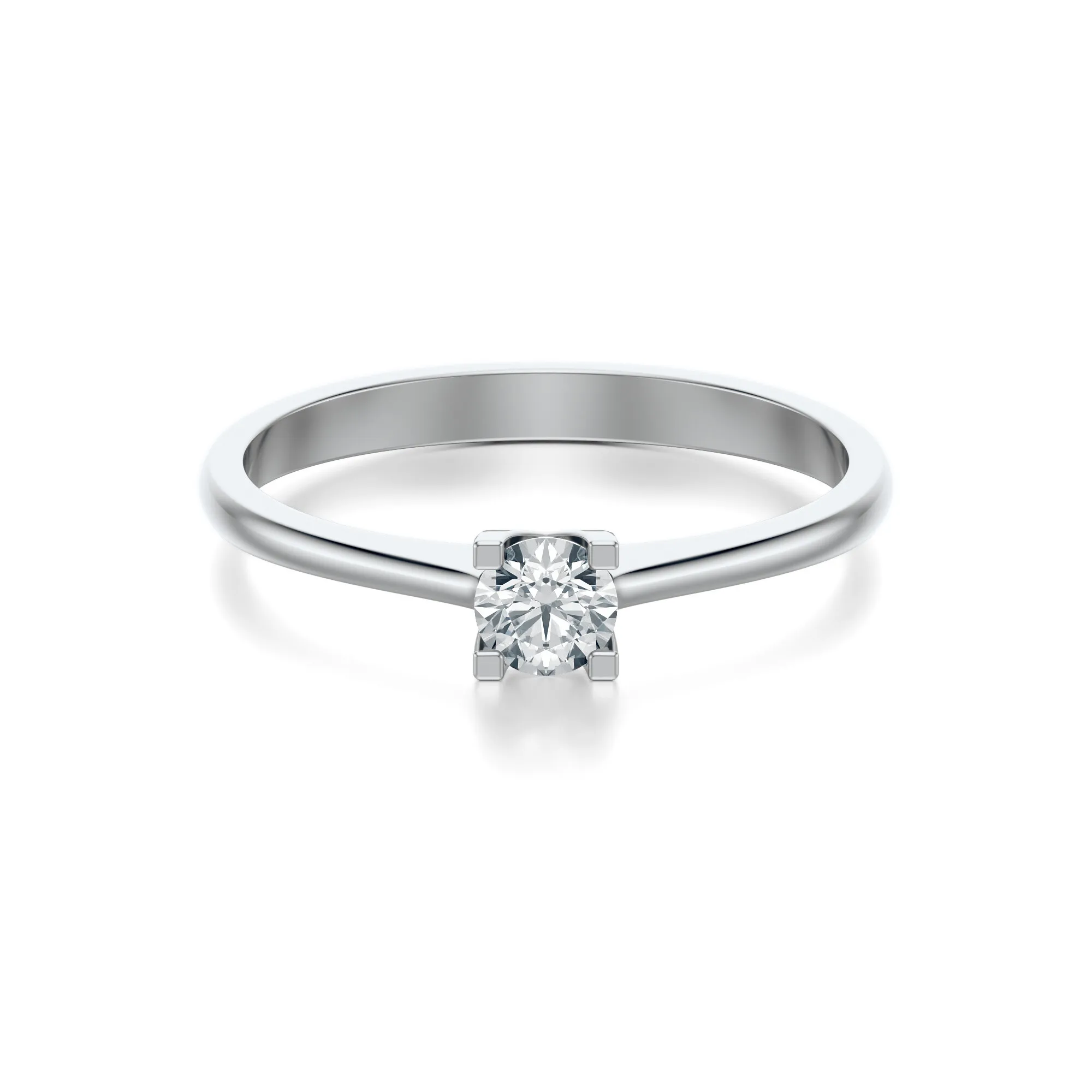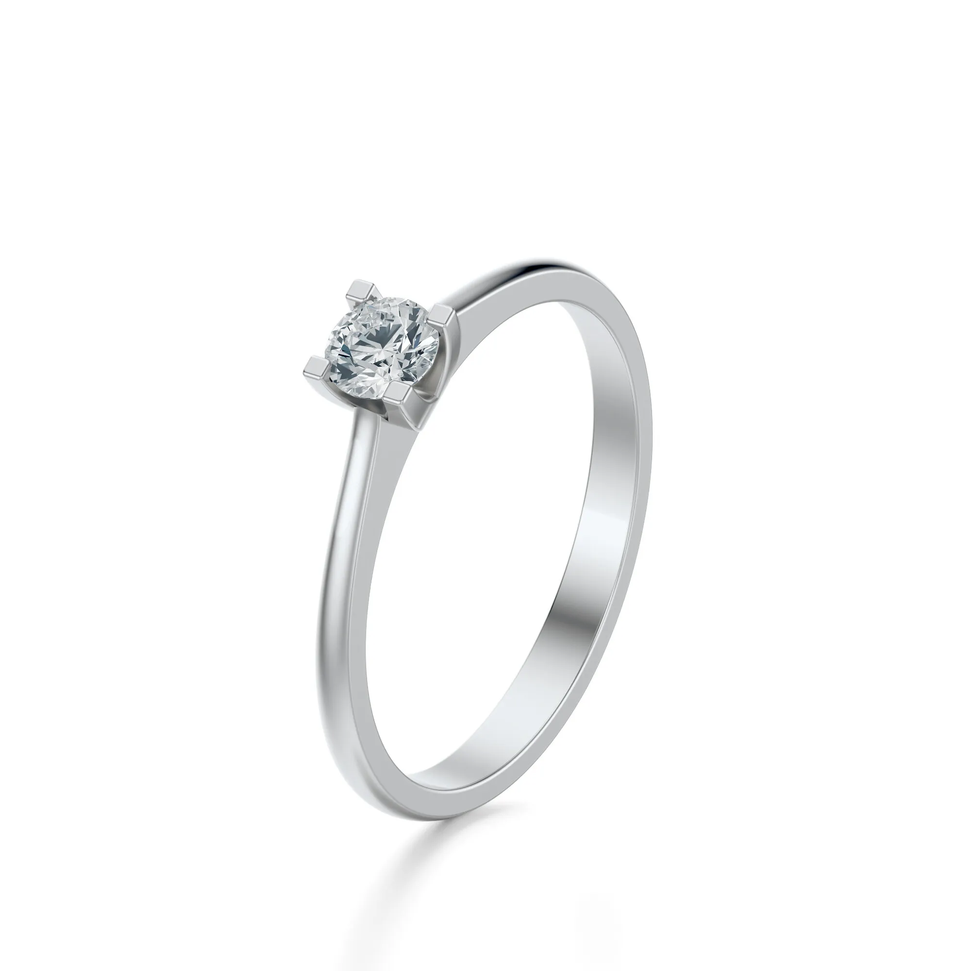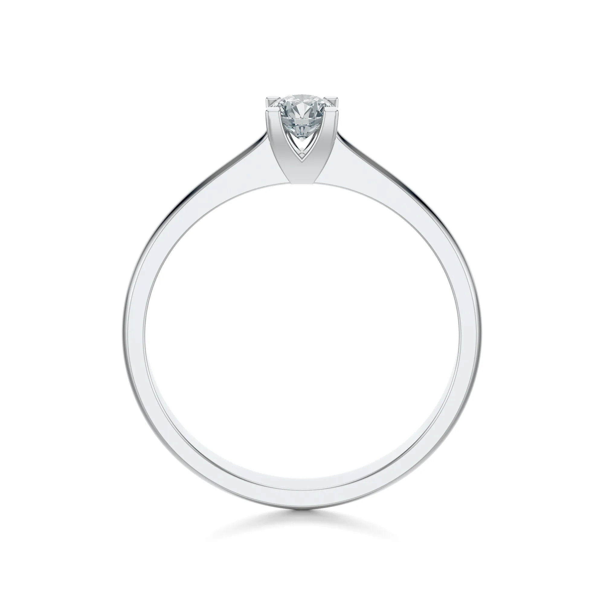 Wyjątkowy pierścionek z białego złota o próbie 585 urzeka minimalistyczną elegancją i subtelnym blaskiem. Jego sercem jest perfekcyjnie oszlifowany, okrągły diament, którego intensywny połysk doskonale kontrastuje z chłodnym, szlachetnym odcieniem metalu. Geometryczna oprawa czterech łapek nadaje kompozycji nowoczesnego wyrazu, jednocześnie podkreślając czystość i symetrię kamienia.