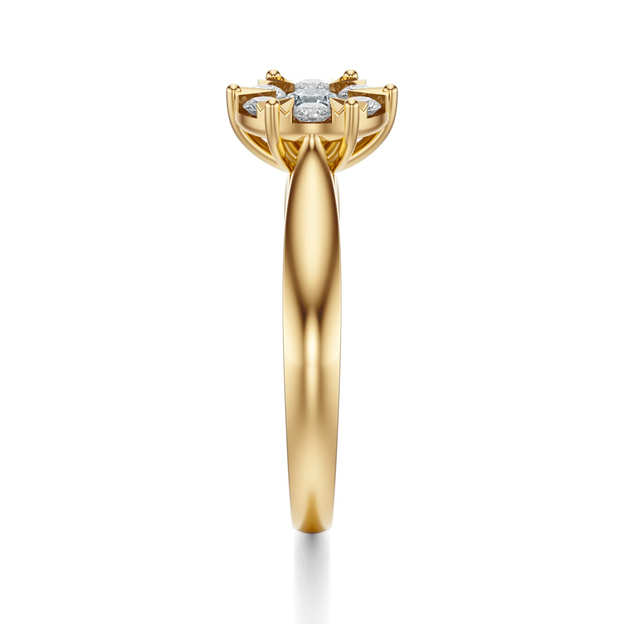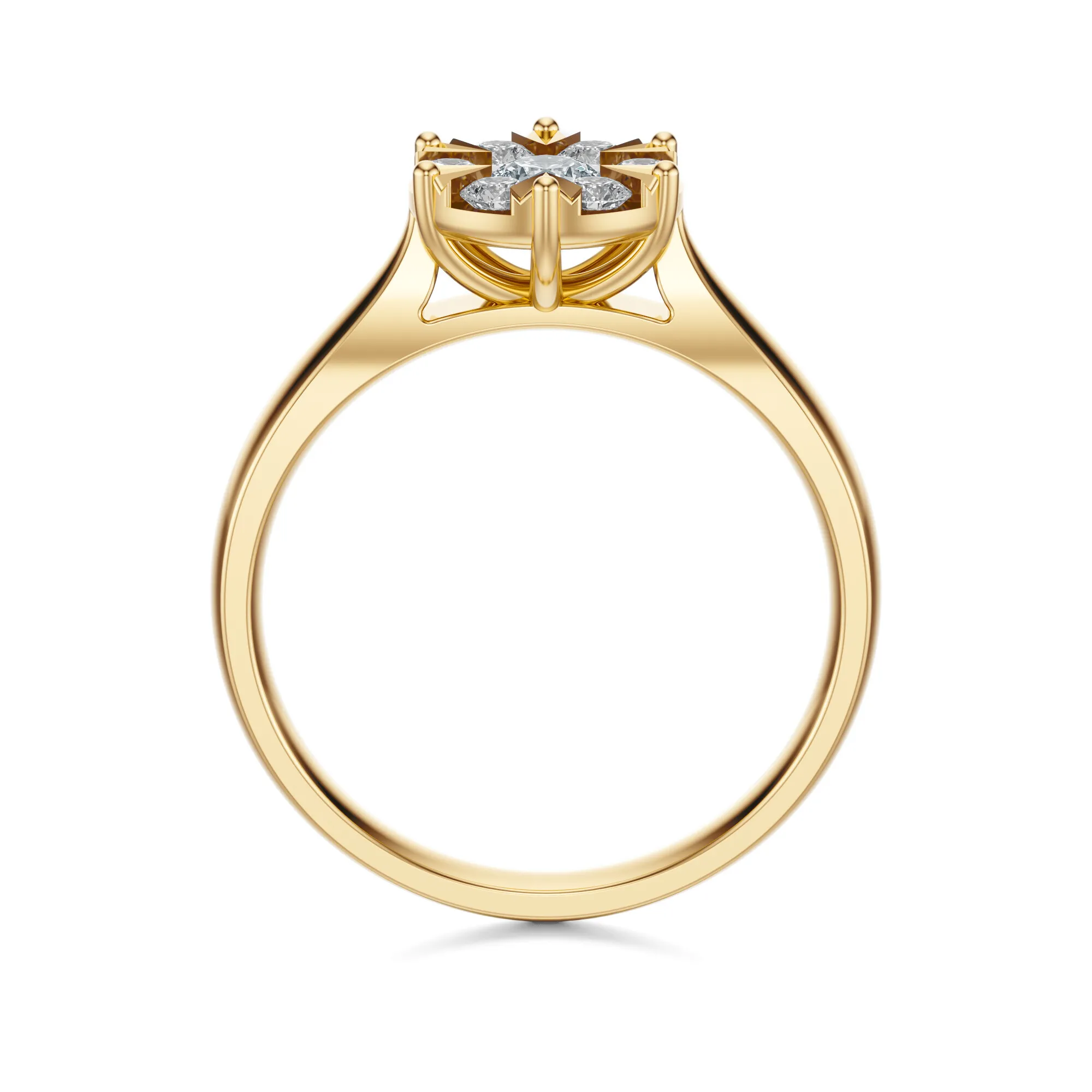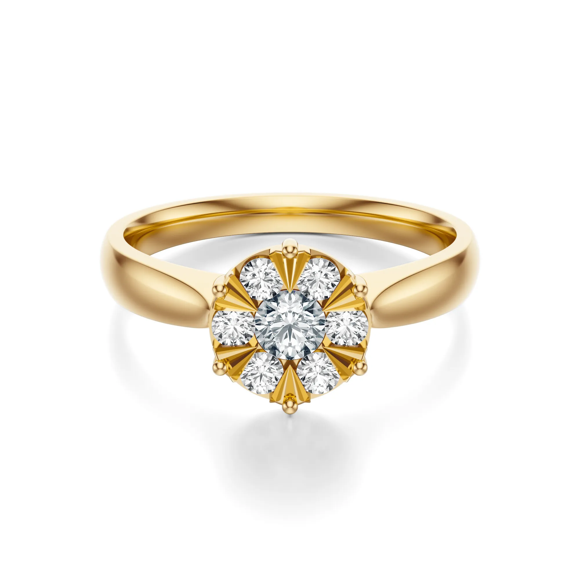 Ten zachwycający pierścionek zaręczynowy emanuje ponadczasową elegancją i luksusowym blaskiem. Wykonany ze złota o próbie 585 w ciepłym, żółtym odcieniu, stanowi doskonałą oprawę dla olśniewających okrągłych diamentów, które tworzą efektowną kompozycję kwiatową. Połączenie klasycznego metalu z promiennymi kamieniami tworzy wyrafinowany i niezwykle kobiecy projekt, który zachwyca już od pierwszego spojrzenia.