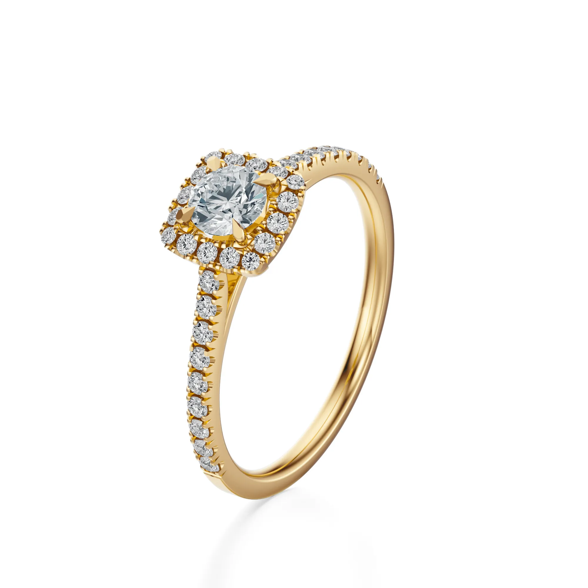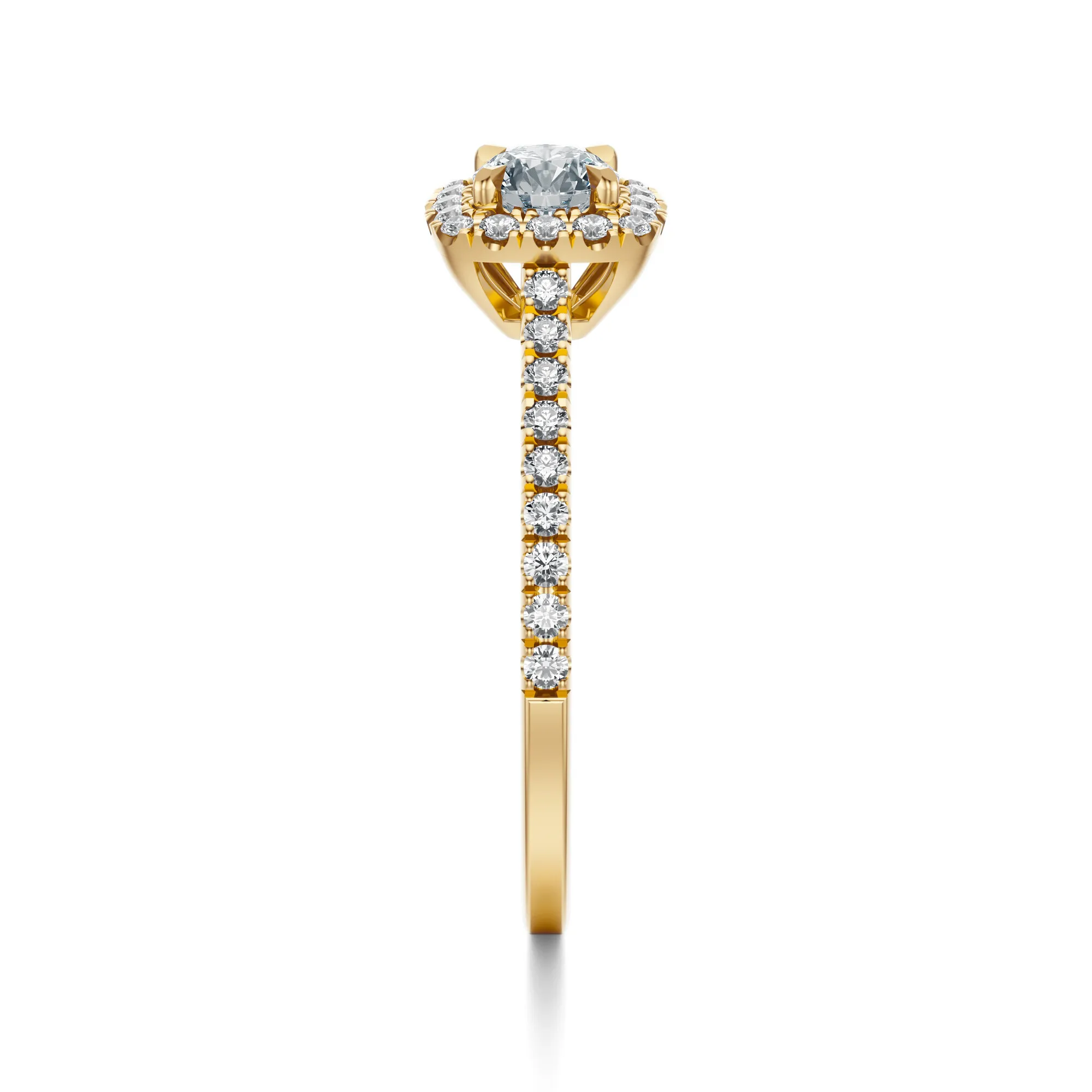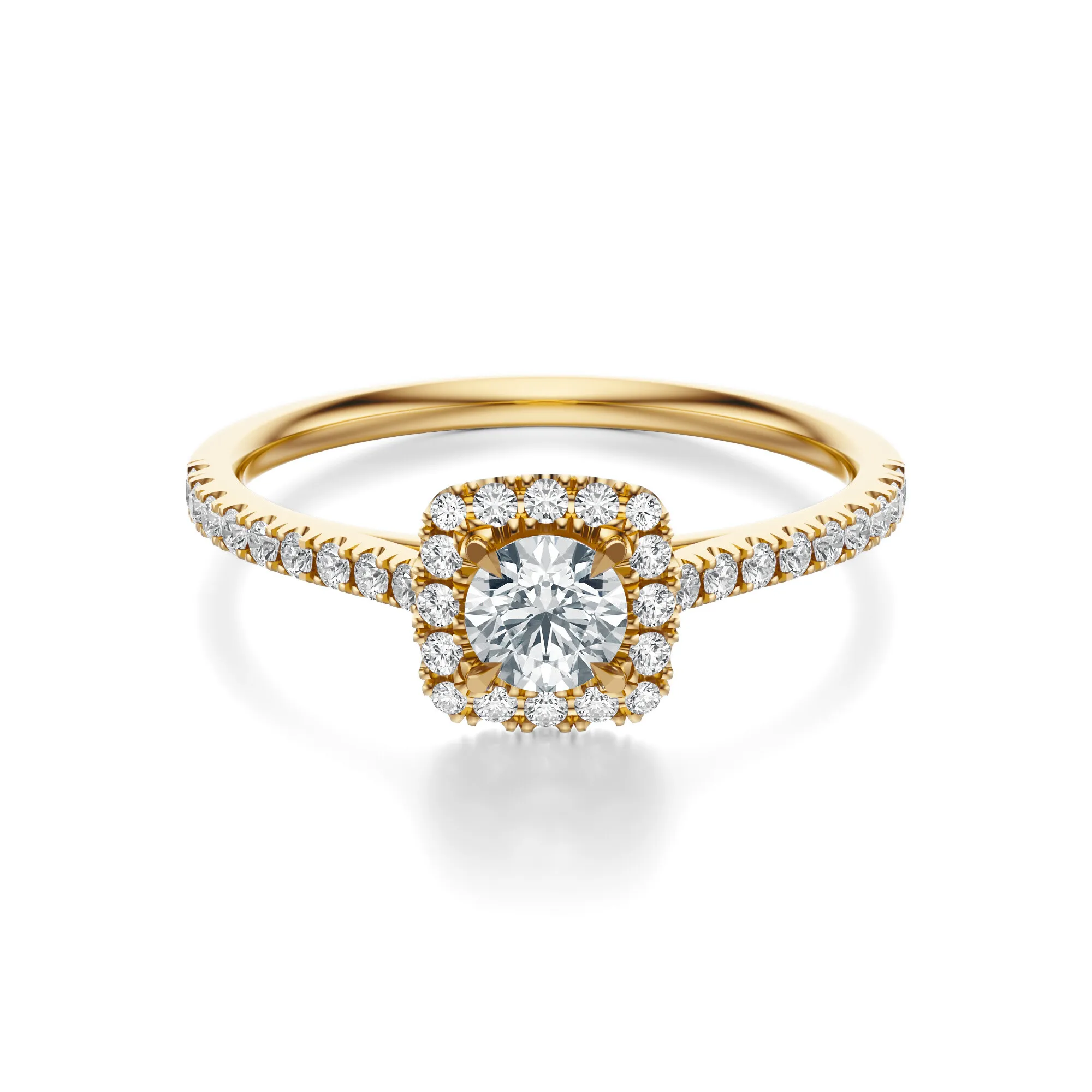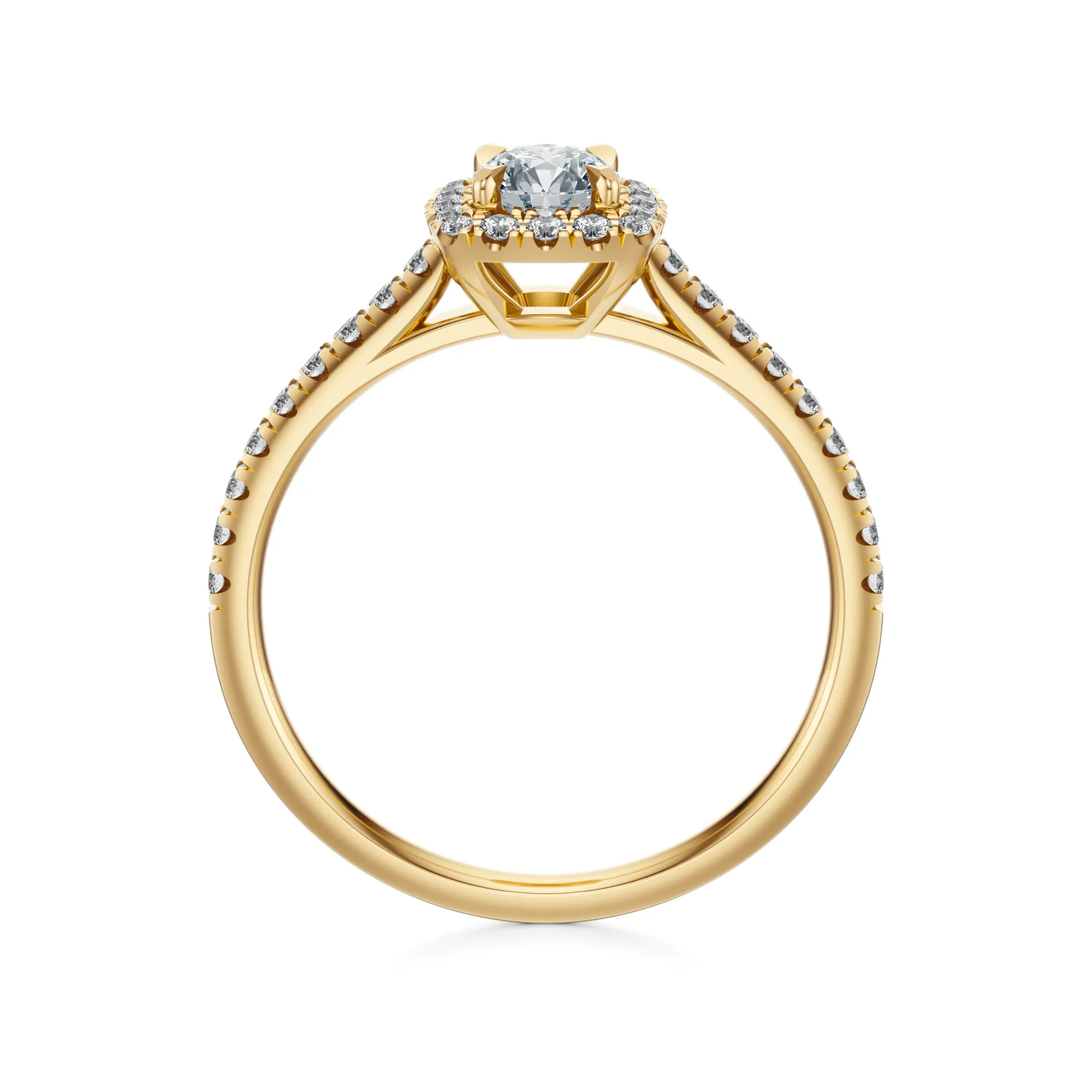 Ten olśniewający pierścionek zaręczynowy z żółtego złota o próbie 585 to prawdziwa definicja ponadczasowej elegancji. Harmonijnie połączono tu klasyczne piękno z subtelnym powiewem nowoczesności. Okrągły diament centralny, osadzony w delikatnej koronie, otoczony został finezyjną aureolą mniejszych kamieni, co wzmacnia jego blask i optycznie powiększa całą kompozycję. Całość dopełniają kamienie osadzone na obrączce, które wnoszą wyjątkową głębię i świetlistość.