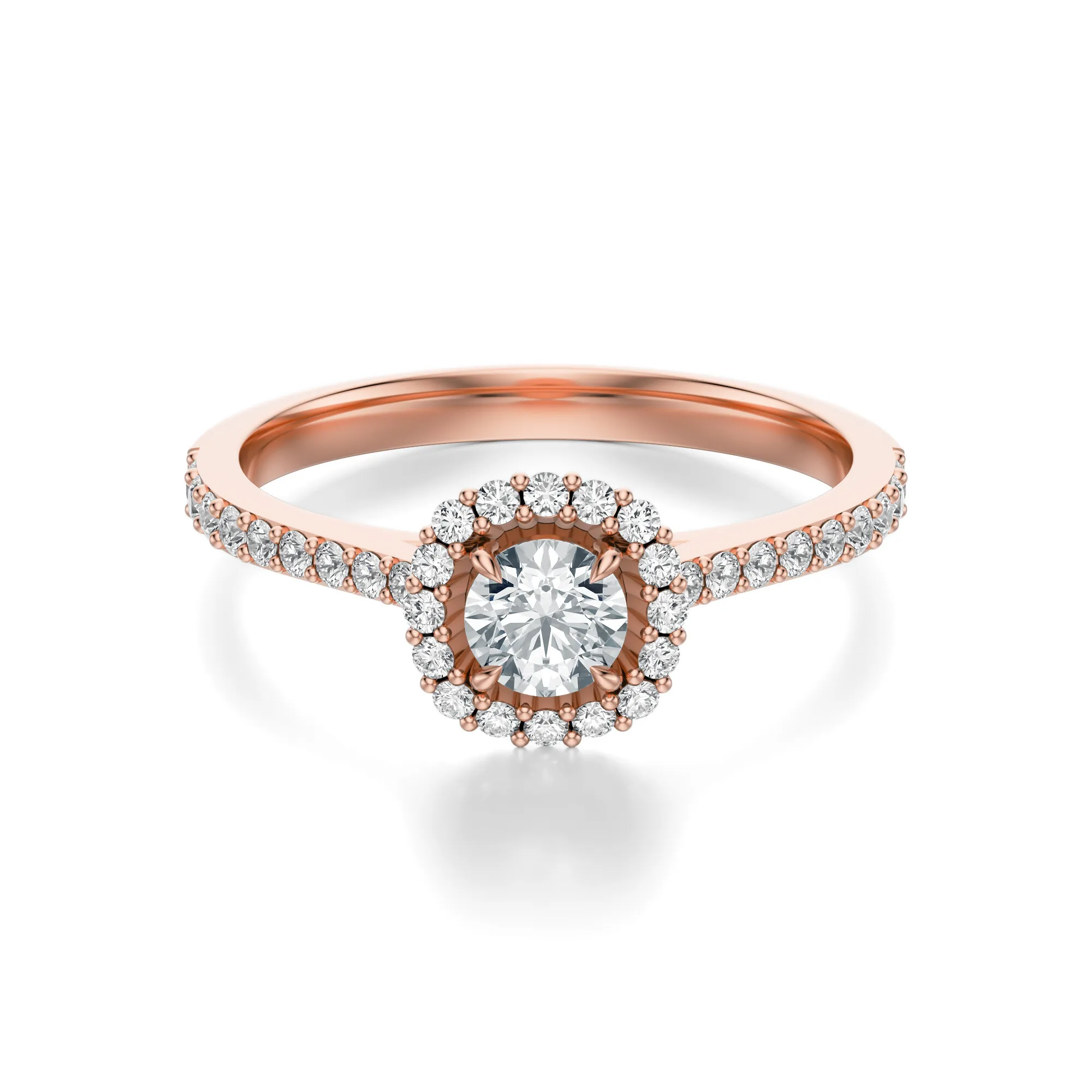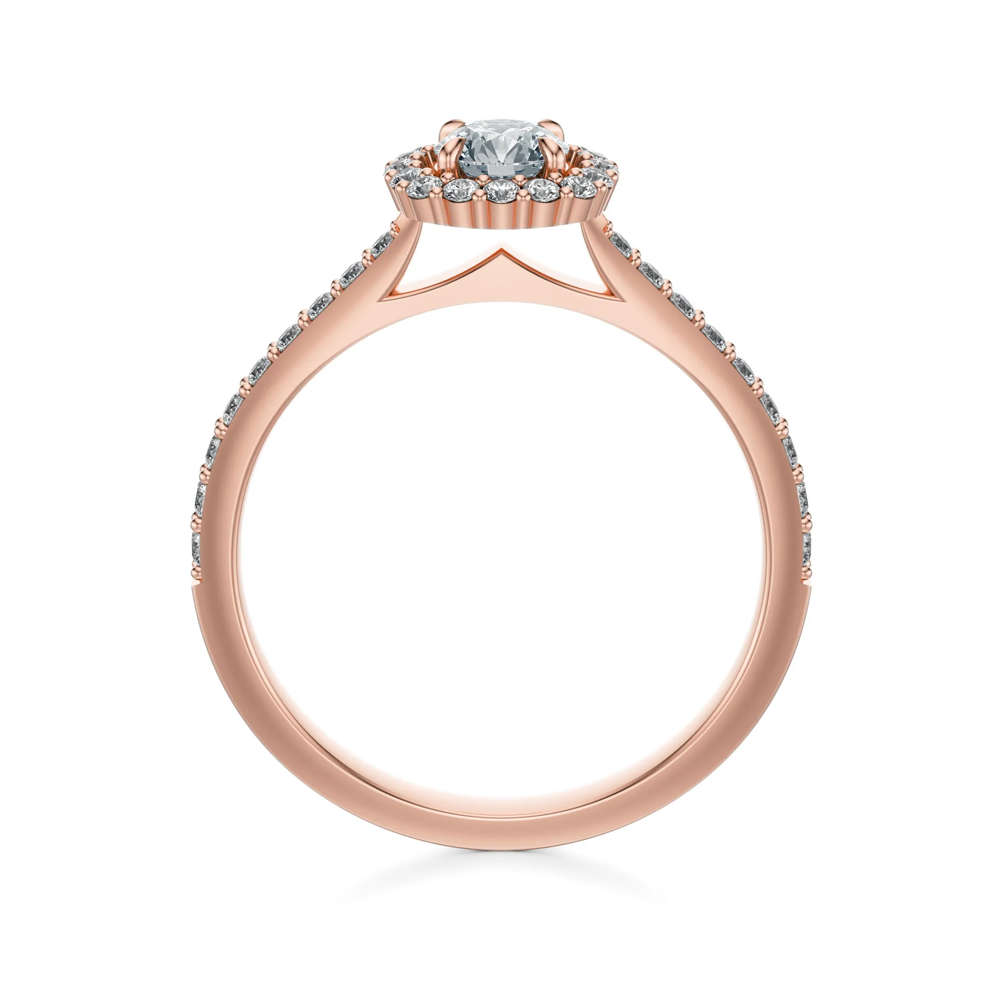 Ten wyjątkowy pierścionek z różowego złota o próbie 585 zachwyca subtelnością i ponadczasowym wdziękiem. Jego delikatna forma i wyrafinowane detale sprawiają, że staje się on nie tylko biżuterią, ale i symbolem elegancji oraz klasy. Centralny okrągły diament, otoczony lśniącym halo mniejszych kamieni, tworzy kompozycję pełną światła i harmonii. Całość osadzona została w ciepłym odcieniu różowego złota, który dodaje kompozycji romantycznego blasku.