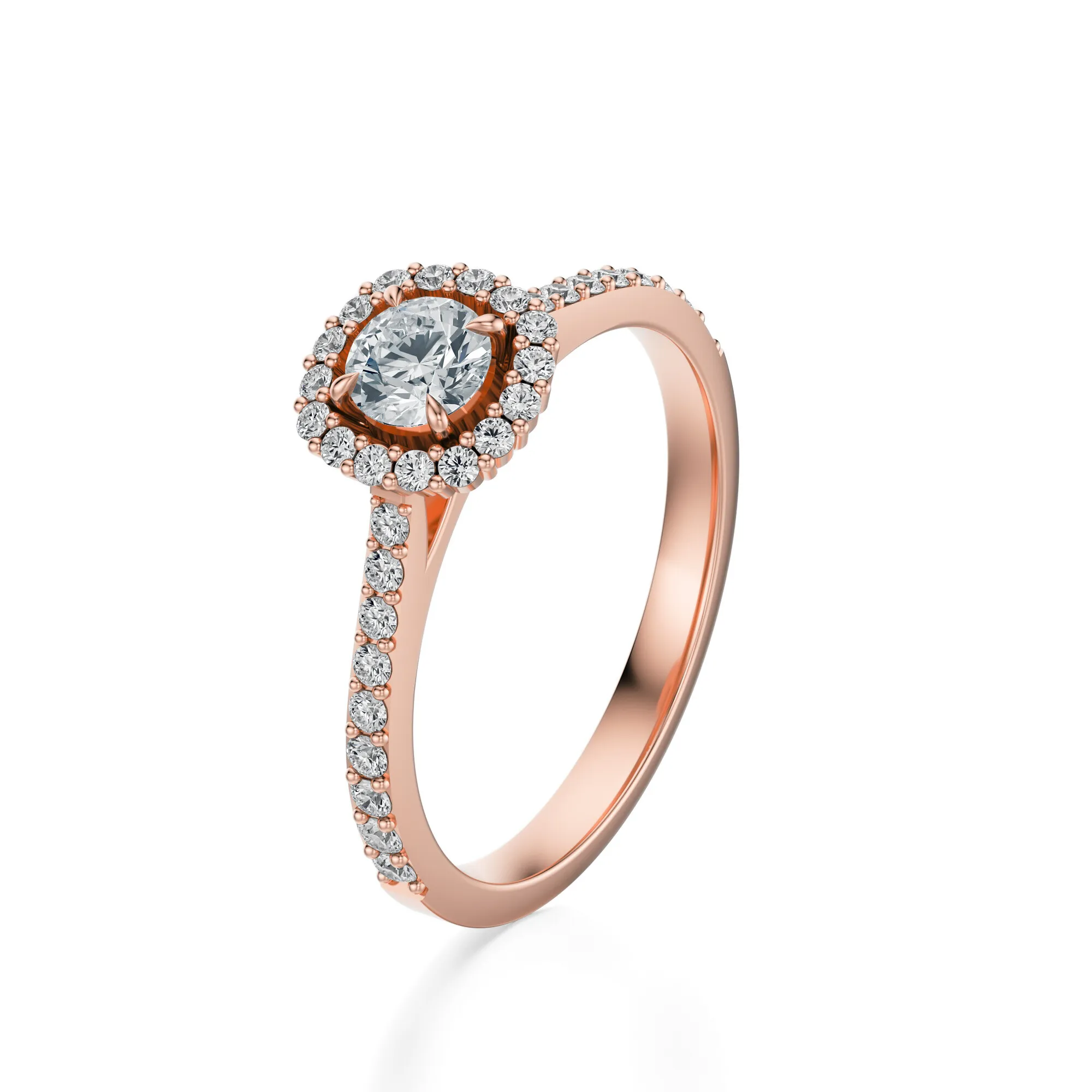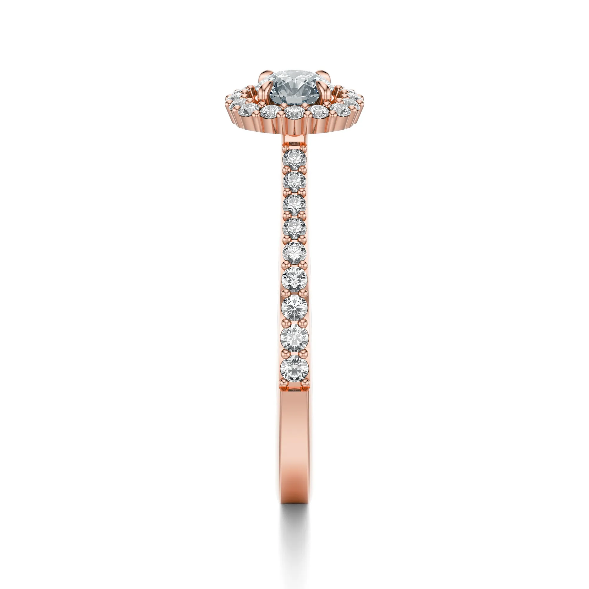 Połączenie różowego złota z okrągłymi diamentami to nie tylko estetyka – to także emocje. Styl halo, w którym centralny kamień otoczony jest drobnymi diamentami, intensyfikuje jego blask i nadaje pierścionkowi wyjątkowej głębi. Zdobiona oprawa wzdłuż obrączki podkreśla jego luksusowy charakter. To idealna propozycja dla osób ceniących klasyczny styl z nutą nowoczesności oraz delikatny, kobiecy wyraz biżuterii.