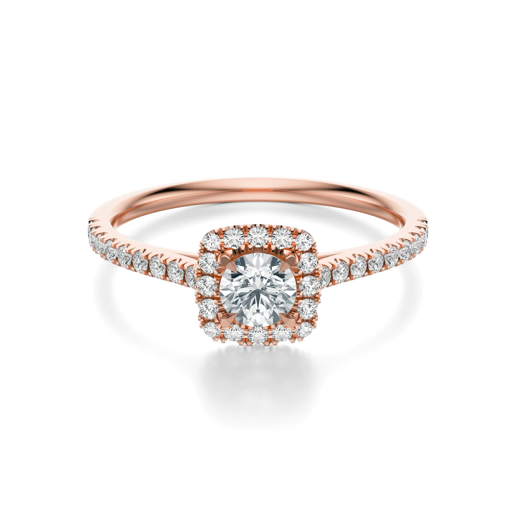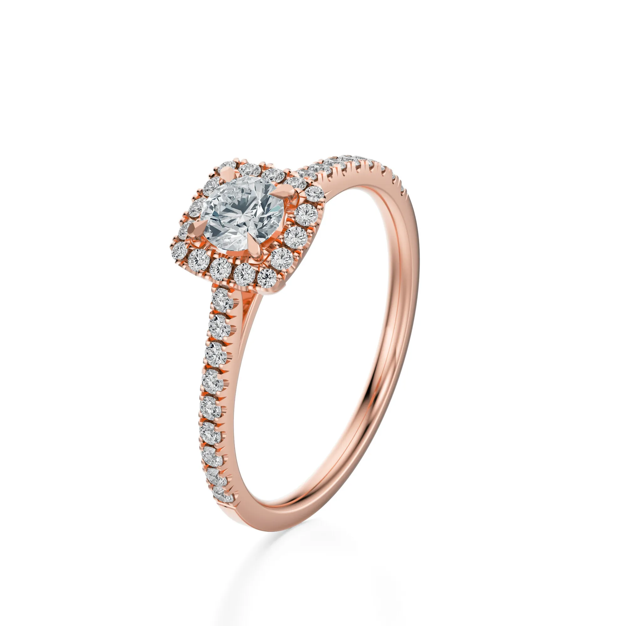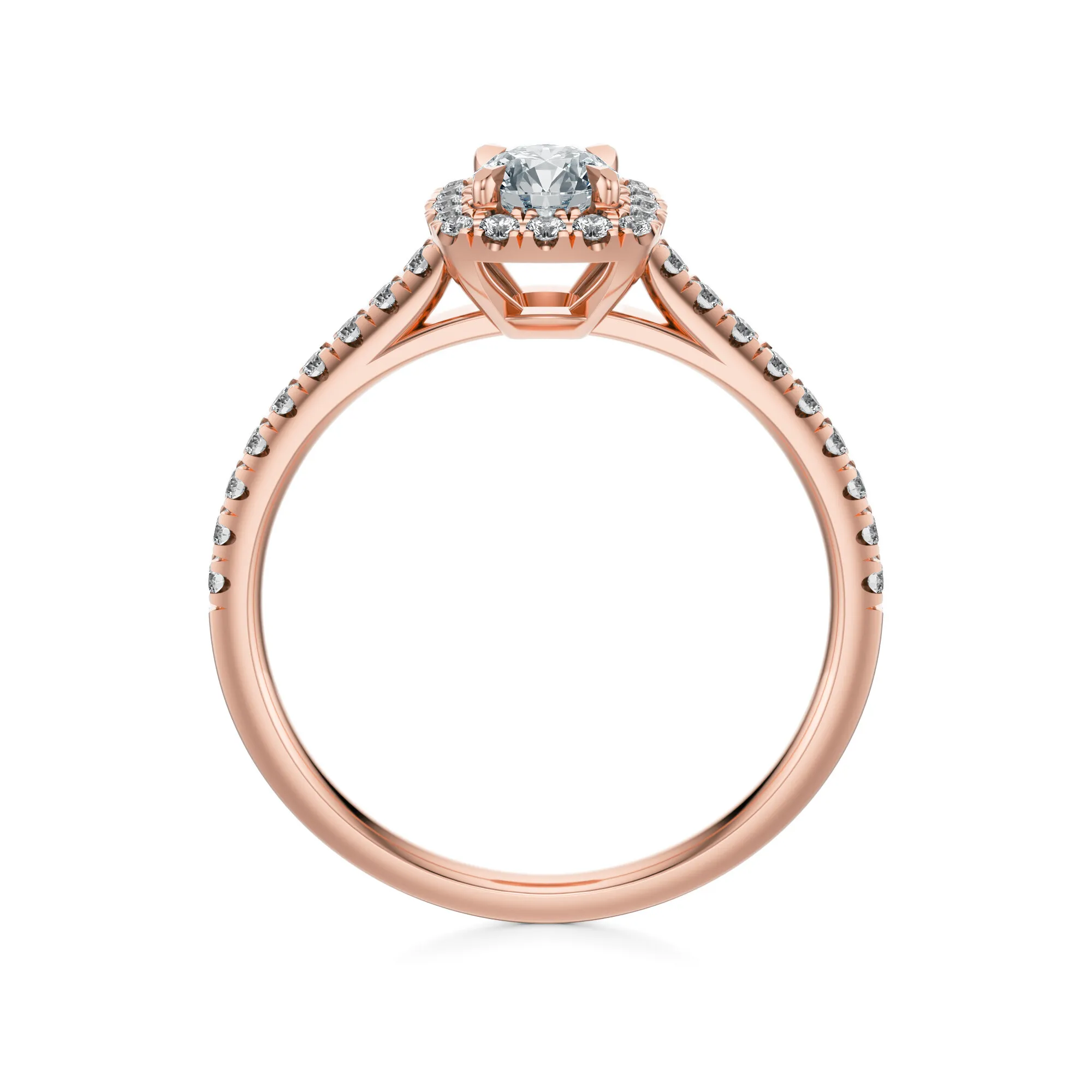 W pierścionku zastosowano diamenty o parametrach: czystość VS2, barwa H, szlif Excellent, dostępne w masach 0.30, 0.40, 0.50 i 0.70 ct. Starannie dobrane kamienie zachwycają wyjątkową przejrzystością i intensywnym blaskiem, który doskonale współgra z ciepłą tonacją różowego złota. Ich symetryczne rozmieszczenie wzmacnia efekt świetlny i dodaje pierścionkowi wyrafinowanego charakteru.