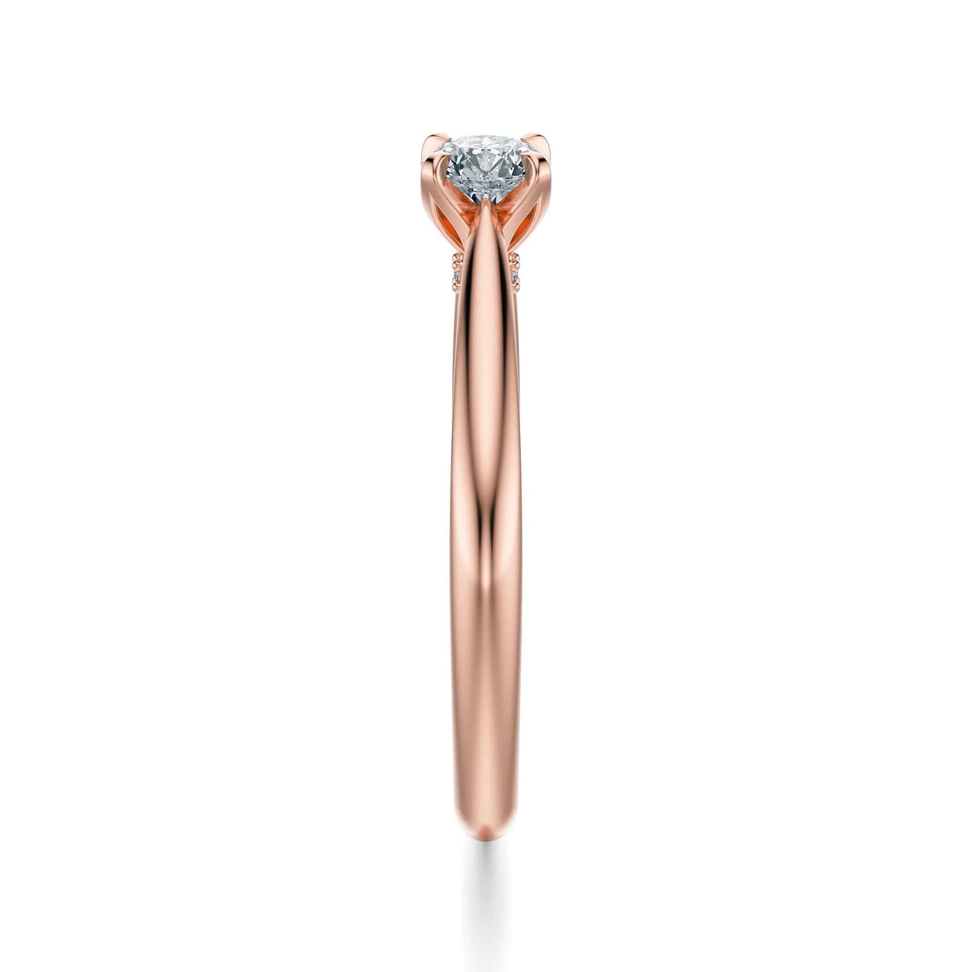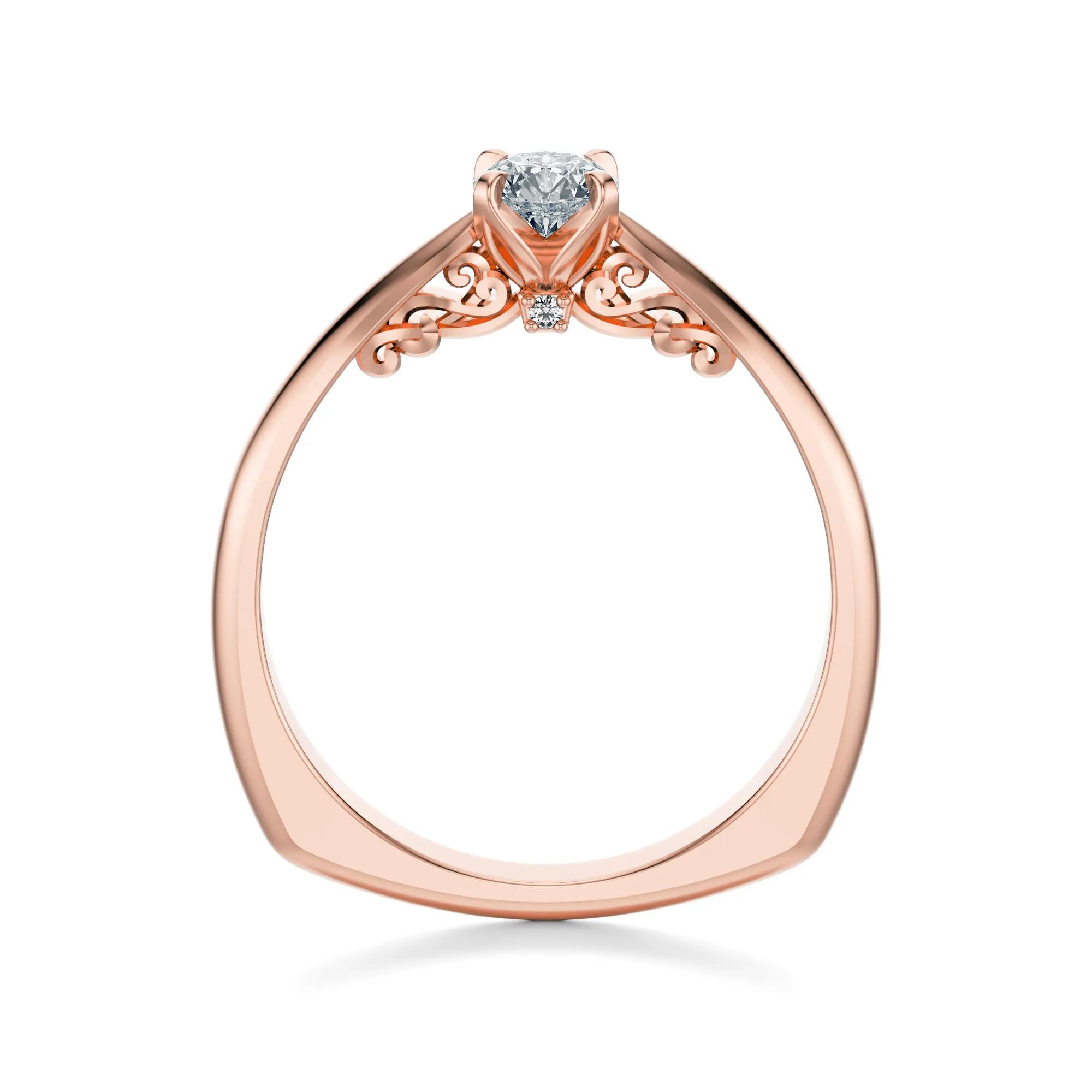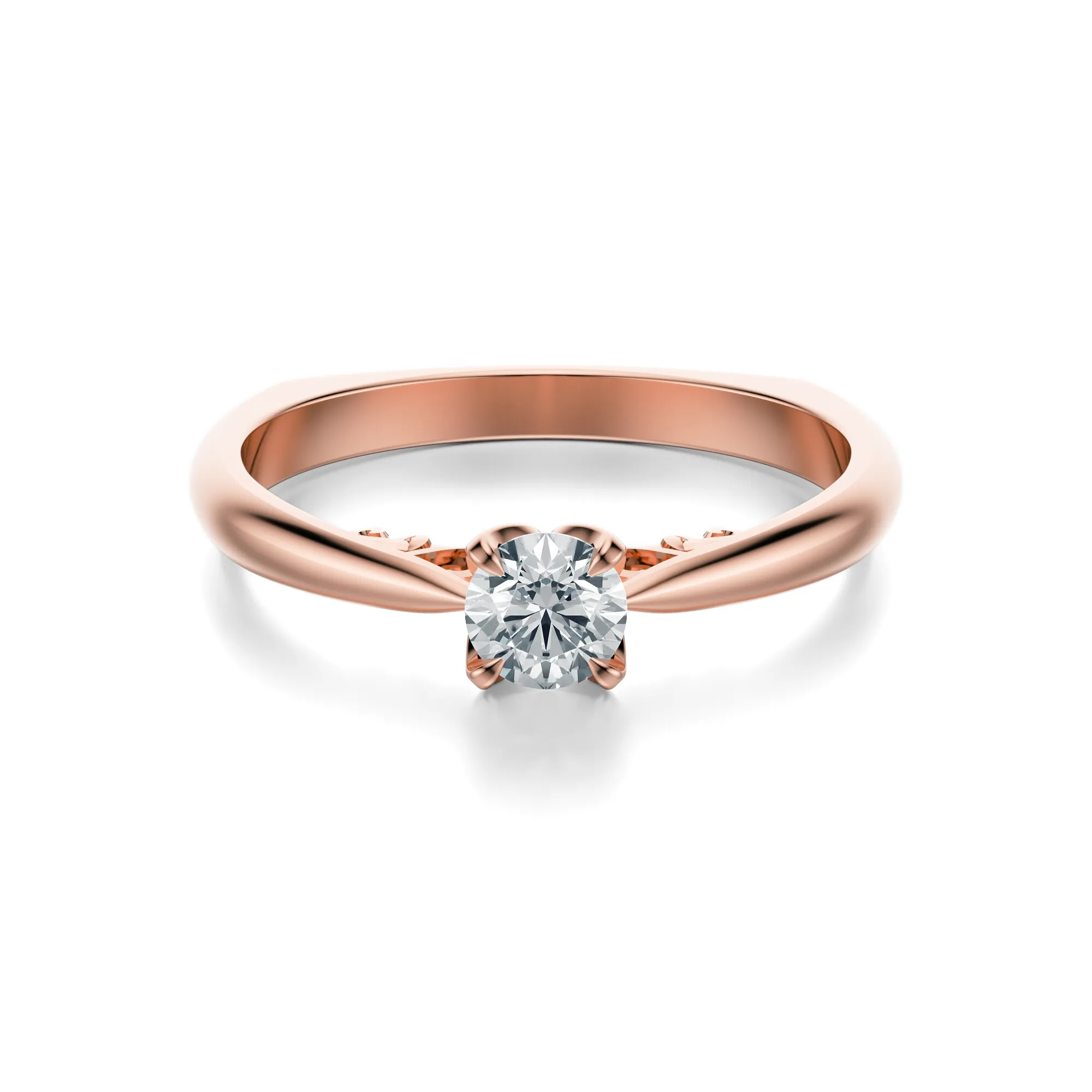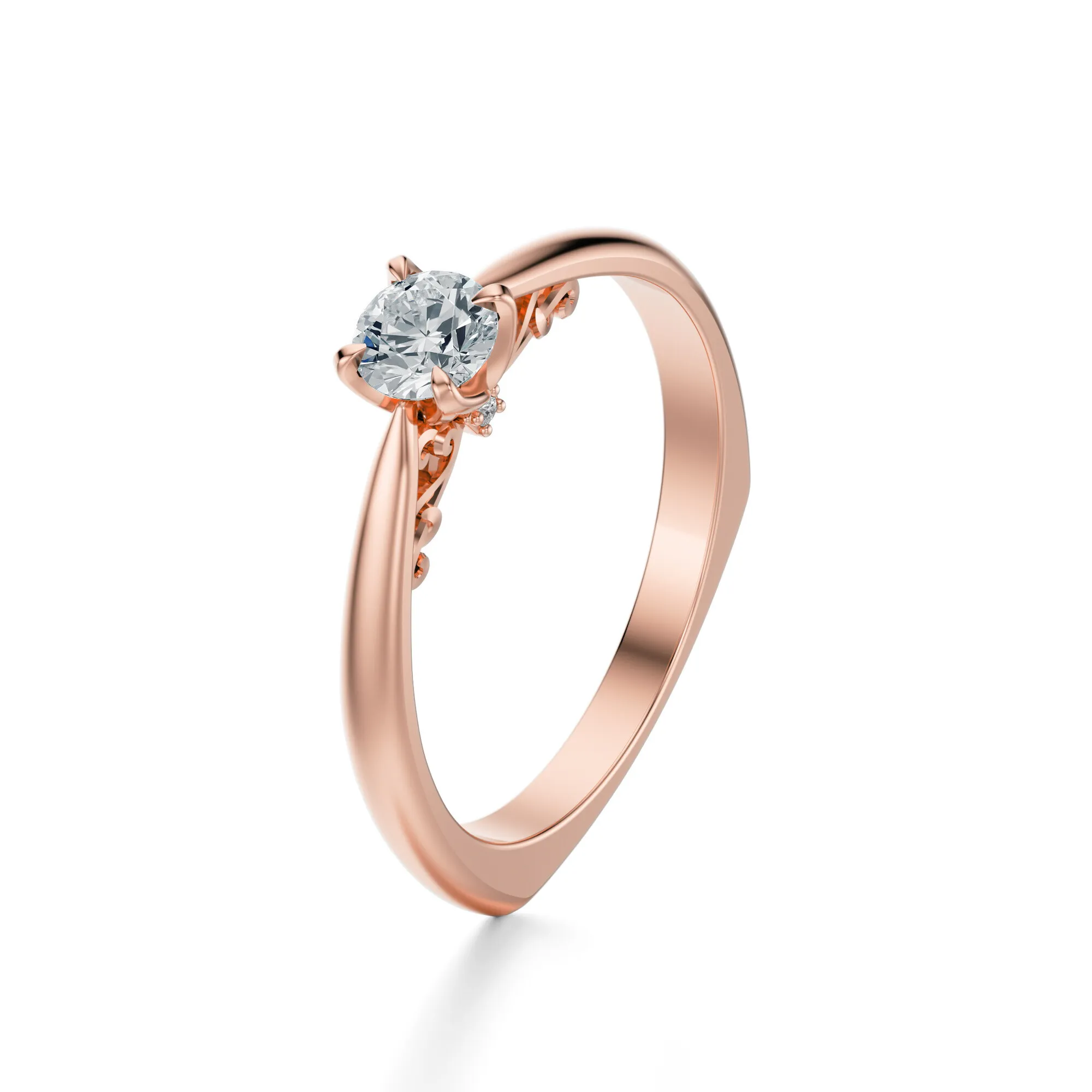 Szlachetność różowego złota nadaje pierścionkowi romantyczny charakter, podkreślając delikatność lśniącego diamentu. Subtelne zdobienia wzdłuż bocznych ramion obrączki dodają mu lekkości i artystycznego sznytu. Ten model przypadnie do gustu osobom ceniącym minimalistyczny styl z nutą klasyki oraz kobiecego wdzięku. Diament jako symbol siły, trwałości i czystości uczuć sprawia, że pierścionek doskonale sprawdzi się jako pierścionek zaręczynowy, prezent na rocznicę lub osobista pamiątka.
