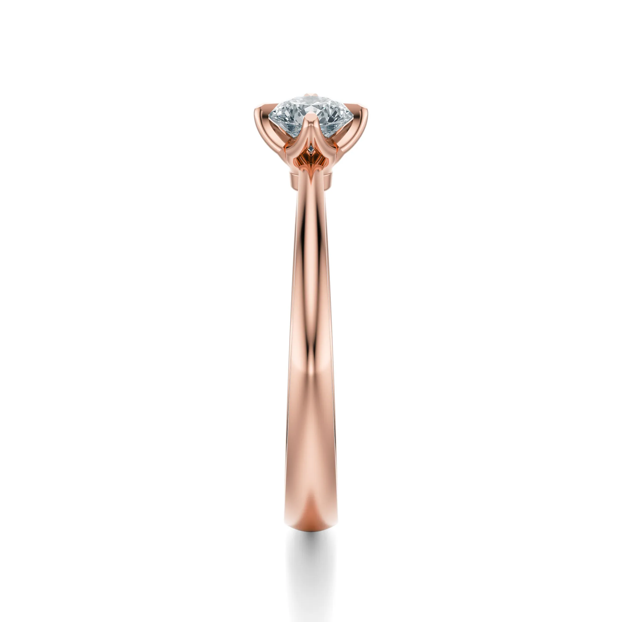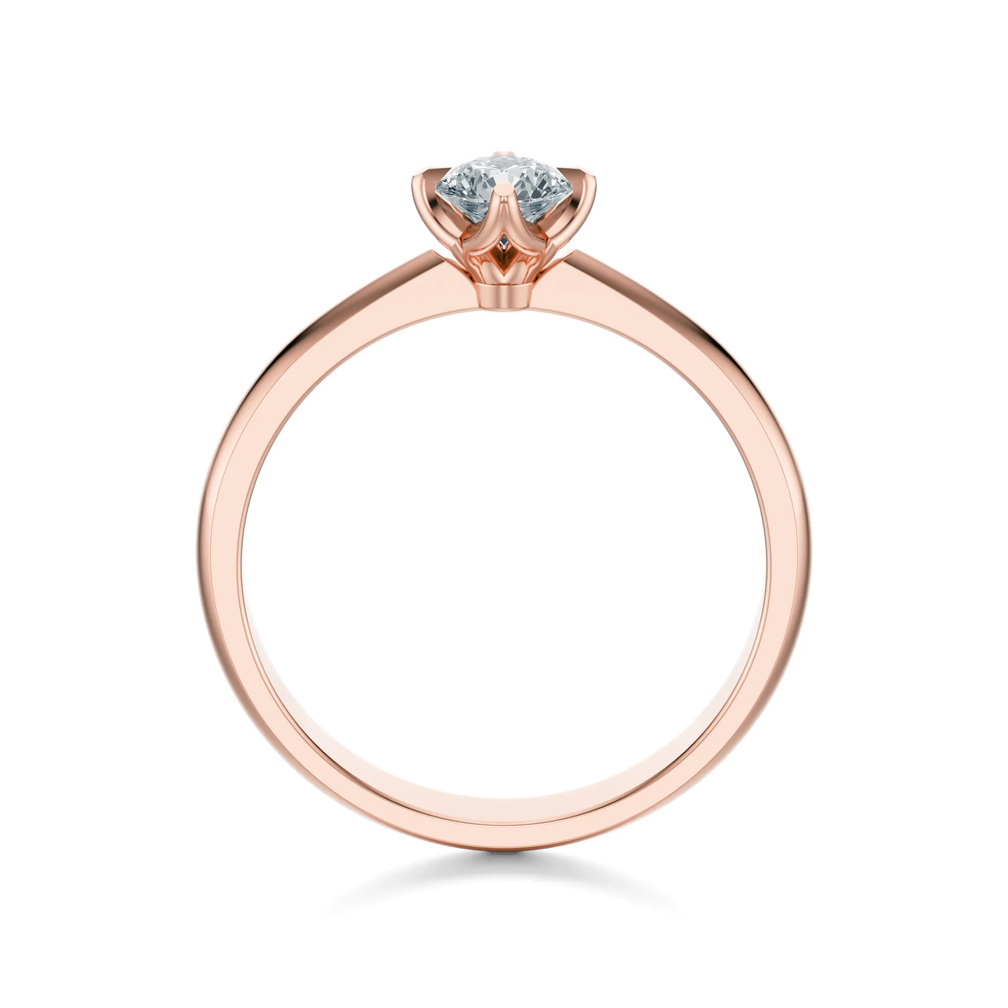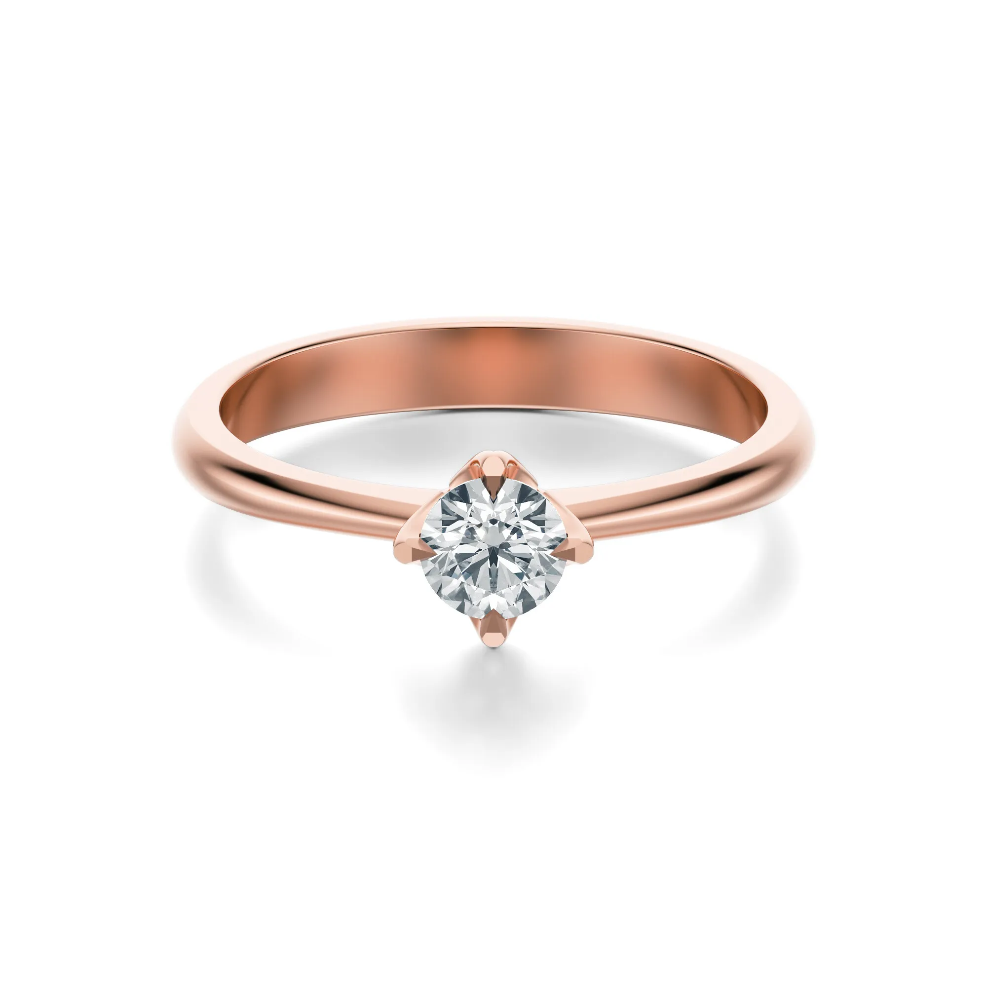 Okrągły diament o perfekcyjnym szlifie stanowi centralny punkt biżuterii, przyciągając spojrzenia i podkreślając naturalne piękno różowego złota. Jego subtelny połysk i klarowność idealnie kontrastują z ciepłą barwą metalu, tworząc harmonijną całość, która emanuje wyrafinowaniem i wdziękiem.