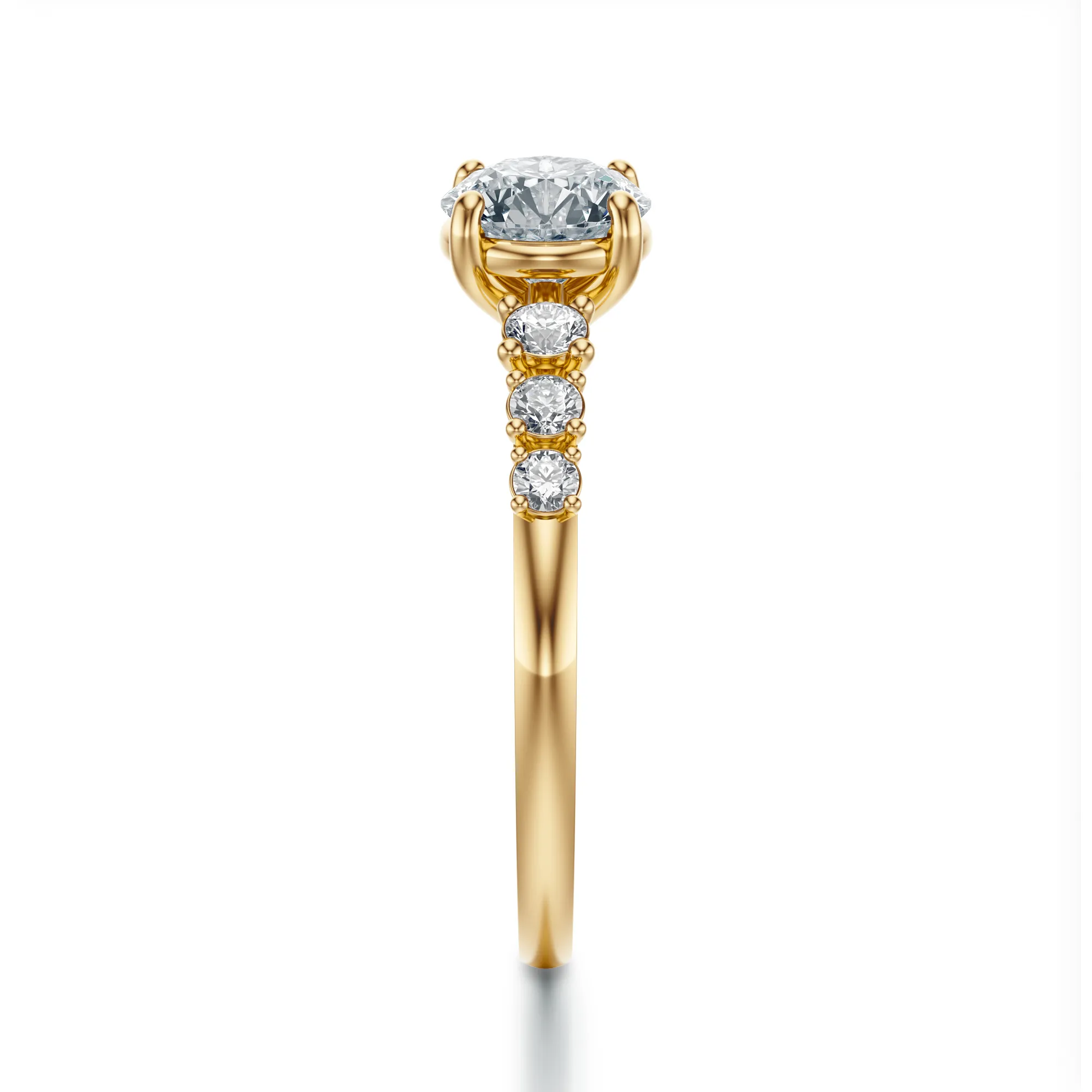 Główny diament zachwyca szlifem typu excellent, który maksymalnie wydobywa jego blask. Kamienie o czystości VS2 i barwie H zapewniają doskonałe połączenie jakości i estetyki. Masa centralnego kamienia dostępna jest w opcjach: 0.30, 0.40, 0.50 i 0.70 ct – każda z nich może być dobrana według preferencji klienta, co czyni pierścionek w pełni personalizowanym. Mniejsze kamienie również zachowują wysokie parametry, tworząc spójną, lśniącą całość.