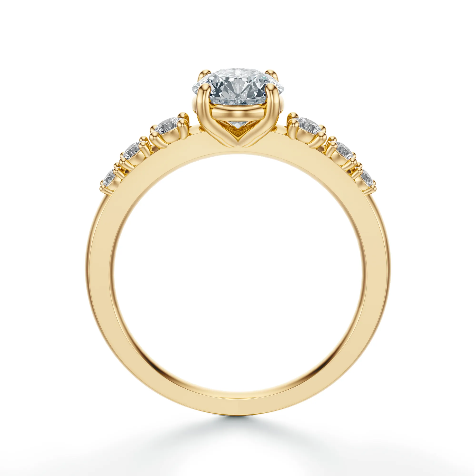Ten olśniewający pierścionek zaręczynowy wykonany ze złota o próbie 585 w kolorze żółtym to kwintesencja elegancji i ponadczasowego stylu. Jego subtelny, a jednocześnie wyrazisty design przyciąga wzrok dzięki starannie osadzonym diamentom o okrągłym szlifie, które emanują intensywnym blaskiem i luksusem. Główny kamień centralny otoczony został symetrycznym układem mniejszych diamentów, co nadaje całej kompozycji wyjątkową harmonię i głębię.