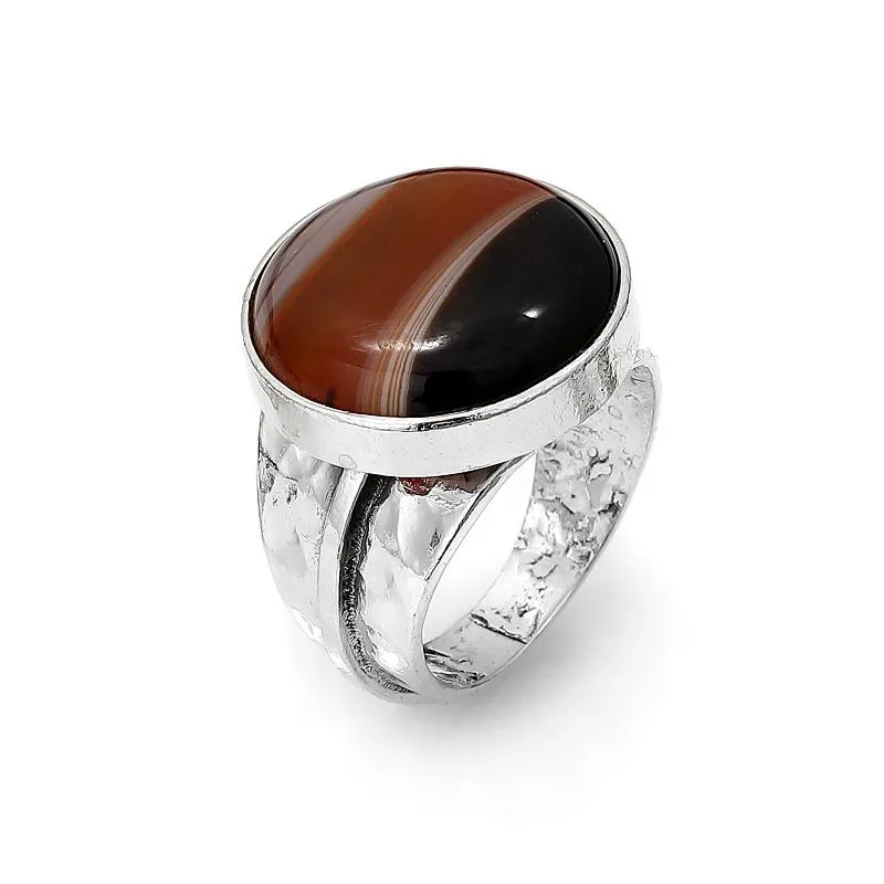 Piękno kamieni naturalnych polega na ich naturalności. Naturalność czasami oferuje perfekcję, a czasem perfekcyjną nieperfekcję, która swoim pięknej zdobywa miłośników darów natury. Dla takich osób prezentujemy ten pierścionek srebrny z kamieniem o kilku kolorach. Naturalne odcienie: czerń, brąz, beż i biel to dominujące kolory kamienia. Został on oszlifowany na gładko, dzięki temu jeszcze lepiej widać jego strukturę oraz różnorodność kolorystyczną. Kamień naturalny osadzony jest w okrągłej oprawie o szerokich krawędziach.