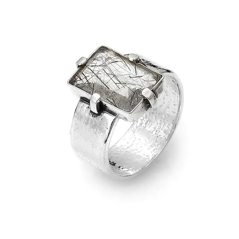 W tym pierścionku osadzono kamień transparentny o ciekawej strukturze wewnętrznej. To właśnie te drobne „niedoskonałości” w idealnie przezroczystym kamieniu nadają mu charakteru i podkreślają oryginalność. Pierścionek z prostokątnym kamieniem z tak szeroką obrączką jest wygodny do noszenia na co dzień i dzięki neutralnej kolorystyce pasuje do każdej stylizacji.