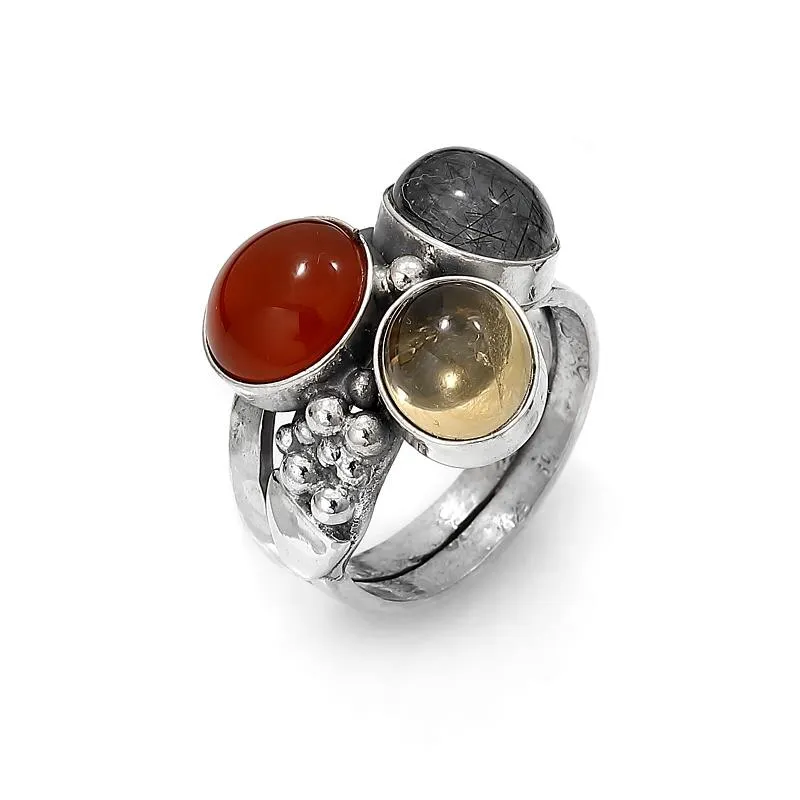 Charakterystyczne dla tego pierścionka są dwie zupełnie różne obrączki, połączone w jedną, perfekcyjnie zdobiąc kobiecy palec. Jedna z obrączek to klasyczna, wąska obrączka. Druga zaś rozszerza się ku kamieniom i posiada liczne zdobienia w formie małych, srebrnych kuleczek. Pierścionek z kamieniem naturalnym nie musi być nudny. Ten model dobrze to pokazuje. Oprócz finezyjnej obrączki są trzy kamienie podobnej wielkości o różnych kolorach. Jeden z nich jest czerwony, drugi w odcieniu herbacianym, a trzeci transparenty z ciekawą wewnętrzną strukturą.