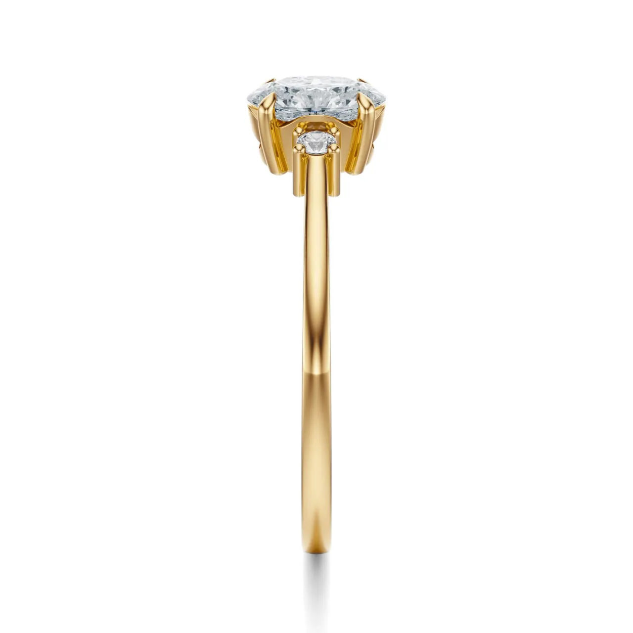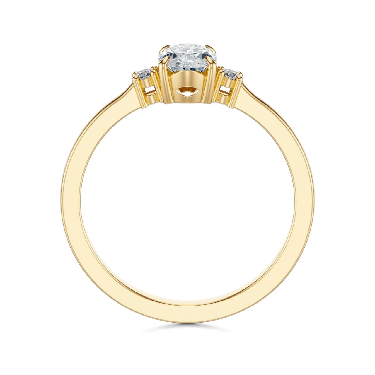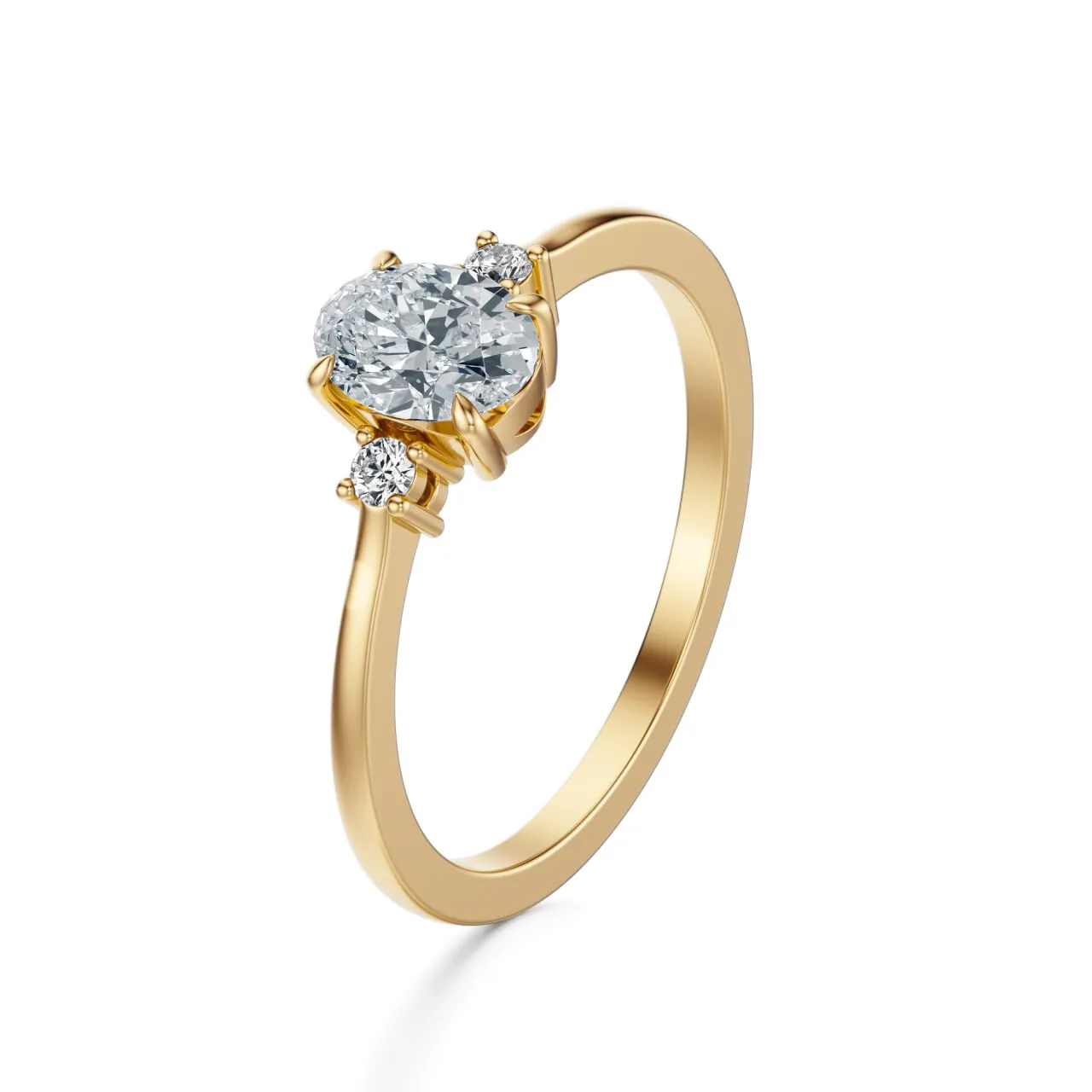 Prezentujemy elegancki pierścionek zaręczynowy, wykonany z najwyższej jakości żółtego złota. Jego główną ozdobą jest zachwycający owalny diament, który dzięki perfekcyjnemu szlifowi emanuje niezwykłym blaskiem. Dwa subtelne brylanty po bokach dodają mu dodatkowej finezji i podkreślają wyjątkowy charakter tej biżuterii.