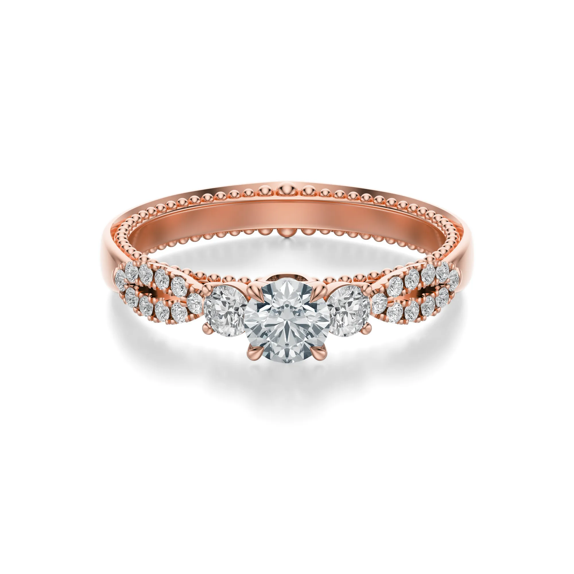 Okrągły diament o szlifie Excellent zachwyca swoim blaskiem, podkreślając wyjątkowość projektu. Standardowe parametry dostępne w naszej ofercie to czystość VS2, barwa H oraz masa w przedziale 0.30–0.70 ct – z możliwością dostosowania do indywidualnych potrzeb. Perfekcyjnie oszlifowany kamień doskonale odbija światło, co przekłada się na jego wyjątkowy połysk i głębię.