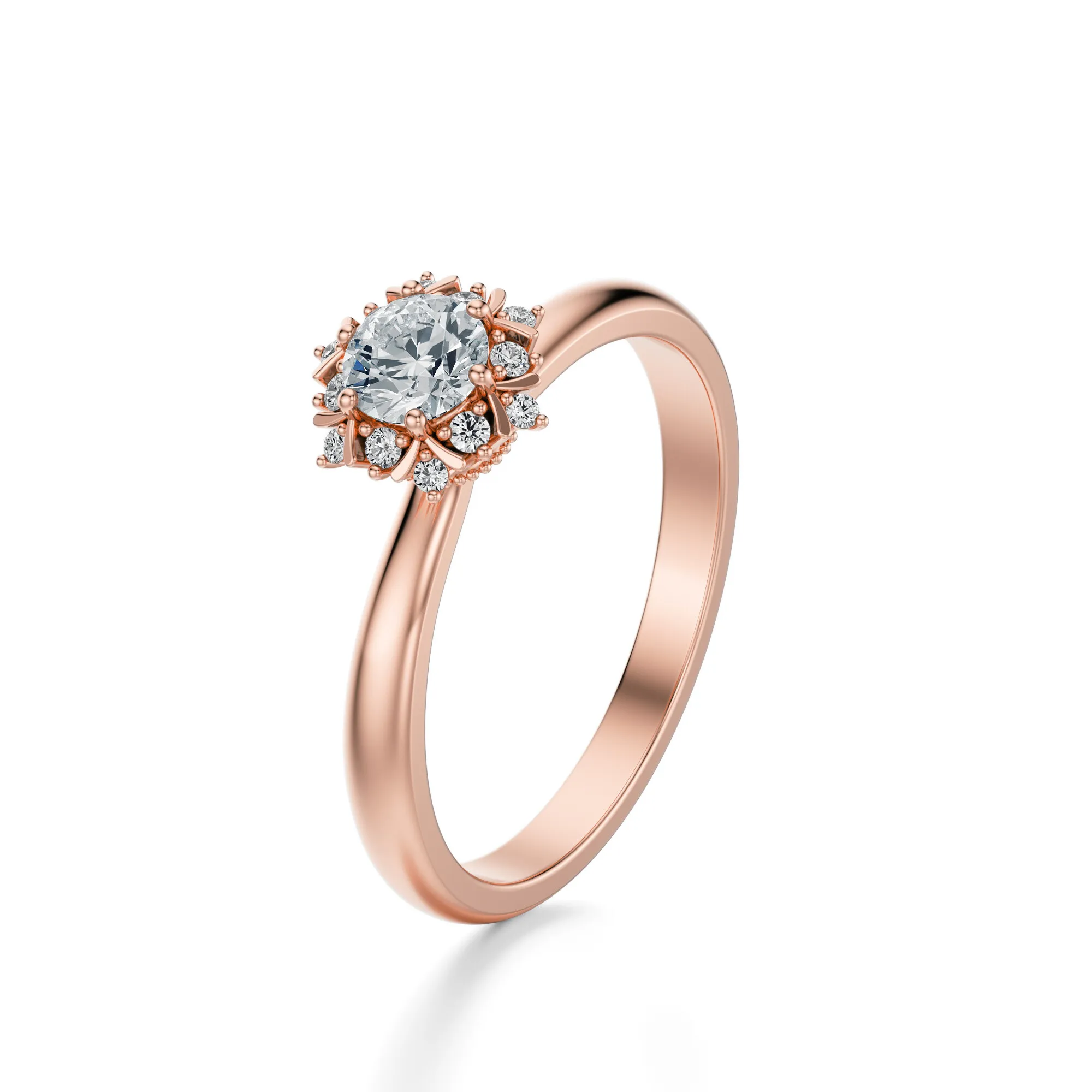 Ten wyjątkowy pierścionek wykonany ze złota o próbie 585 w odcieniu różowego złota to subtelne połączenie romantyzmu i ponadczasowej klasy. Okrągły diament umieszczony w centrum olśniewa intensywnym blaskiem, a jego otoczenie tworzy kompozycja drobnych brylantów w kwiatowym układzie, która przyciąga spojrzenia swoim wyjątkowym urokiem i finezją. Szlachetne materiały oraz dbałość o detale sprawiają, że pierścionek staje się elegancką ozdobą na długie lata.
