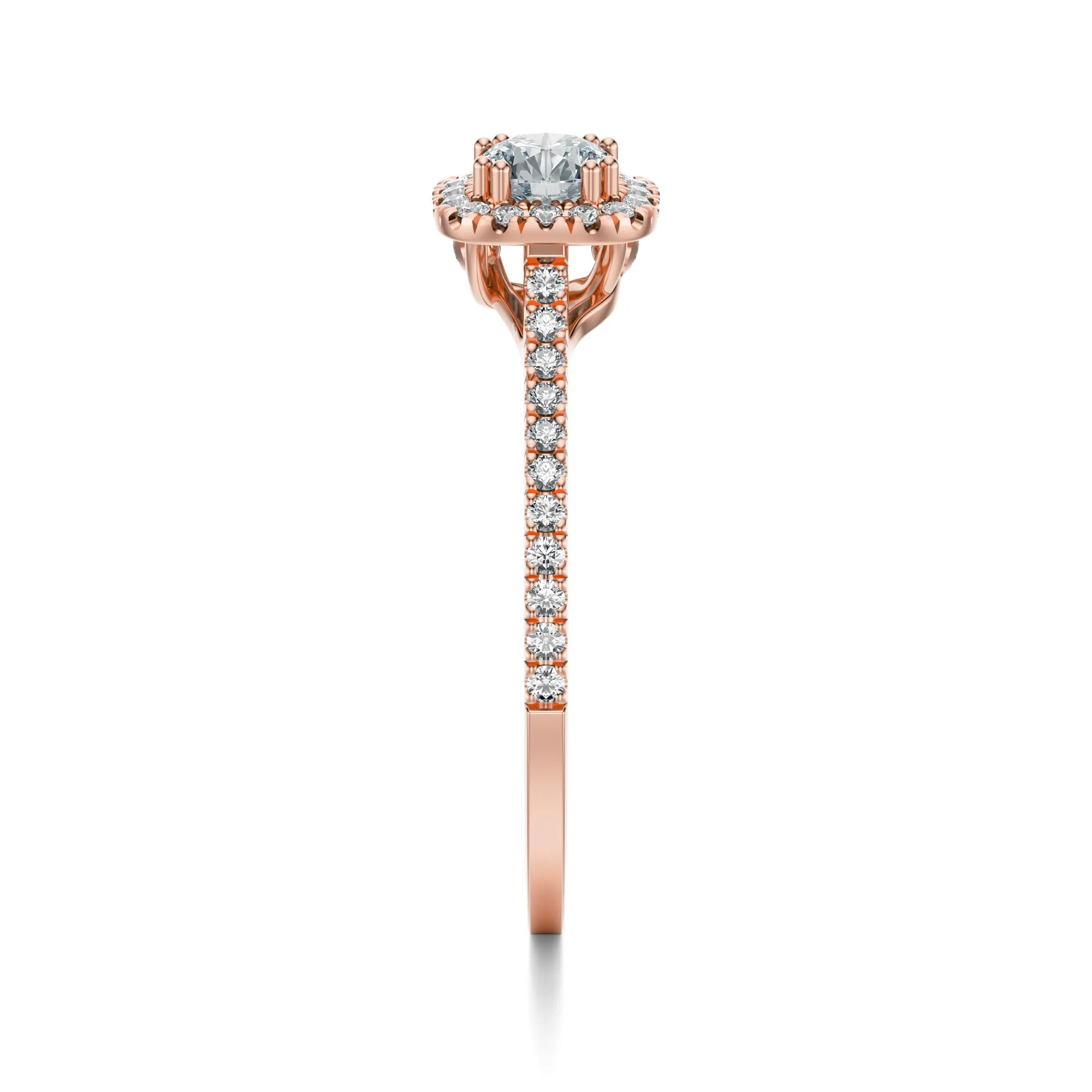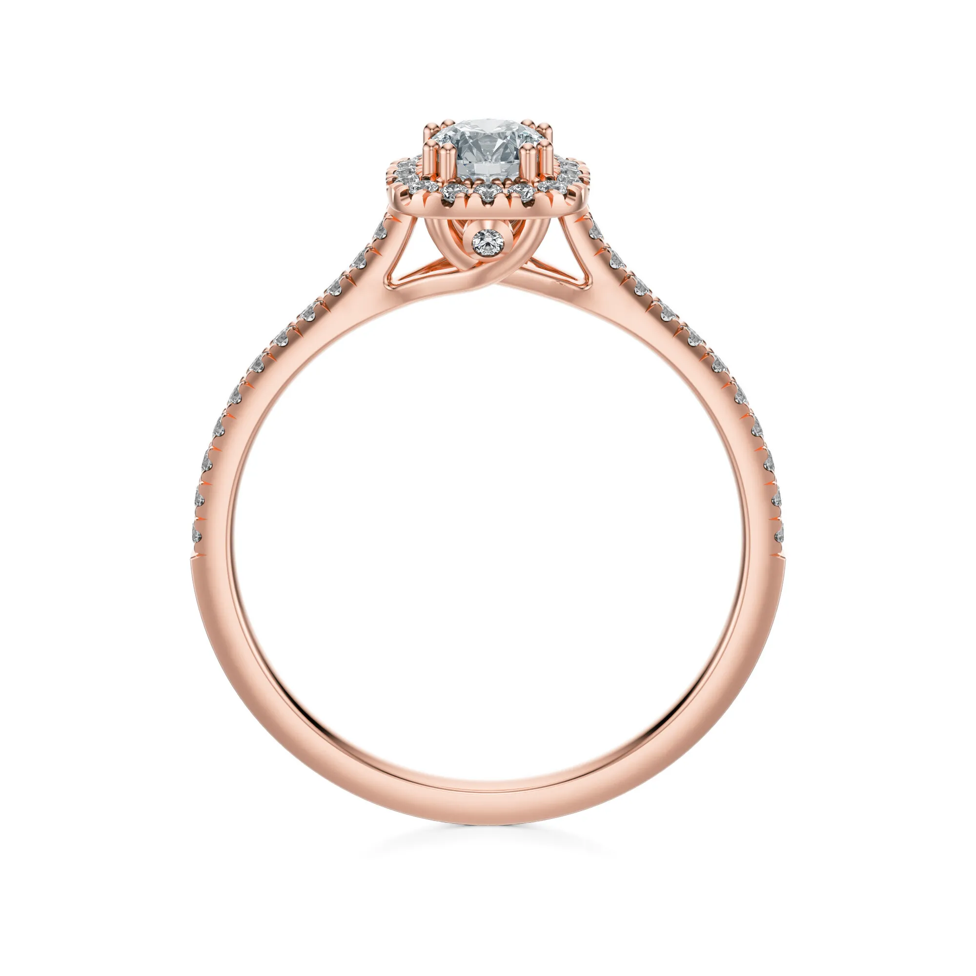 Subtelne zestawienie różowego złota i lśniących diamentów tworzy doskonałą harmonię między ciepłem metalu a chłodnym blaskiem kamieni. Elegancki kształt i równomierne rozmieszczenie brylantów nadają pierścionkowi lekkości i finezji. To doskonały wybór dla kobiet o romantycznym usposobieniu i miłośniczek biżuterii łączącej klasyczny styl z nutą nowoczesności. Symbolika tego pierścionka to trwałość, oddanie i czystość uczuć — idealny prezent zaręczynowy lub rocznicowy.