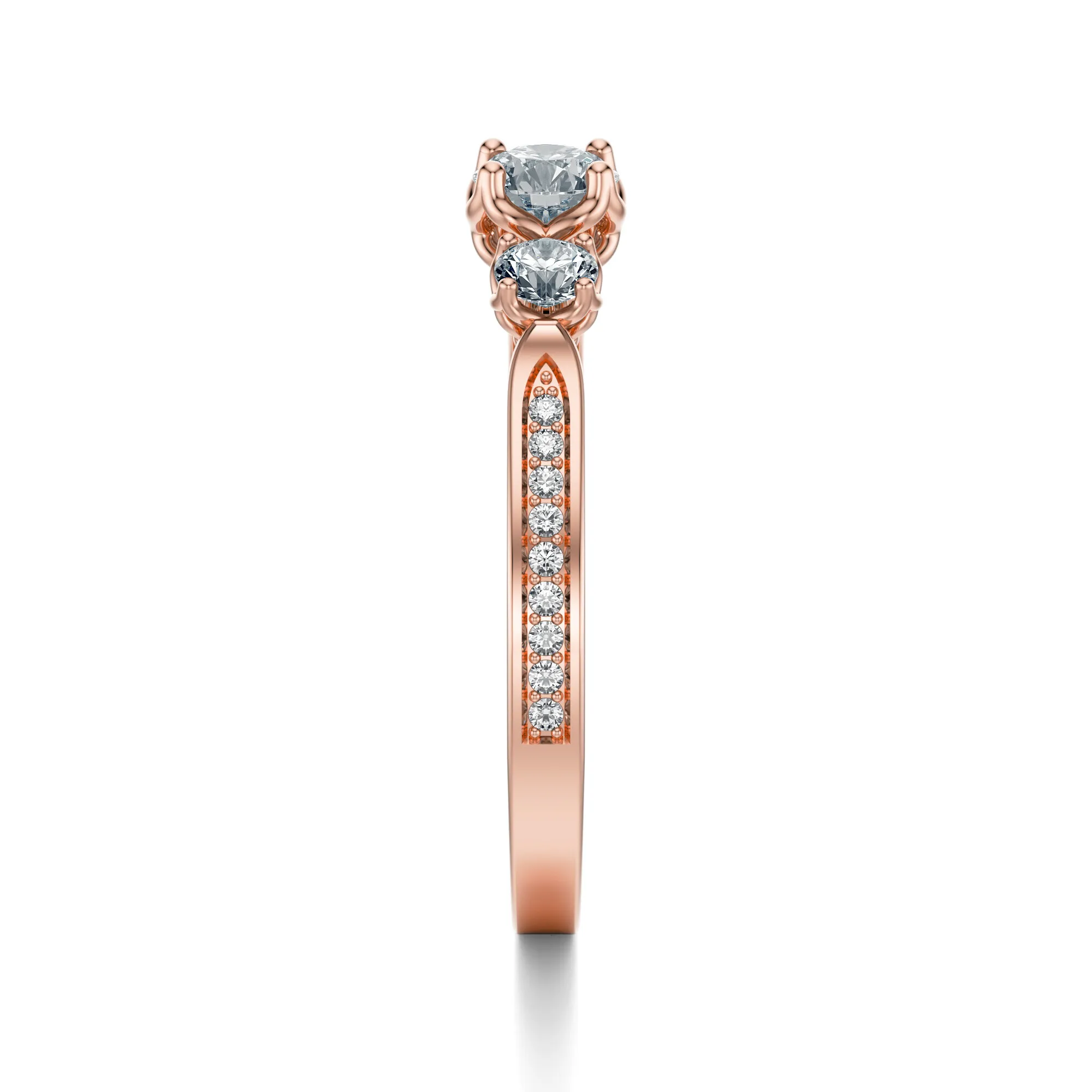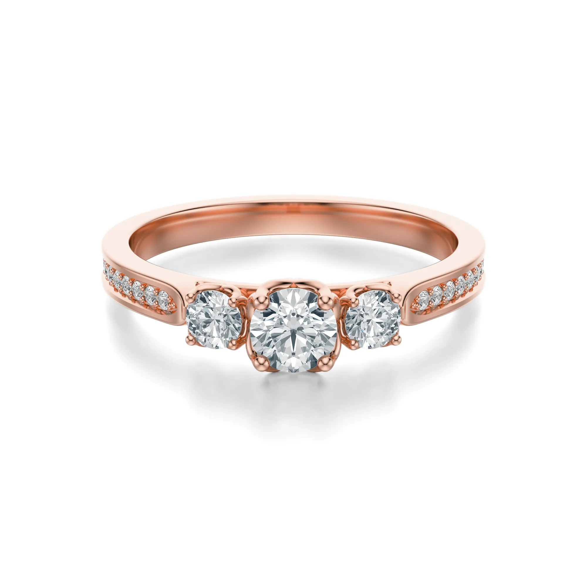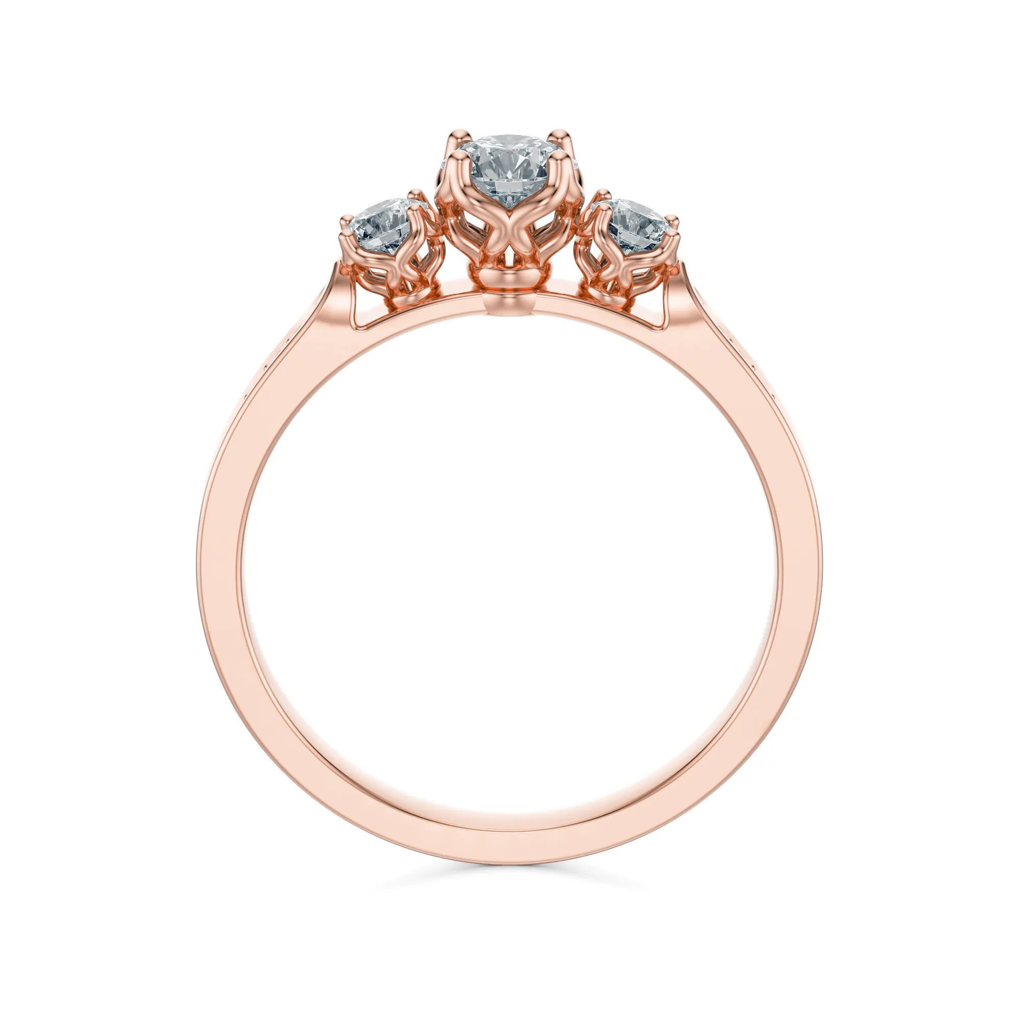 Centralny kamień osadzony jest pomiędzy dwoma mniejszymi diamentami, co nadaje całości dynamiczny, a zarazem klasyczny charakter. Wzdłuż obrączki biegną drobne kamienie, dodające pierścionkowi lekkości i głębi połysku. Ten model to znakomity wybór dla osób, które pragną połączyć romantyczną estetykę z ponadczasową elegancją. Symbolicznie pierścionek może odzwierciedlać miłość w trzech wymiarach – przeszłość, teraźniejszość i przyszłość – czyniąc go doskonałym wyborem na zaręczyny czy rocznicę.