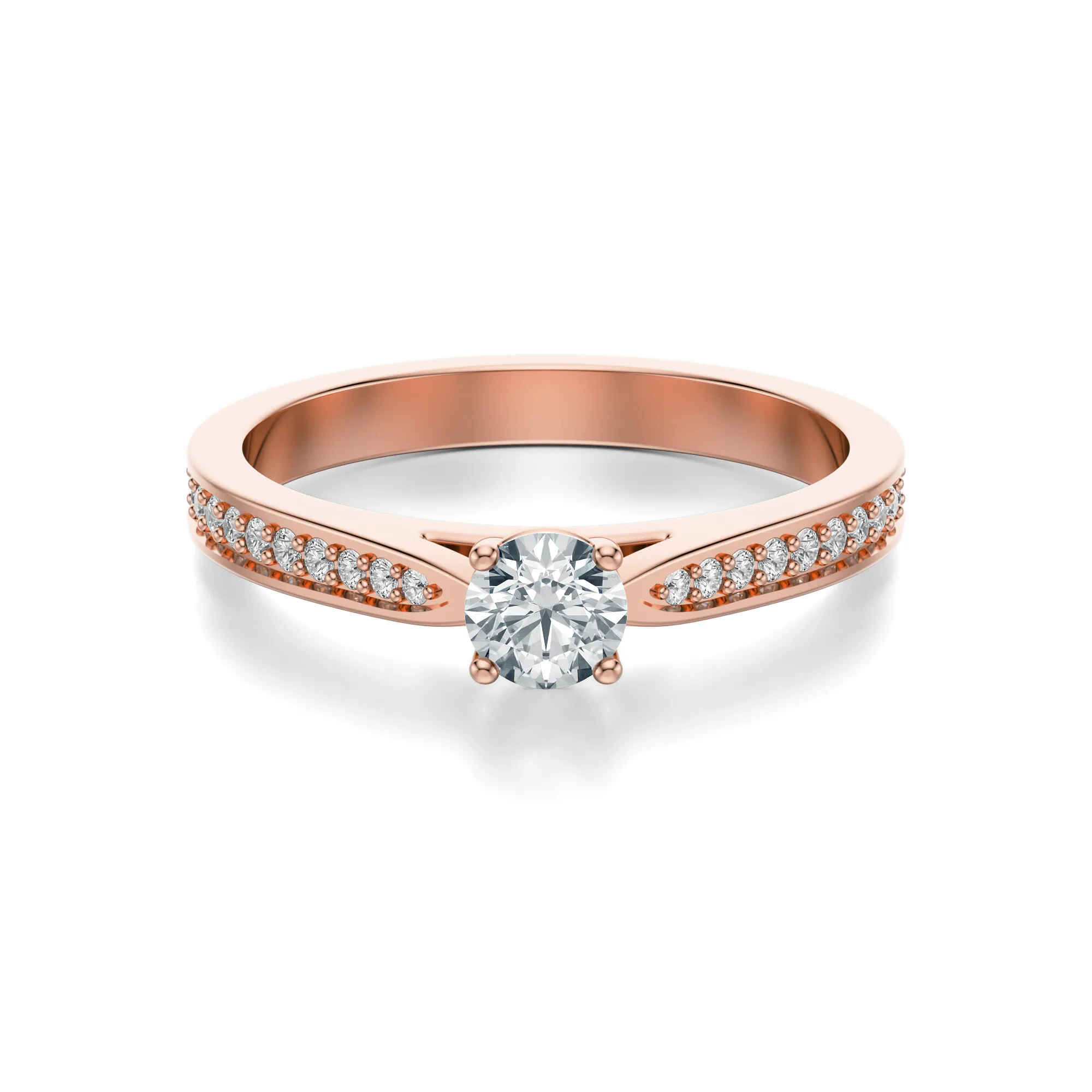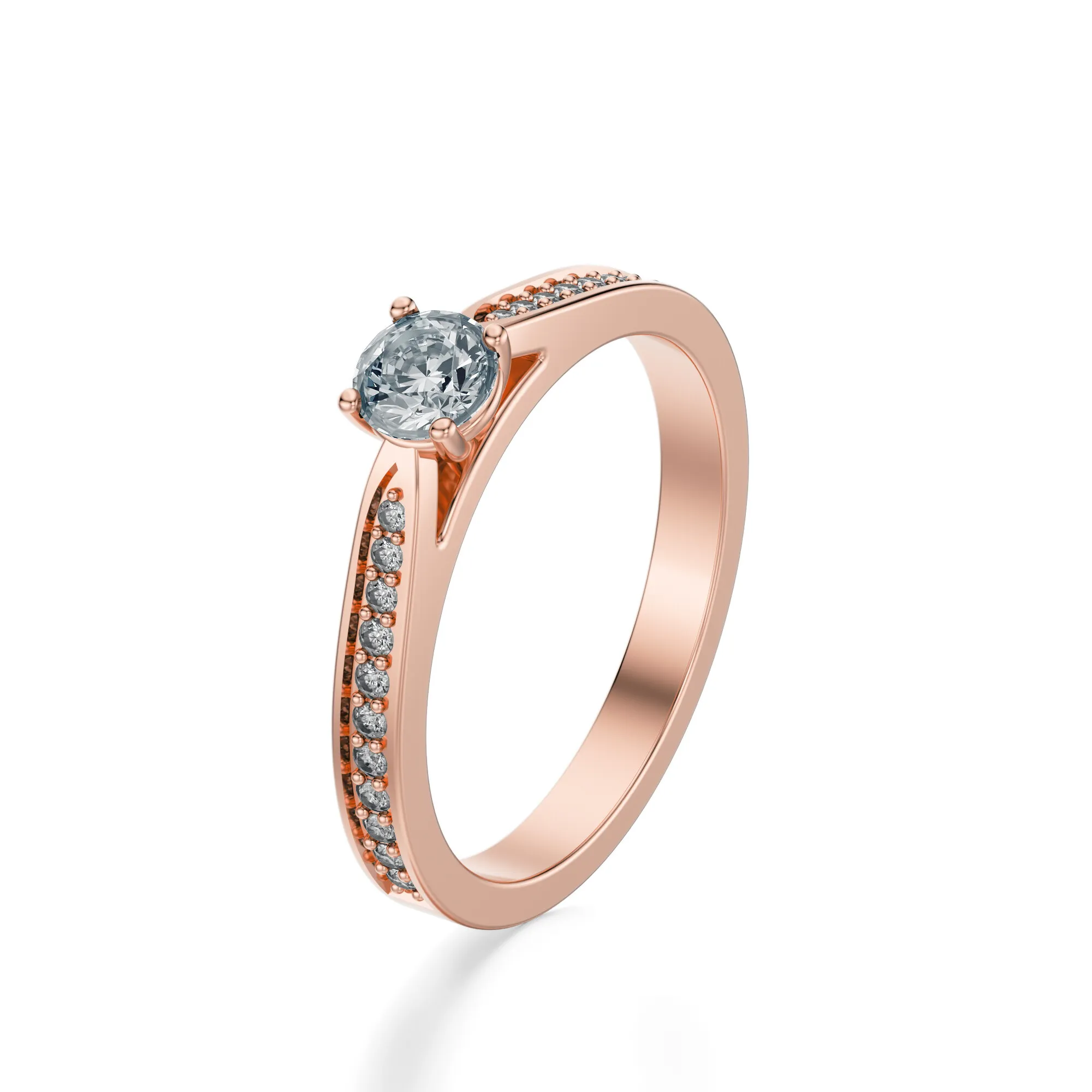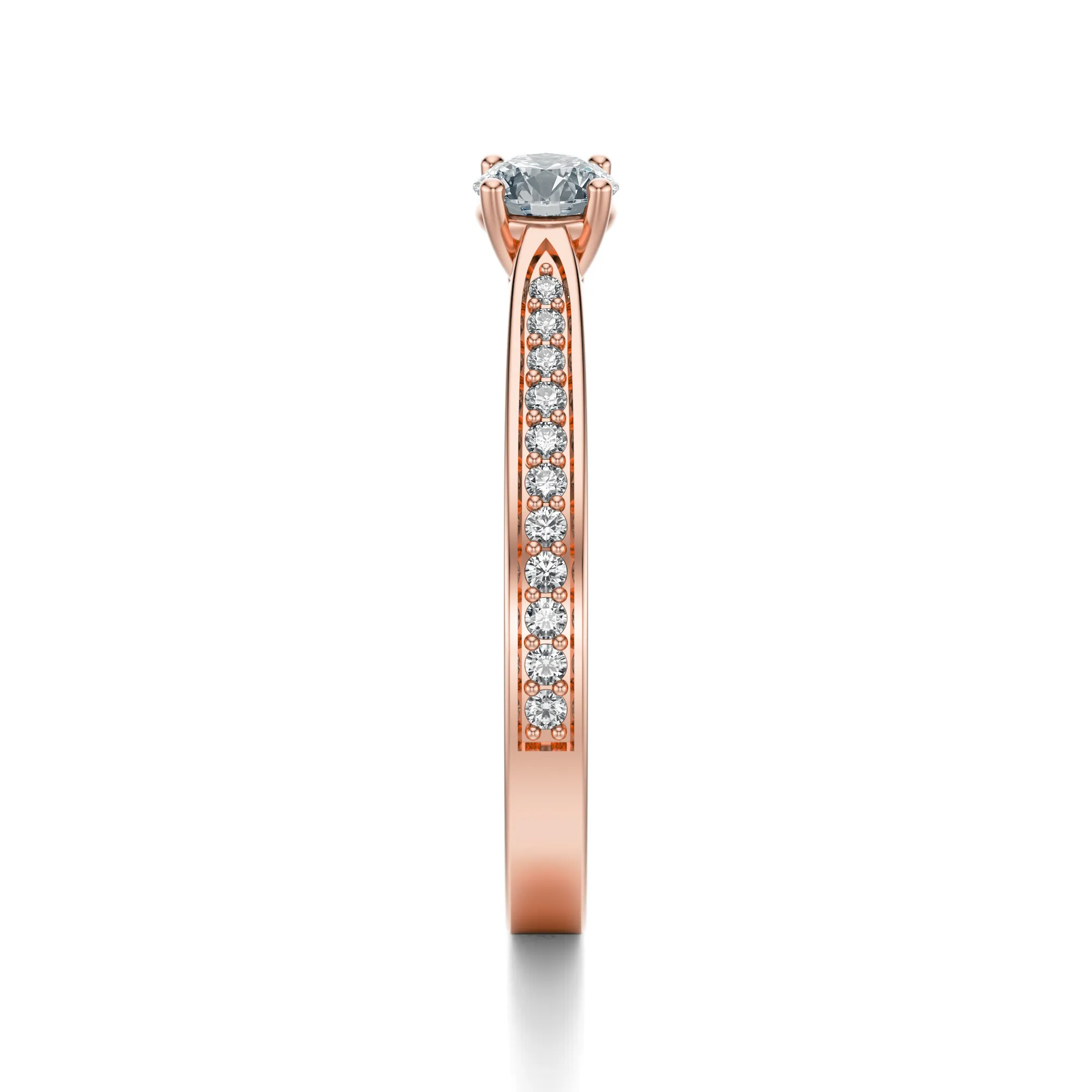 Smukła obrączka została ozdobiona dodatkowymi, drobnymi diamentami biegnącymi wzdłuż boków, co nadaje pierścionkowi lekkości i wyraźnej, biżuteryjnej głębi. Układ kamieni nadaje mu nowoczesny charakter, a różowe złoto wprowadza romantyczny, pełen ciepła ton. To idealny wybór dla osób, które cenią subtelną elegancję z wyrazistym akcentem. Diamenty symbolizują trwałość i czystość uczuć, a w połączeniu z różowym złotem tworzą biżuterię, która opowiada historię miłości i emocji. Doskonale sprawdzi się jako pierścionek zaręczynowy, prezent na rocznicę lub upamiętnienie innego ważnego wydarzenia.