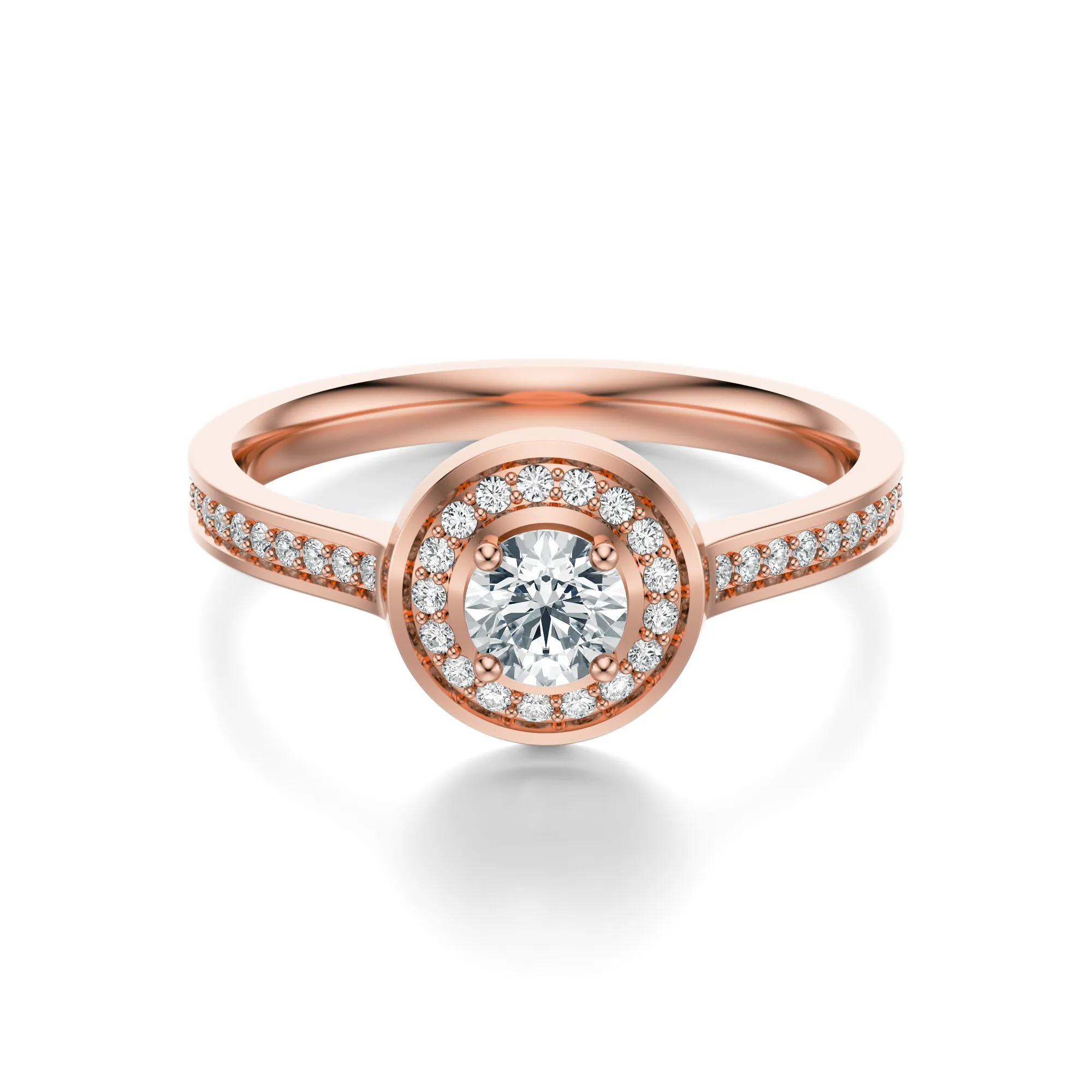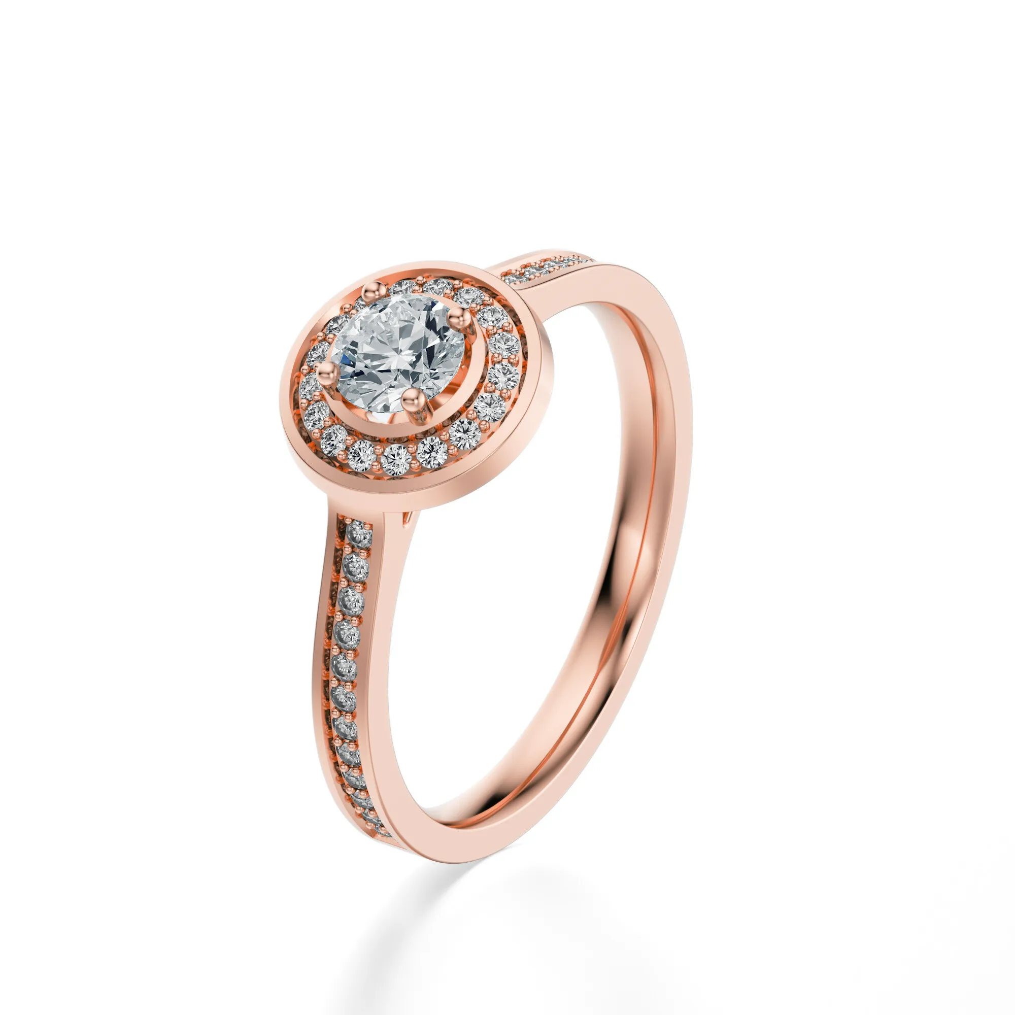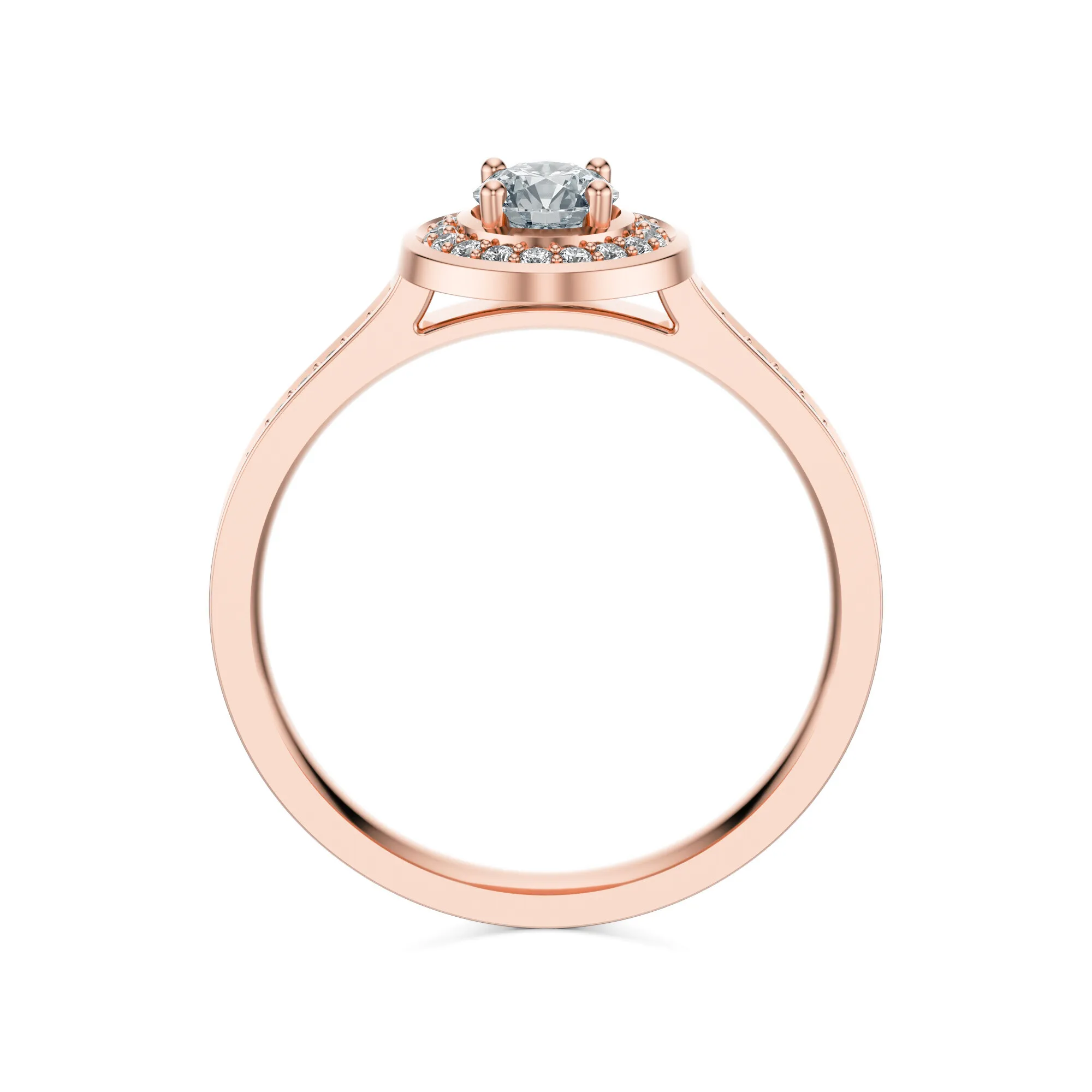 Zachwycający pierścionek wykonany ze złota o próbie 585 w odcieniu delikatnego różu to esencja romantyzmu i wyrafinowania. Jego głównym akcentem jest perfekcyjnie oszlifowany, okrągły diament, otoczony ażurową aureolą z mniejszych kamieni, które wspólnie tworzą niezwykle świetlistą kompozycję. Uzupełnieniem całości jest subtelnie zdobiona obrączka, która lśni dzięki dodatkowemu rzędowi drobnych diamentów.
